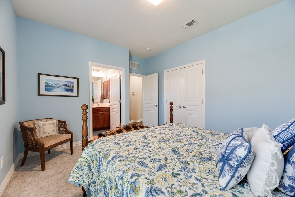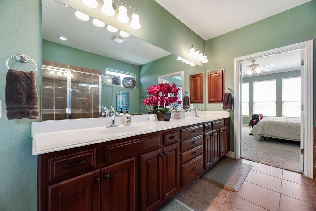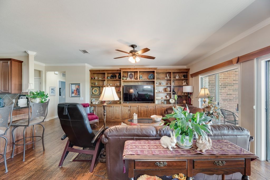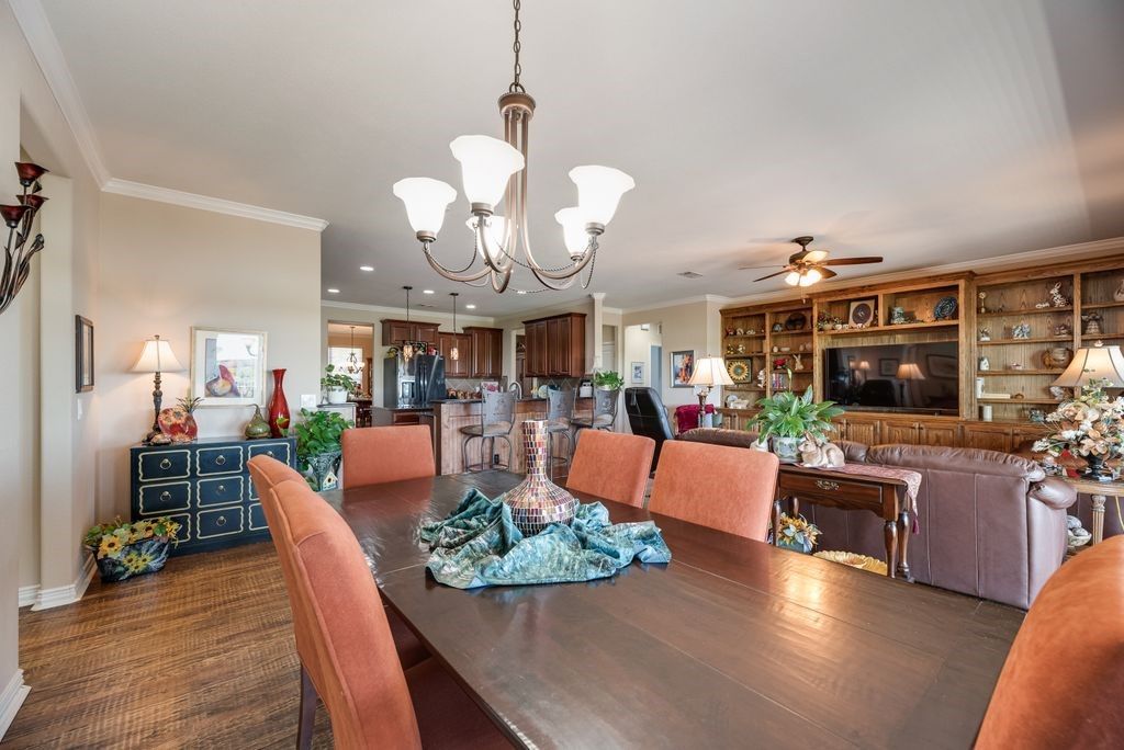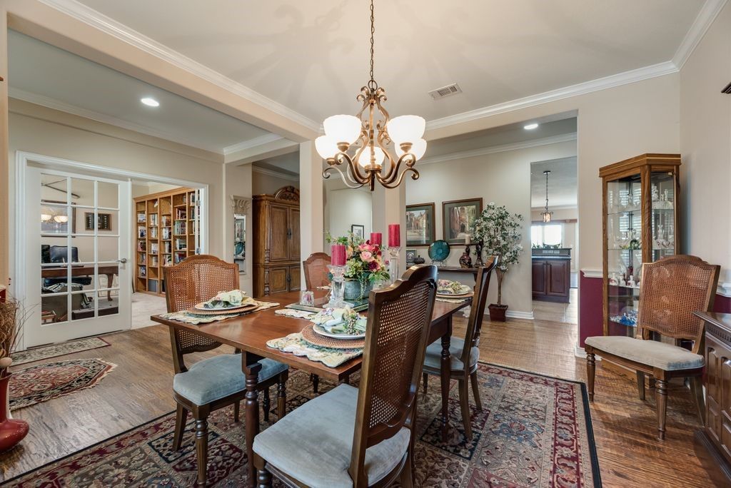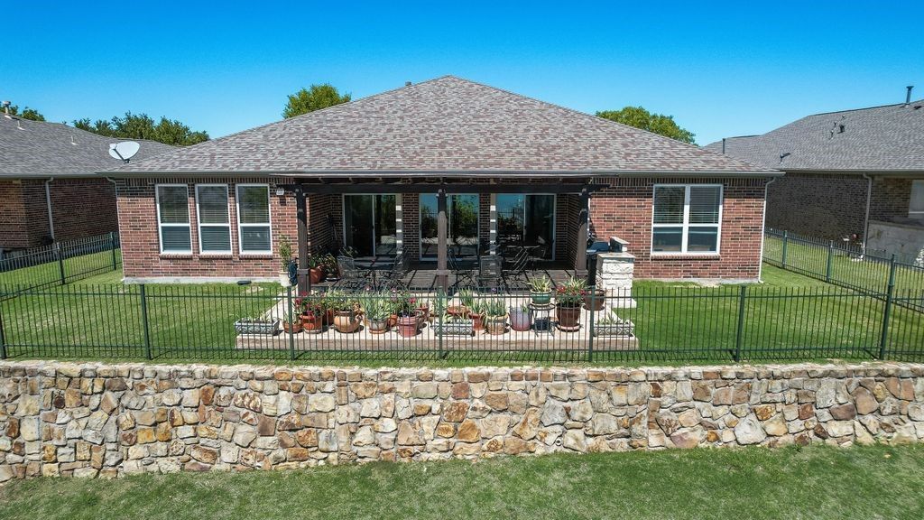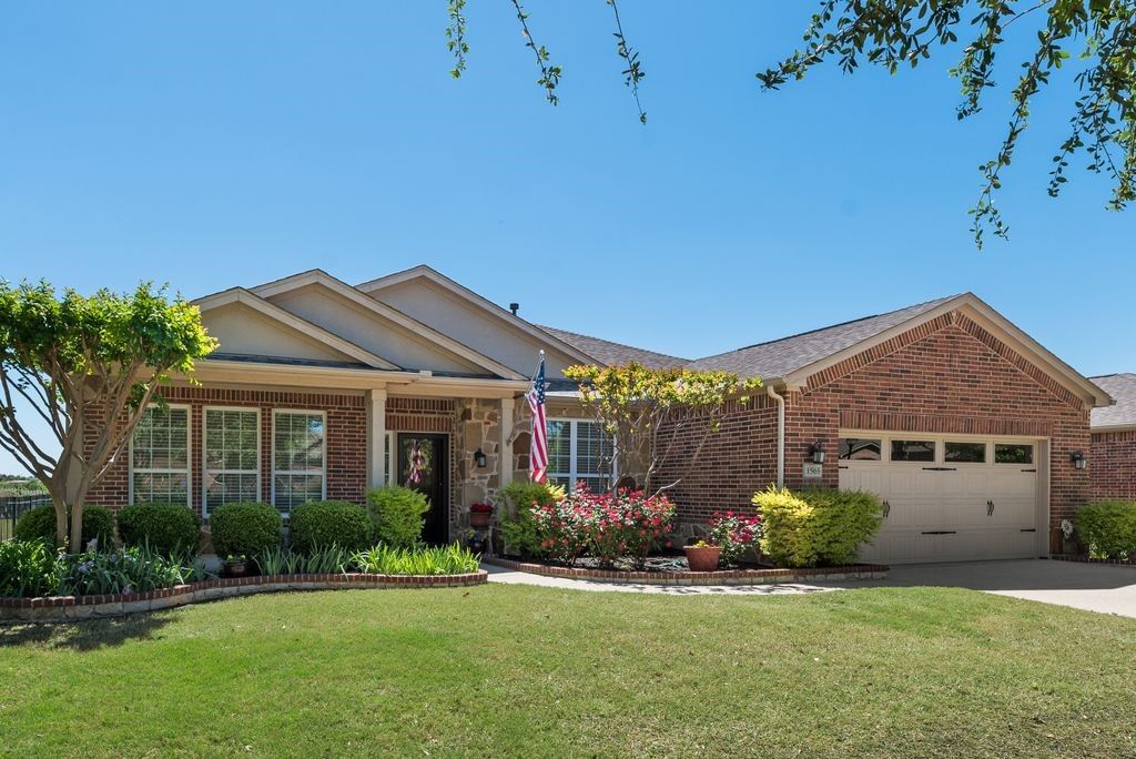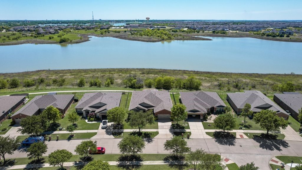 Welcome home - the Morningside floor plan on a premier lake-view lot in coveted Frisco Lakes active adult community. This is more than a house. It’s a place to simplify your life, build memories, and enjoy the rewards of a maintenance - light lifestyle in one of the community’s best homes. You’ll love the gourmet kitchen. 42-inch Nottingham Cherry cabinets, oversized center island, granite counters, gas cooktop, breakfast bar, butler’s pantry and a huge walk-in pantry - perfect for casual mornings or entertaining friends. The oversized tandem 4 garage gives you room for a workshop, golf cart or extra storage. The primary suite is a calm retreat with nature views, plush carpeting and a spa-like bath with glass shower, garden tub, dual vanities and a generous walk-in closet. A private guest wing features two large bedrooms, each with en-suite baths and walk-in closets - comfortable and convenient for family or visitors. Additional thoughtful touches include a study, elegant dining room, hardwood floors, plantation shutters, a large laundry with sink, and a dramatic built-in shelving wall in the living room. Outside is your personal oasis. lake views, lush landscaping, covered patio with built-in grill and expansive yard - ideal for outdoor living, pets and play. The welcoming front porch completes the picture. Frisco Lakes offers resort-style living. 18-hole championship golf, three clubhouses, three fitness centers, indoor, outdoor pools and spas, pickleball and tennis, miles of trails and a full social calendar to keep you engaged and connected. A remarkable floor plan, one of the finest lots in the community, and thoughtful upgrades throughout - this home is an opportunity to simplify your life and maximize your enjoyment. Lets schedule a tour and see how this one checks all your boxes.