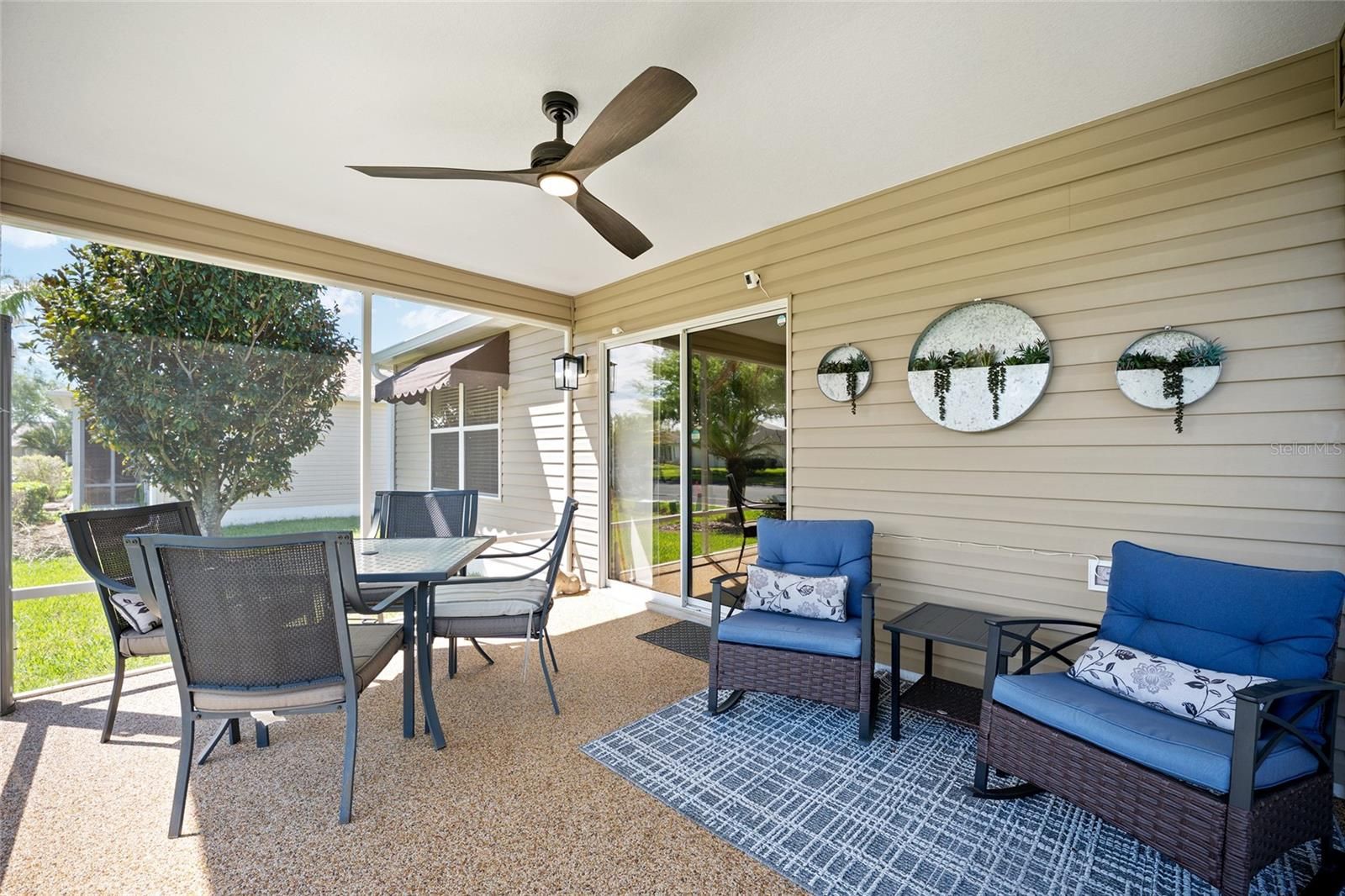 Welcome to this meticulously maintained, lightly lived-in 3-bedroom, 2-bath Corpus Christi model located in the highly desirable Village of Sunset Pointe. Offering excellent curb appeal and a BOND PAID, this home features a freshly painted, expanded driveway and a prime central location. Inside, the open split floor plan is enhanced by vaulted ceilings, ceramic tile flooring in the main living areas, and three solar tubes that provide abundant natural light. The home is being offered furnished, making it truly move-in ready. The updated kitchen features granite countertops, gas cooking, under cabinet lighting, white appliances, and a tasteful tile backsplash—perfect for both everyday living and entertaining. The spacious primary suite includes a custom walk-in closet and an en-suite bath with an upgraded shower and granite countertops. A pocket door creates privacy for the guest wing, which includes two bedrooms and a shared bathroom. One guest room is thoughtfully designed with a built-in Murphy bed and desk, offering flexible use as a home office or additional sleeping space. Enjoy added privacy with no rear neighbors while relaxing on the back lanai featuring Chattahoochee rock flooring. Additional upgrades include a new roof (2025), on-demand water heater, new rain gutters, Nova filtration system with water softener, whole-home surge protector, solar attic fan, and a remote-controlled garage screen. Ideally located just minutes from Cane Garden Country Club, Lake Sumter Landing Market Square, shopping, dining, medical facilities, and numerous golf courses—this home offers the perfect blend of comfort, convenience, and lifestyle.