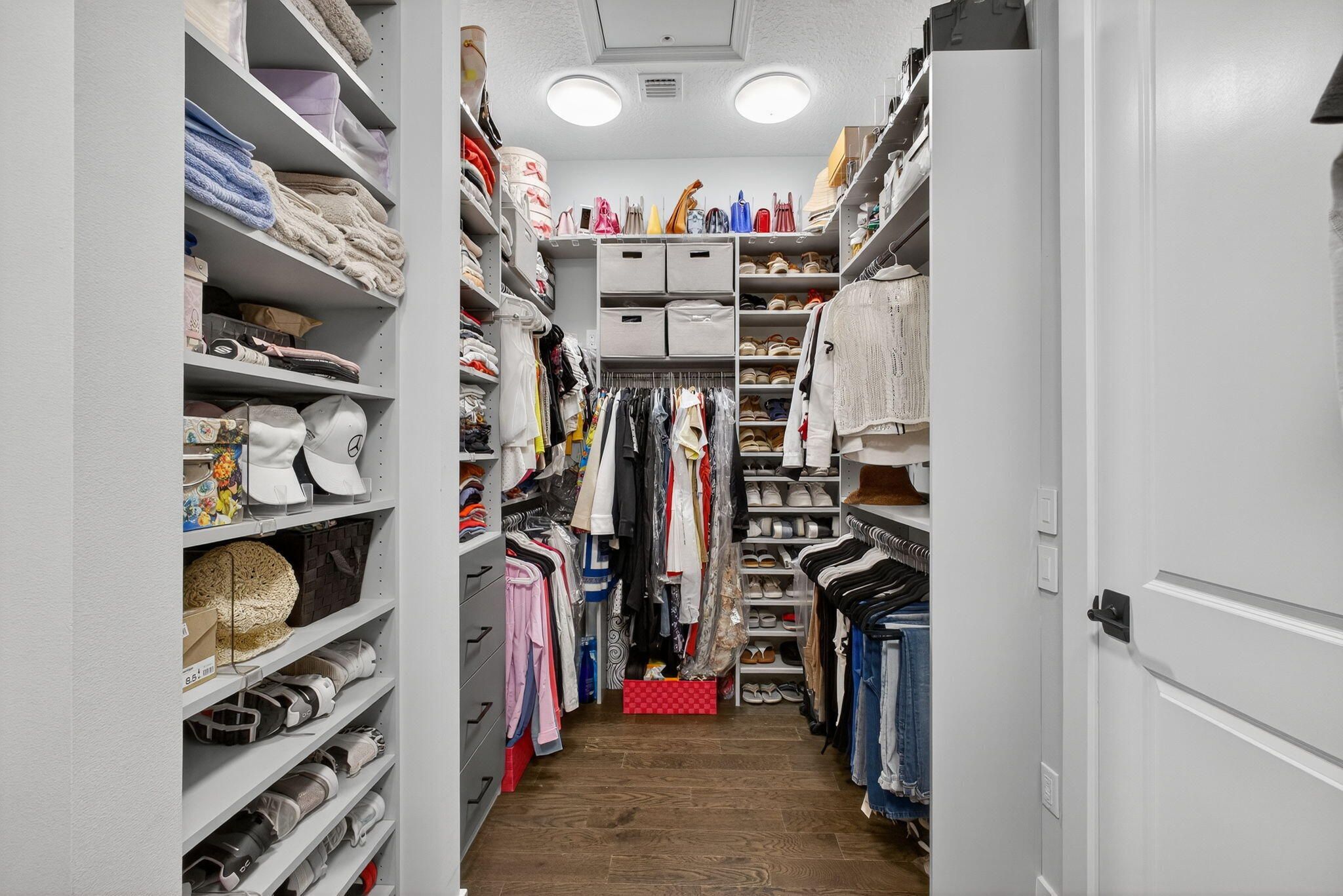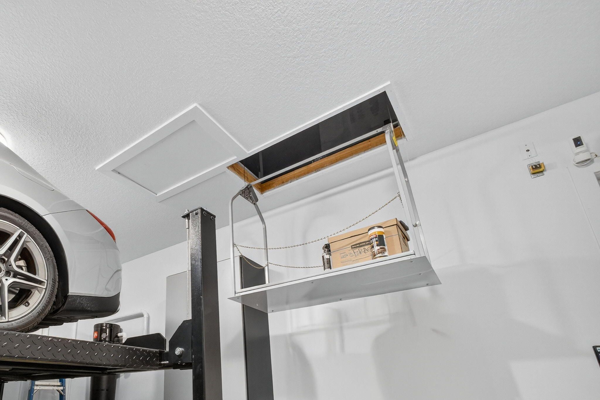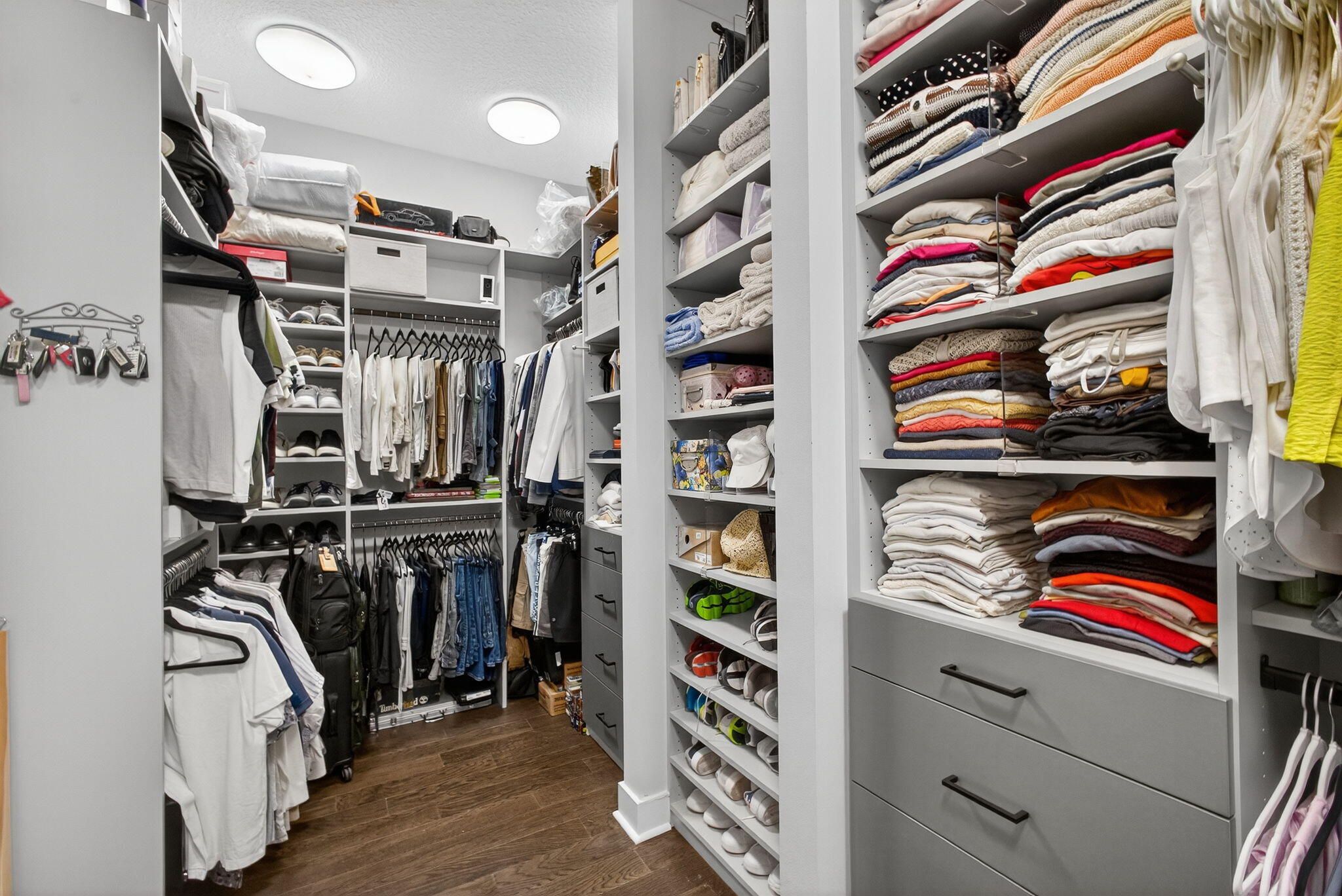 - Built-in Features, Cathedral Ceiling(s), Central Vacuum, Pantry, Vaulted Ceiling(s), Walk-In Closet(s), Custom Mirrors, Pull Down Attic Stairs, Upper Level Living Area, Storage, Impact Glass, Living/Dining Room, Eat-in Kitchen, Dual Sinks, Main Level Primary