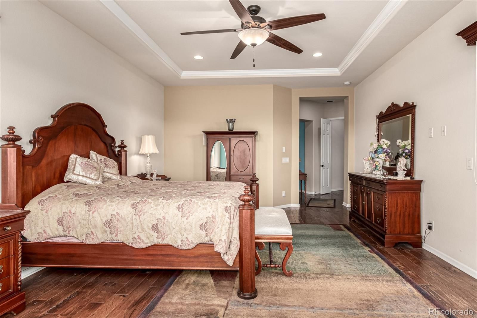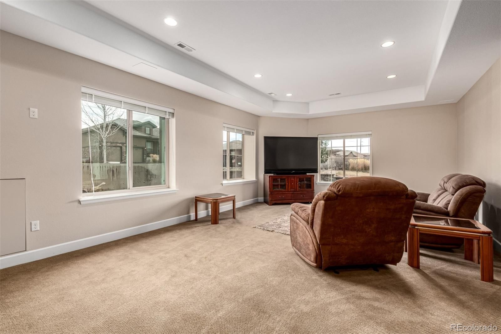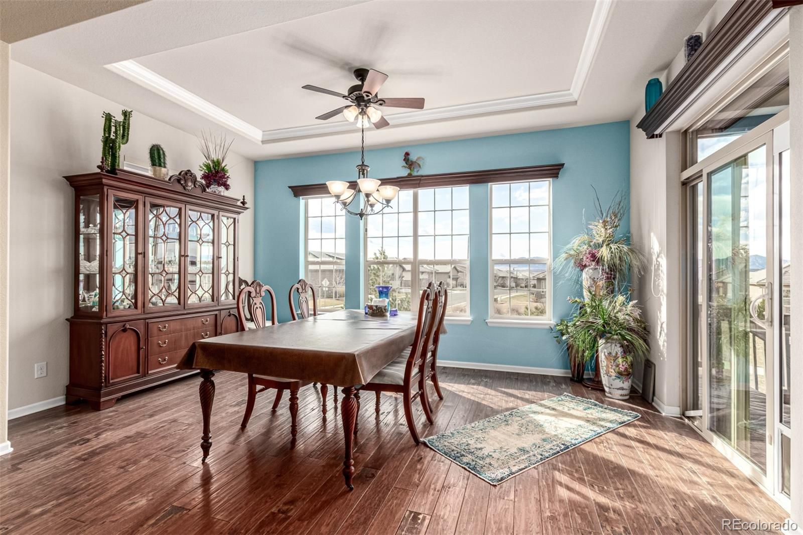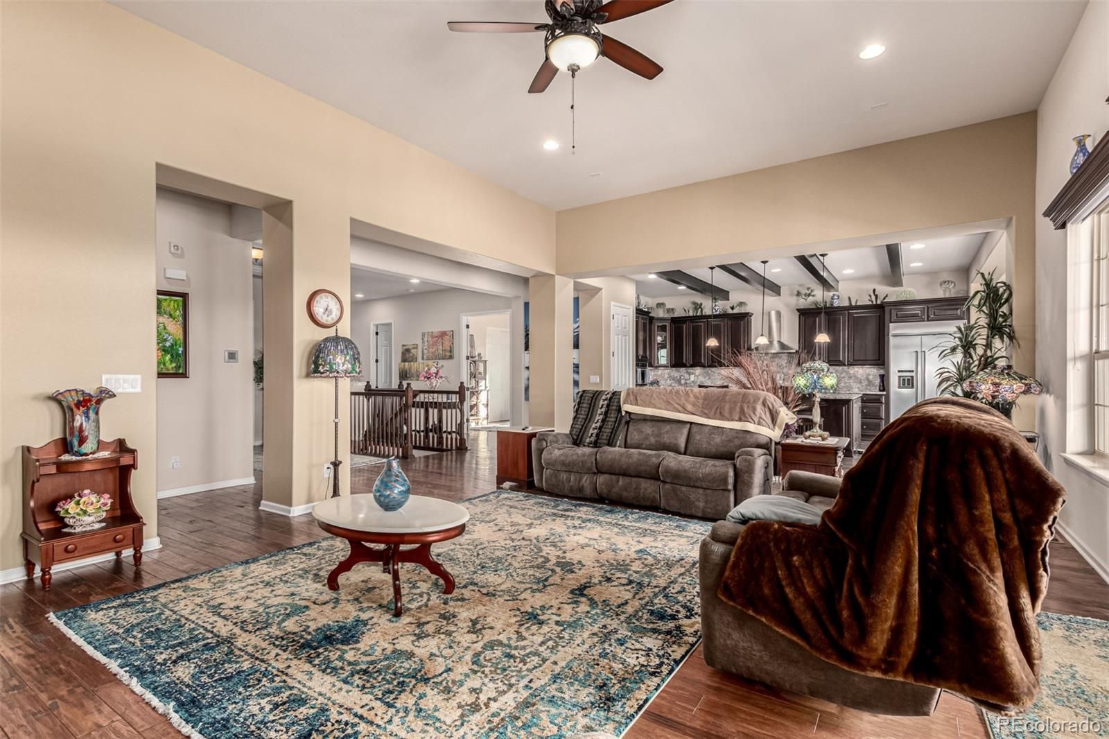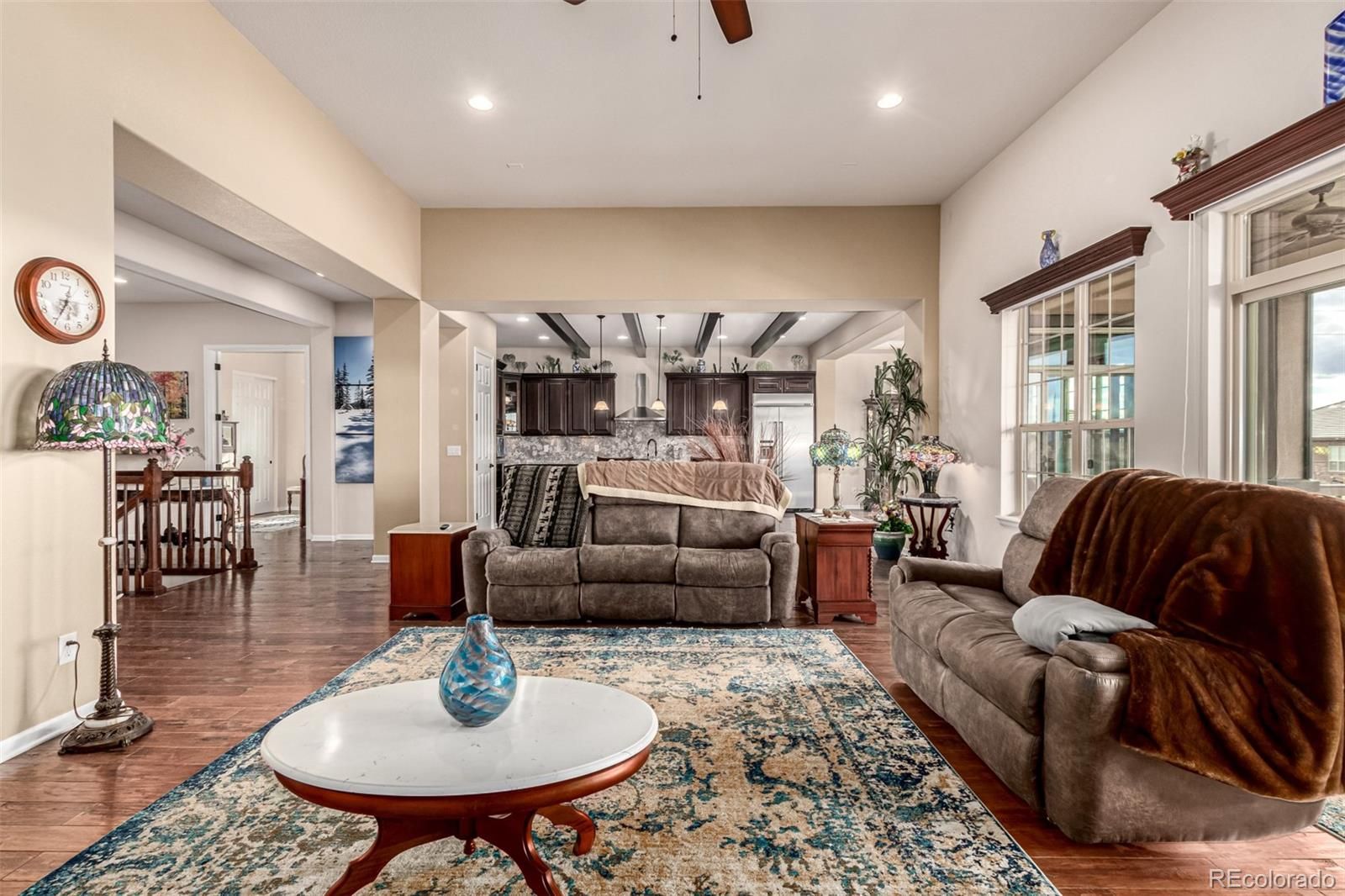 Rare opportunity to own a sought after Toll Brothers Montana Model — a spacious ranch layout with walk out basement on corner view lot! This remarkable 3-bedroom, 4-bath home showcases the largest main-floor plan in this 55 plus community and offers exceptional design, craftsmanship, and livability. Step inside to find rich hardwood flooring, spacious rooms with tall beamed ceilings, and abundant natural light throughout. The gourmet kitchen impresses with a large center granite island featuring upgraded solid wood cabinetry with soft-close drawers, rollouts, a premium vent hood, and high-end stainless appliances — all included along with the island stools. Enjoy casual meals in the sunny eat-in nook or host gatherings in the formal dining room. The spacious family room, accented by wood beams and upgraded lighting, opens to a covered deck that offers panoramic mountain views. The luxurious main-floor primary suite and convenient main-level office make everyday living effortless. The finished walkout basement offers you the opportunity to customize to your needs and features a huge recreation and game area or family area, two large bedrooms, bath with walk in shower and a generous storage space. Additional highlights include a structural basement floor, large 3-car garage, xeriscaped front yard, stamped concrete walkway, upgraded window coverings and drapes, and a full laundry area with washer, dryer and utility sink. Premier 55 plus community with rec center, walking trails and ponds. Its like living in a resort, easy commute to Boulder, Erie or Denver.