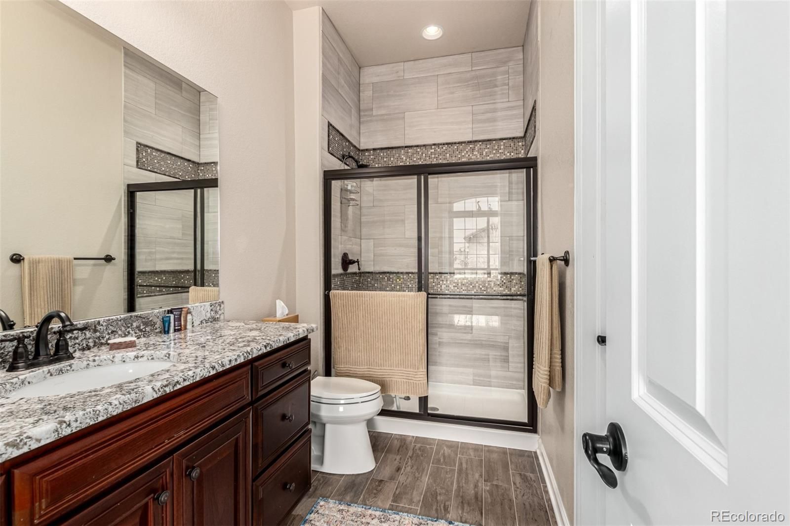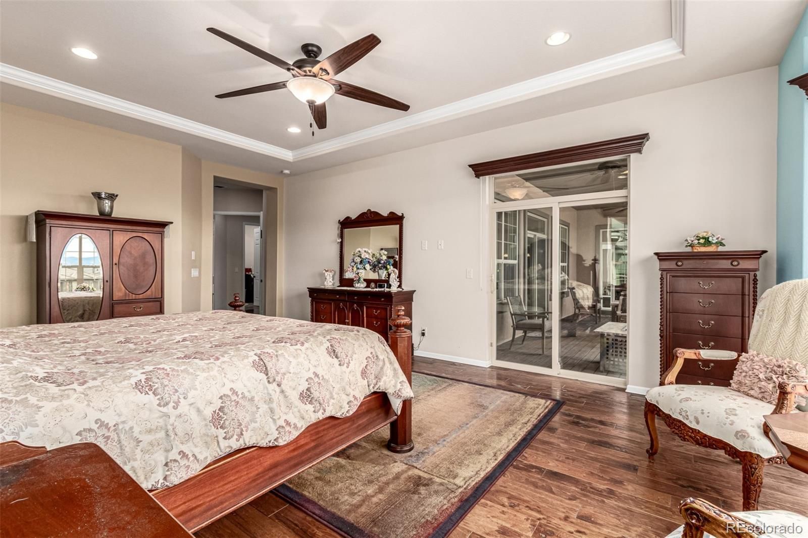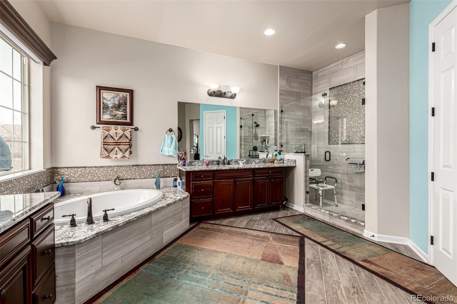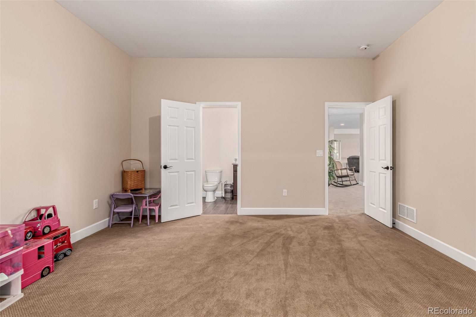 Rare opportunity to own a sought after Toll Brothers Montana Model — a spacious ranch layout with walk out basement on corner view lot! This remarkable 3-bedroom, 4-bath home showcases the largest main-floor plan in this 55 plus community and offers exceptional design, craftsmanship, and livability. Step inside to find rich hardwood flooring, spacious rooms with tall beamed ceilings, and abundant natural light throughout. The gourmet kitchen impresses with a large center granite island featuring upgraded solid wood cabinetry with soft-close drawers, rollouts, a premium vent hood, and high-end stainless appliances — all included along with the island stools. Enjoy casual meals in the sunny eat-in nook or host gatherings in the formal dining room. The spacious family room, accented by wood beams and upgraded lighting, opens to a covered deck that offers panoramic mountain views. The luxurious main-floor primary suite and convenient main-level office make everyday living effortless. The finished walkout basement offers you the opportunity to customize to your needs and features a huge recreation and game area or family area, two large bedrooms, bath with walk in shower and a generous storage space. Additional highlights include a structural basement floor, large 3-car garage, xeriscaped front yard, stamped concrete walkway, upgraded window coverings and drapes, and a full laundry area with washer, dryer and utility sink. Premier 55 plus community with rec center, walking trails and ponds. Its like living in a resort, easy commute to Boulder, Erie or Denver.