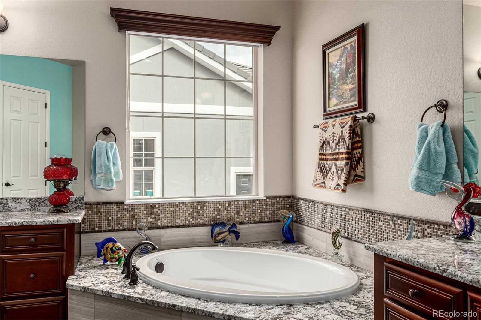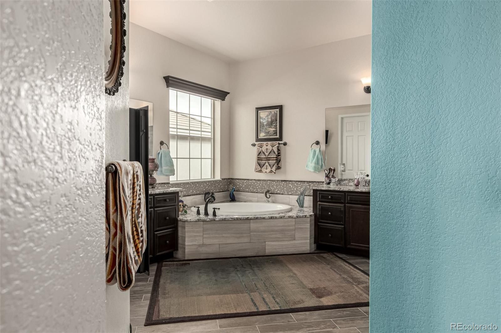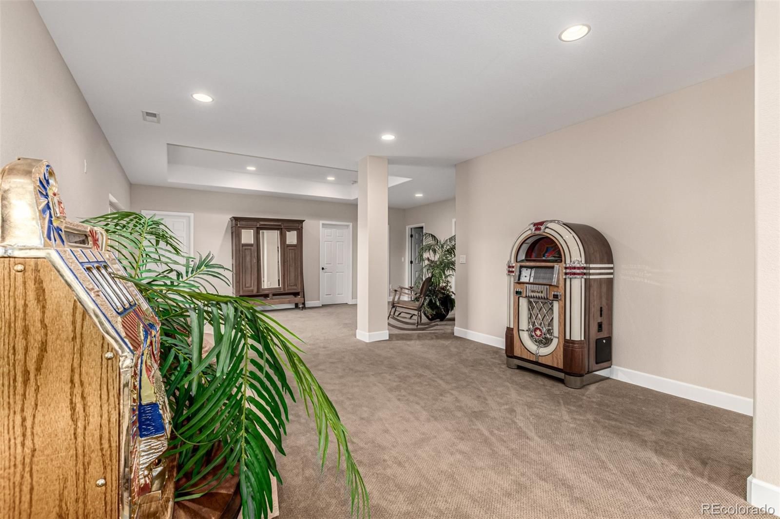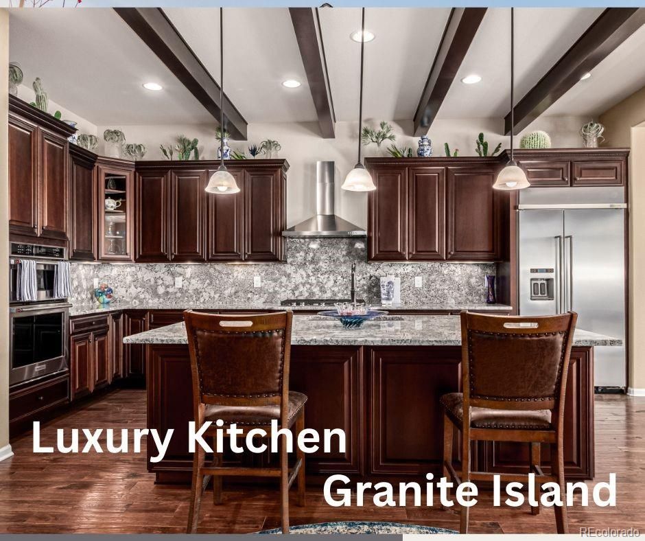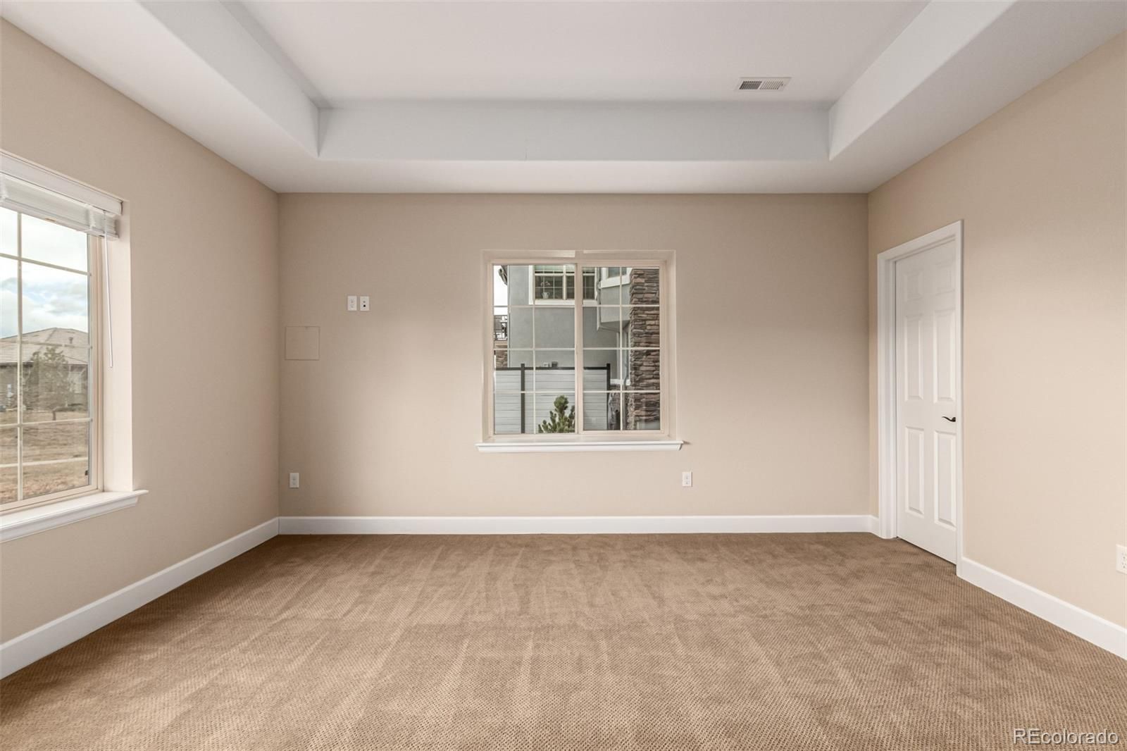 Rare opportunity to own a sought after Toll Brothers Montana Model — a spacious ranch layout with walk out basement on corner view lot! This remarkable 3-bedroom, 4-bath home showcases the largest main-floor plan in this 55 plus community and offers exceptional design, craftsmanship, and livability. Step inside to find rich hardwood flooring, spacious rooms with tall beamed ceilings, and abundant natural light throughout. The gourmet kitchen impresses with a large center granite island featuring upgraded solid wood cabinetry with soft-close drawers, rollouts, a premium vent hood, and high-end stainless appliances — all included along with the island stools. Enjoy casual meals in the sunny eat-in nook or host gatherings in the formal dining room. The spacious family room, accented by wood beams and upgraded lighting, opens to a covered deck that offers panoramic mountain views. The luxurious main-floor primary suite and convenient main-level office make everyday living effortless. The finished walkout basement offers you the opportunity to customize to your needs and features a huge recreation and game area or family area, two large bedrooms, bath with walk in shower and a generous storage space. Additional highlights include a structural basement floor, large 3-car garage, xeriscaped front yard, stamped concrete walkway, upgraded window coverings and drapes, and a full laundry area with washer, dryer and utility sink. Premier 55 plus community with rec center, walking trails and ponds. Its like living in a resort, easy commute to Boulder, Erie or Denver.