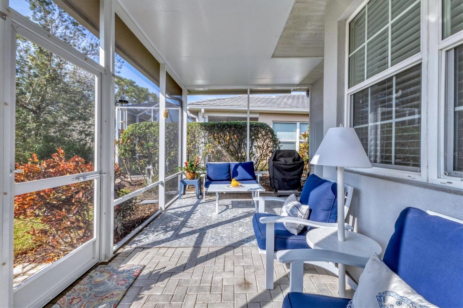 One or more photo(s) has been virtually staged. PRICE IMPROVEMENT! This Charming 3-bedroom/2.5 bathroom Patio Home located in the desirable Buckingham Meadows neighborhood in St Andrews East has been meticulously maintained and offers a wonderful blend of comfort and functionality with a light and bright ambiance and popular floor plan - The Eaton II. As you approach the home, you are greeted by a lovely screened lanai. Walk inside to a spacious, open layout filled with natural light creating a warm and welcoming atmosphere throughout. The den is just off the front foyer providing flexible space for an office or can be used as the 3rd bedroom. The kitchen features white cabinetry, an eat-in breakfast area with plenty of extra storage space, complemented by an inside laundry room. The large living room has crown molding. The cozy Florida room offers a peaceful retreat for reading or just watching tv and it opens up to an expanded screened lanai perfect for outdoor entertaining or grilling and overlooks a tranquil, peaceful, wooded setting. The expansive garage includes convenient wall storage cabinets for added organization. No CDD Fee, This Home is Storm Ready with HURRICANE IMPACT WINDOWS and a Hurricane Shutter on the sliding doors for peace of mind. Enjoy the benefits of 2 community pools for relaxation and recreation. The prestigious Plantation Golf and Country Club offers several membership options though membership is not mandatory. The community is home to two 18-hole golf courses and offers reciprocal privileges with other courses in the off season. With easy access to local beaches, the Wellen Park Town Center, Atlanta Braves Stadium and Historic Downtown Venice, which offers dining, shopping and entertainment options, this home offers the ideal blend of comfort the perfect combination of convenience and location.