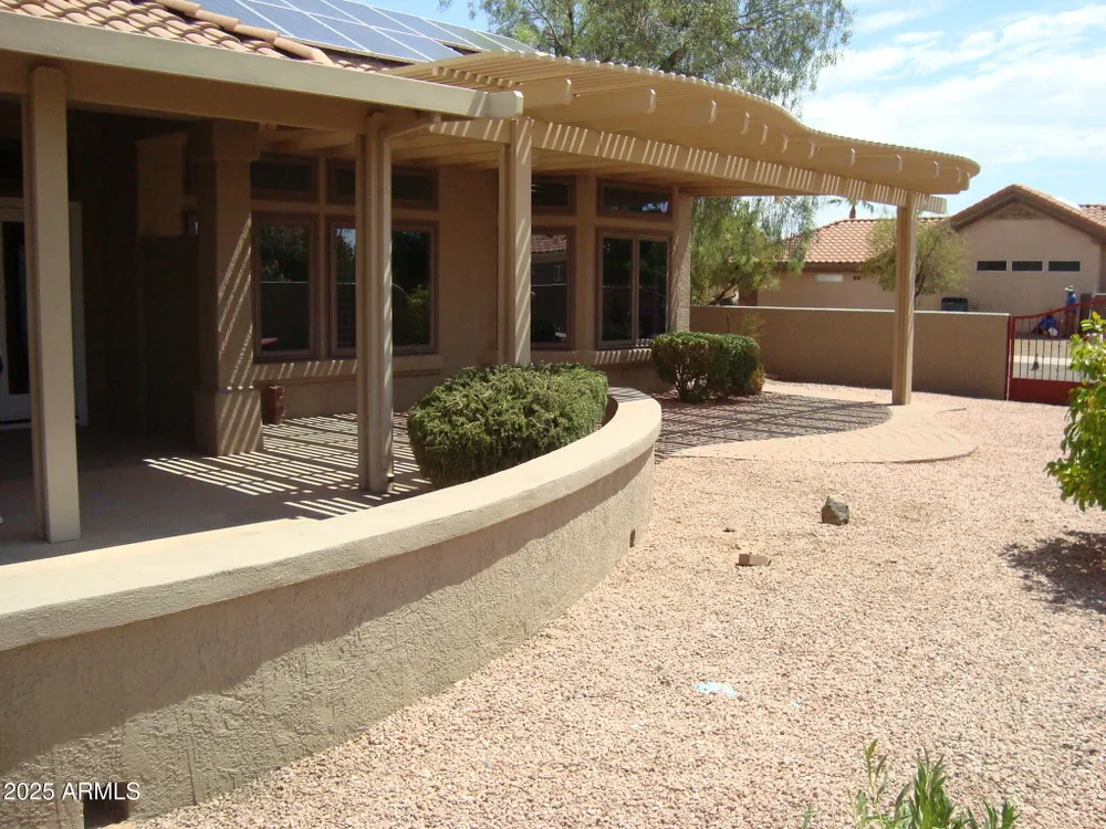 Beautifully updated Ventana! Kitchen has granite counter tops with tile backsplash, finished off with all stainless-steel appliances. The Master bath has been upgraded with a large roll in tile shower and dual sinks. Guest room has its own en-suite so can be used as a second master. Both baths have raised toilets. A half bath has been conveniently located by the kitchen and family room. Tile flooring through out the home with carpet in the bedrooms. Newly painted inside and out. You will love the expanded back patio. Home is on a large, low traffic, corner lot with a side yard double sized gate. Underlayment on roof, 2012. OWNED SOLAR and Anderson windows thru out tops off this wonderful home! THIS IS A MUST-SEE HOME!
