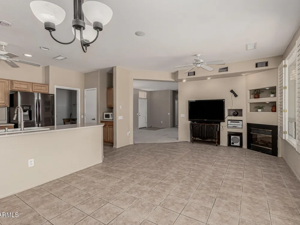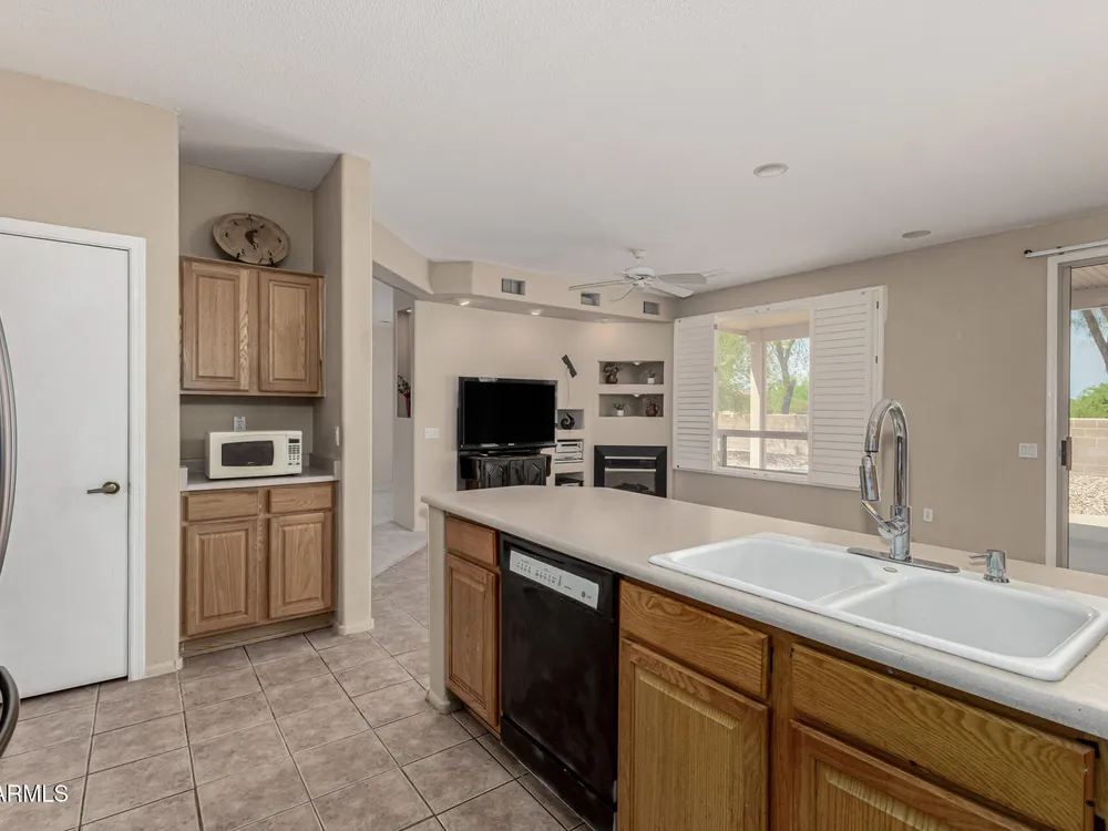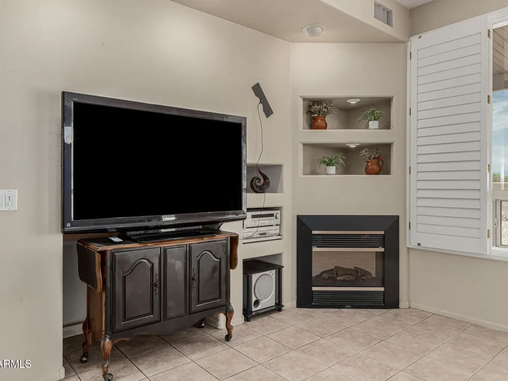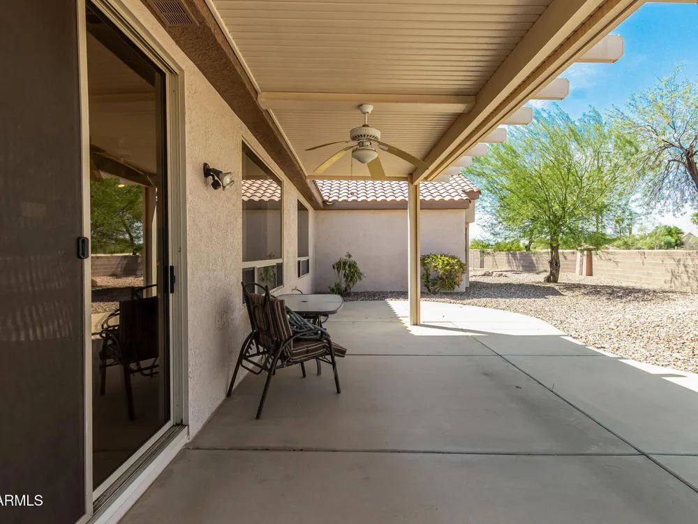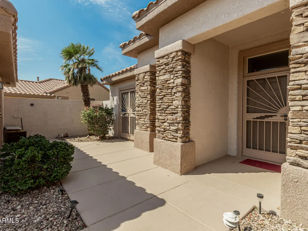 Discover this charming 3-bedroom home in Sun City Grand! All the space you need 3 bedrooms, 3 bathrooms & a 2-car garage with attached storage! Inside, you'll find spacious and bright living areas showcasing tile flooring, carpet in all the right places, plantation shutters, and neutral paint throughout. The family room features a fireplace and surround system, making it perfect for cozy movie nights. The impeccable kitchen boasts oak cabinetry, a peninsula, and built-in appliances for a seamless cooking experience. The primary bedroom has a lovely bay window, a bathroom with double sinks, and a closet. The third bedroom is ideal for guests or an office, as it has a separate exit and a built-in desk with shelves. The backyard is complete with a covered patio perfect for quiet evenings and weekend grills, and a low-care landscape for easy living! Come see it before it's too late!