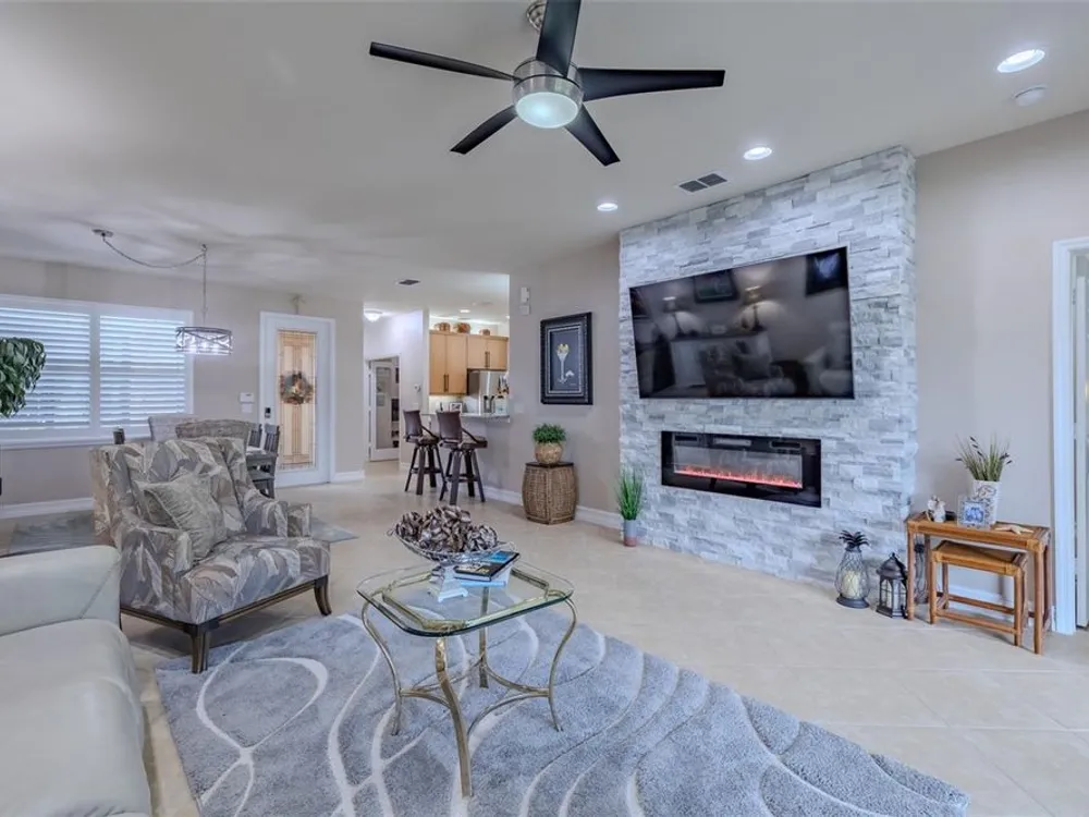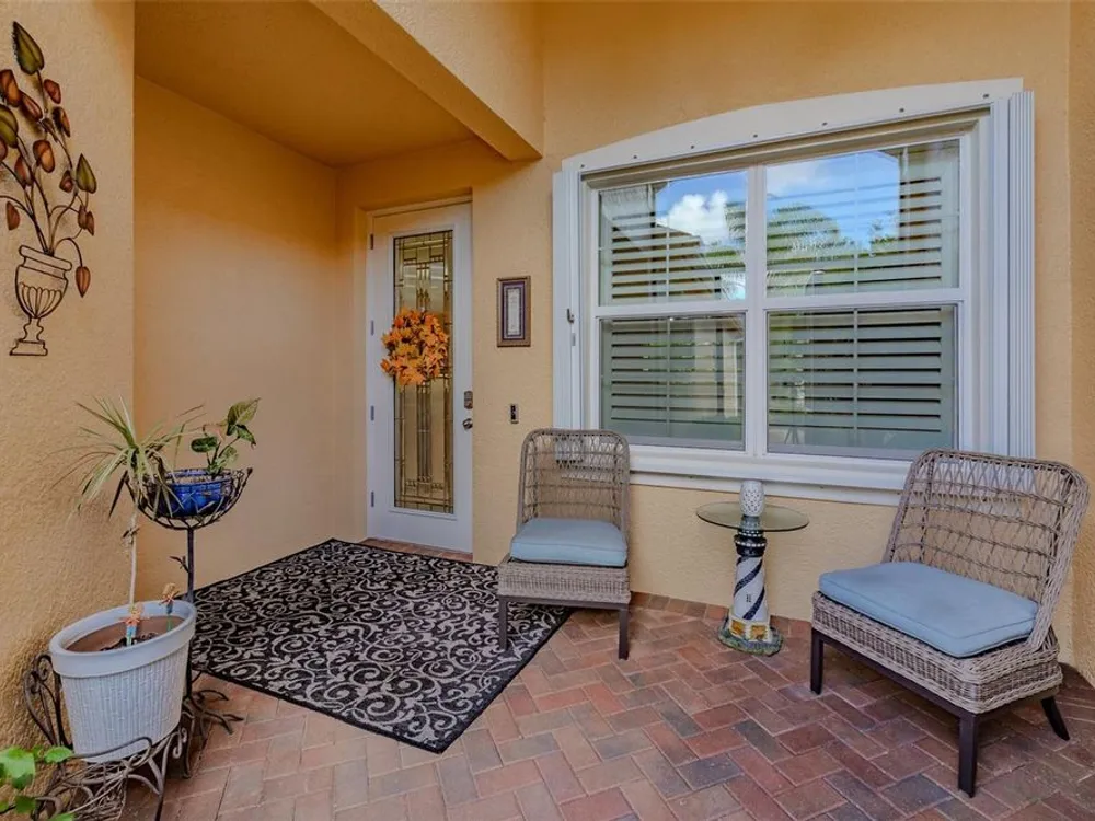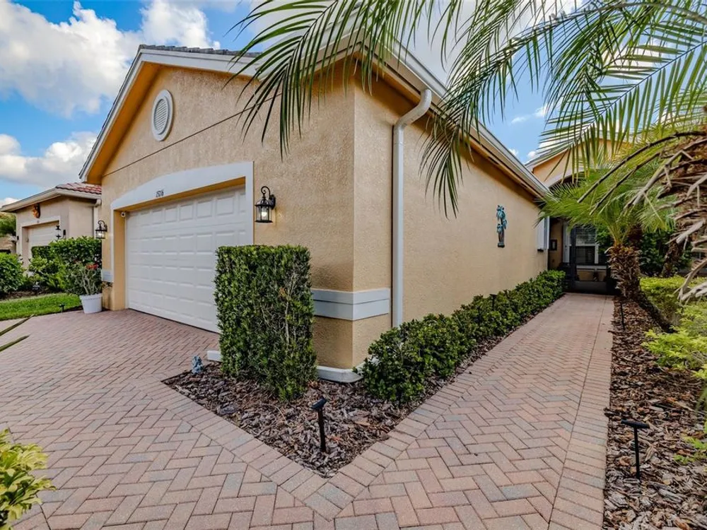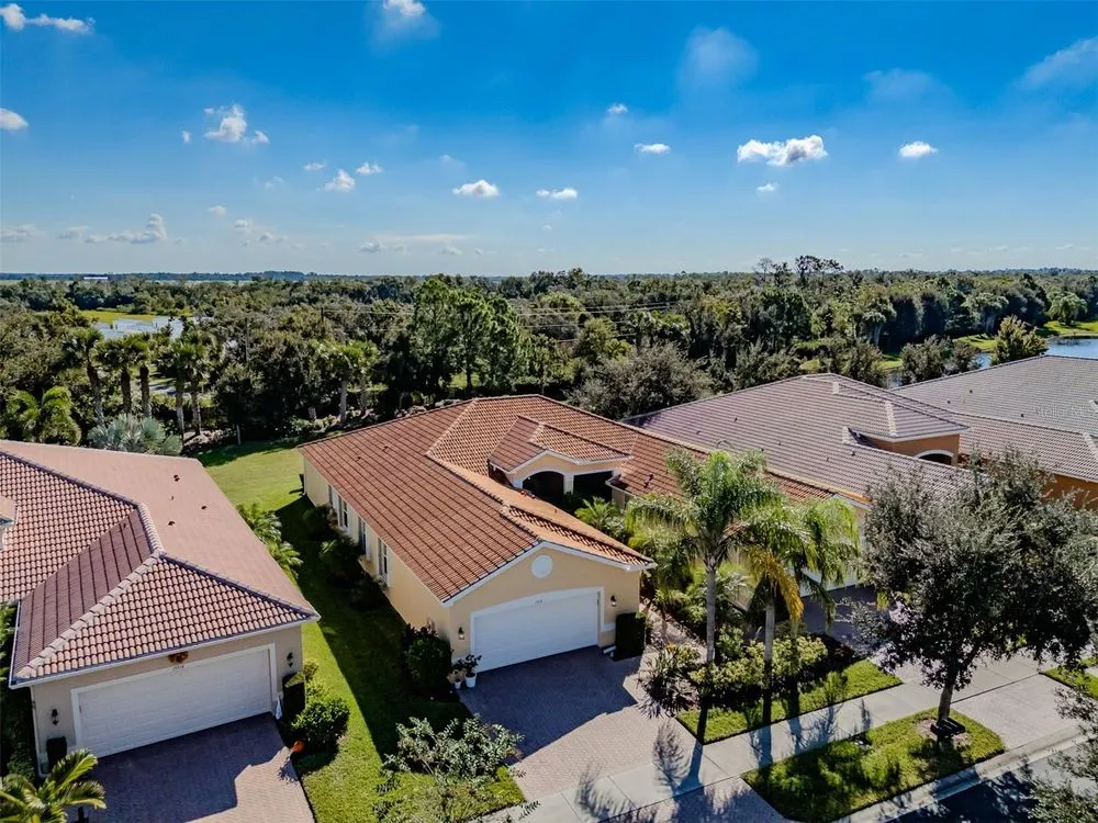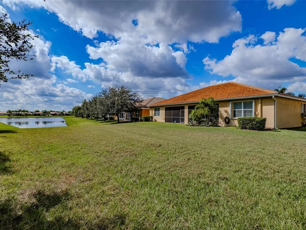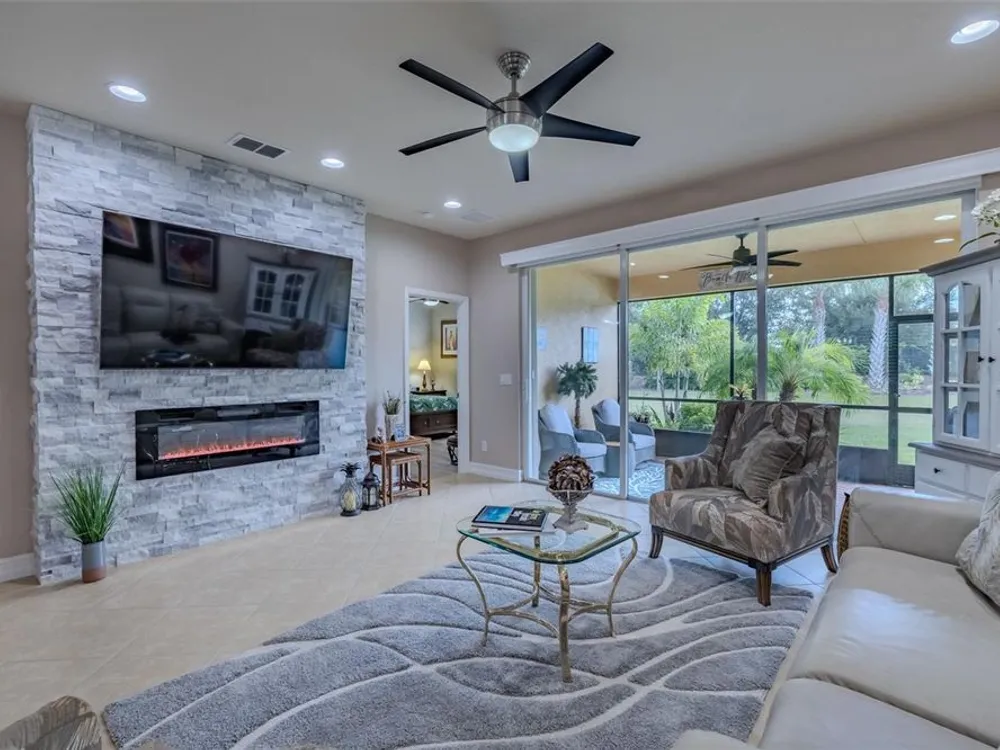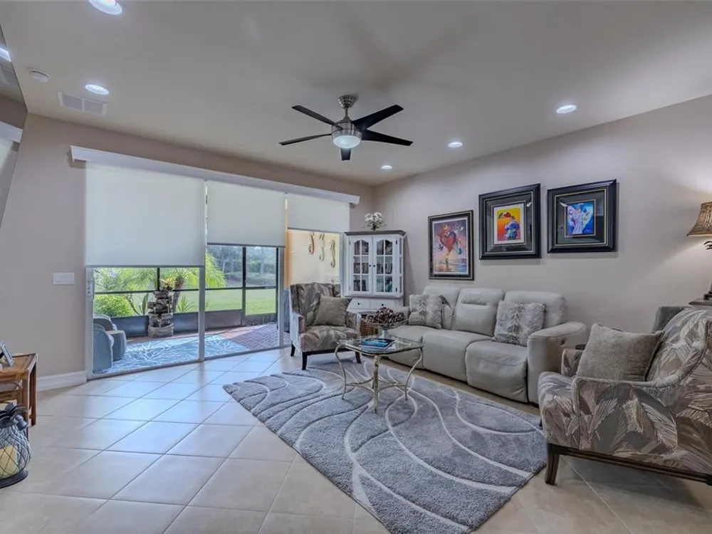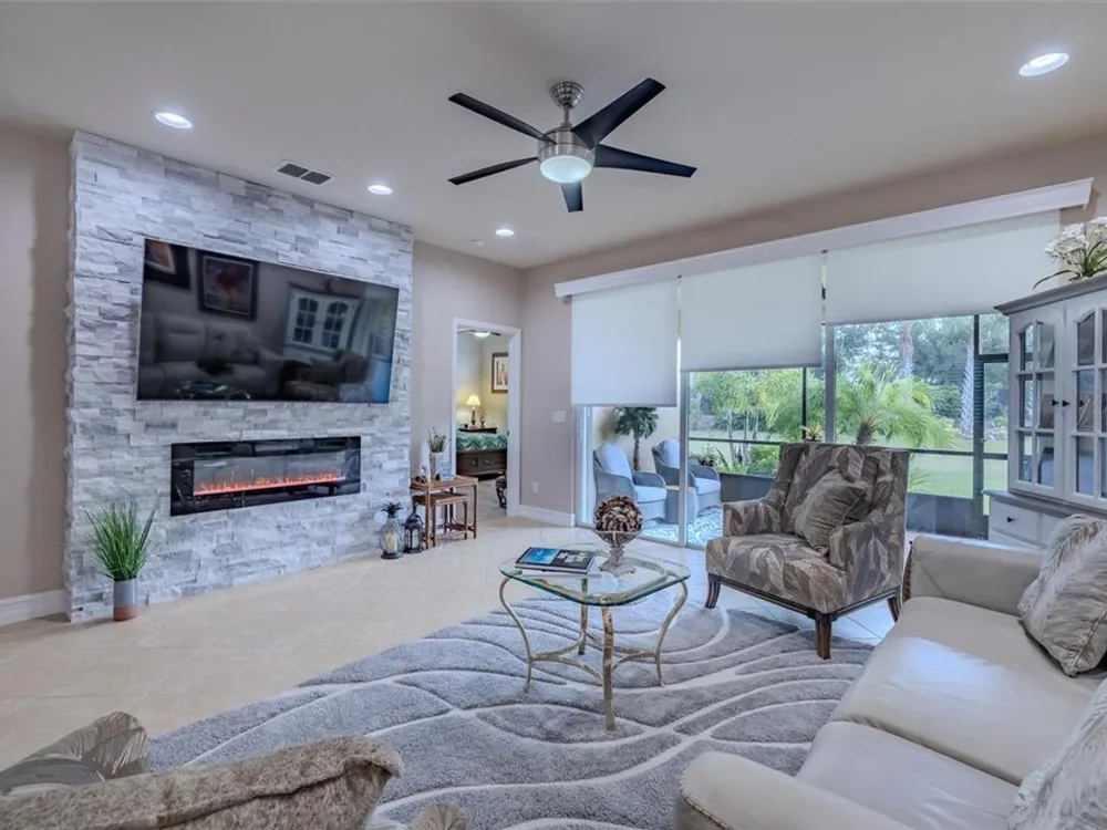 Within the 1709 SF of this VICTORIA model villa, you will find 3 bedrooms, 2 bathrooms, a kitchen with dinette, dining room, great room, and a wonderful lanai. A screened-in front porch affords a tranquil space to enjoy some treasured free time. The full-length decorative glass front door imparts style and distinction and provides a beautiful welcome into the open floorplan of the home. Impeccable 17’x17” ceramic tile on the diagonal graces the common area floors and plantation shutters will be found throughout the home. The dining room features a KICHLER Stetton 3 light Anvil Iron Farmhouse chandelier, a large window overlooking the porch, a commanding view of the open floorplan and it will comfortably accommodate 8 persons. Left of the dining room is a gourmet kitchen with a breakfast bar, 42” solid maple cabinets in a NORDIC style, with soft close hinges and SHELF GENIE pull-outs in lower cabinets and the pantry, extensive granite counters topped with a glass tile backsplash, and stainless-steel appliances that includes a GE slide-in range with convection oven. This kitchen is a beautiful minimalist style that has enough space for the Sous-Chef, and it also provides a cozy dinette where you might enjoy your daily or more intimate meals. The centerpiece of the expansive great room is a custom stone wall, with a built-in LED fireplace and a 75" SAMSUNG tv, that is subtly spectacular. A 52” WINDWARD 5-blade LED ceiling fan will keep the air flowing, recessed canister lights, and remote-controlled patio shades that add that finishing touch to make this great room feel truly special. The 9’ sliders lead to the lanai which will be the perfect place to bring the outdoors, indoors. The view is something to behold. The primary bedroom features wood-look ceramic plank tile, a 52” WINDWARD 5-blade LED ceiling fan, a large window overlooking a substantial backyard, 2 walk-in closets and an ensuite bathroom that has a spacious walk-in chrome-framed glass shower, two separated vanities with granite counters and KOHLER undermount sinks with MOEN Brantford chrome faucets, and a water closet for the commode. With a nod to detail, all the shut off valves have been replaced with multi-turn valves. Bedroom 2 lies at the front of the house, is carpeted and features another 52” WINDWARD 5-blade LED ceiling fan. Bedroom 3 features double-French glass doors, a hip MINKA-AIRE 44” Traditional 3 blade ceiling fan and it’s presently being used as an office. How will you choose to use this space? The second bathroom is also at the front of the home, and it has a tub/shower with floor to ceiling tile with a 4” listello. The laundry room has a SAMSUNG top-load stainless-steel tub washer, and a Moisture Sensor dryer, overhead cabinets and a utility sink. The 20’x19’ garage has two 4’x8’ overhead storage SAFE RACKS, a 50-gal RHEEM water heater, and a whole house water softener system. Rest assured with front and rear of house gutters and hurricane-rated accordion shutters on all windows. This VICTORIA is move-in ready, and she is guaranteed to please. Located in Valencia lakes, Tampa Bay’s premier 55+Active Adult community and close new and exceptional medical facilities, TPA, great West coast beaches and all that Greater Tampa Bay has to offer. Seize the day and start living your idyllic life today.