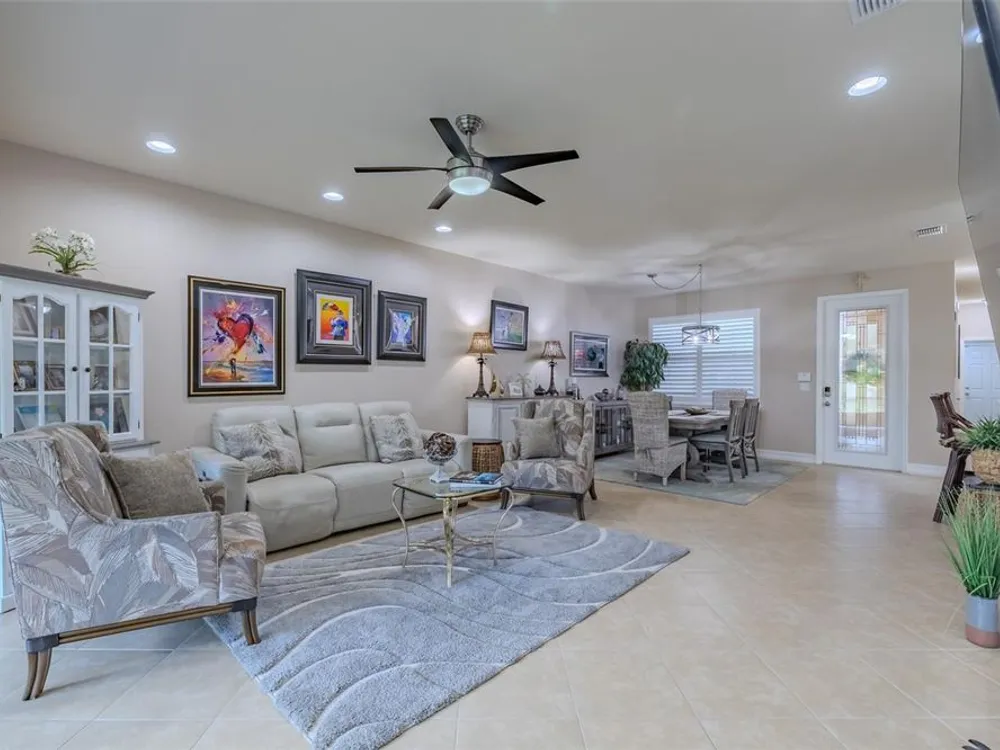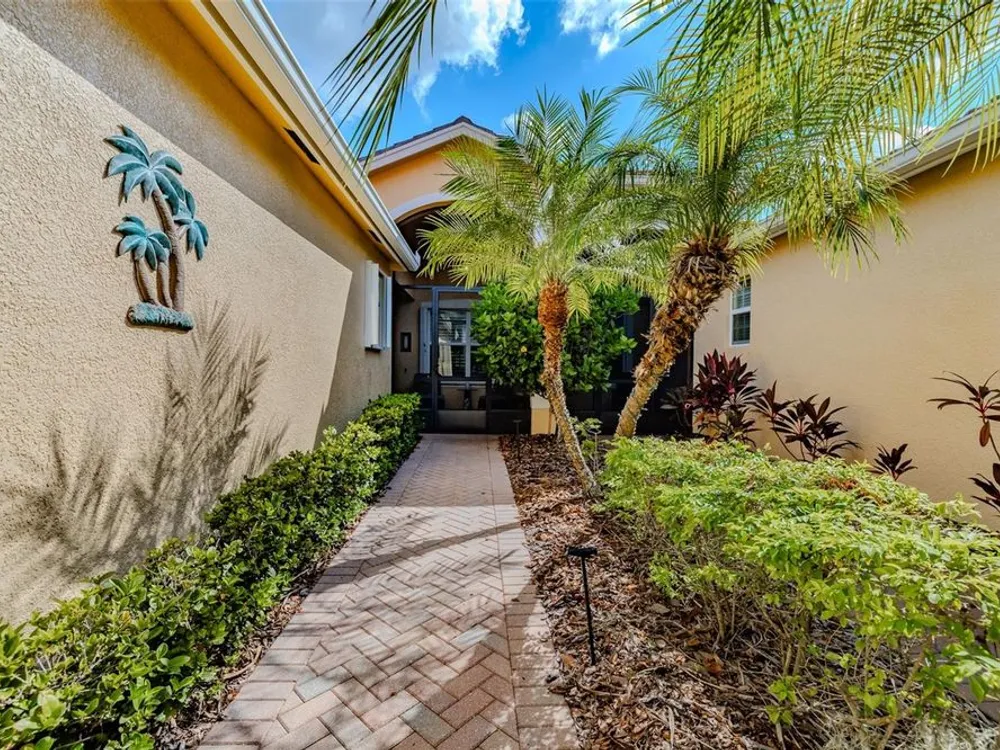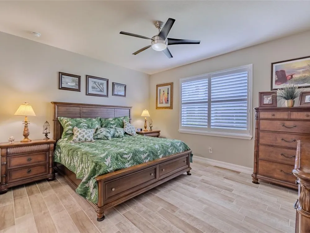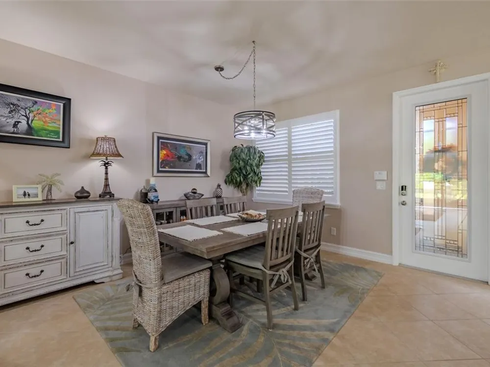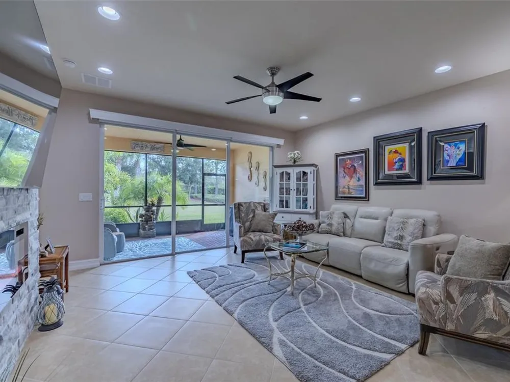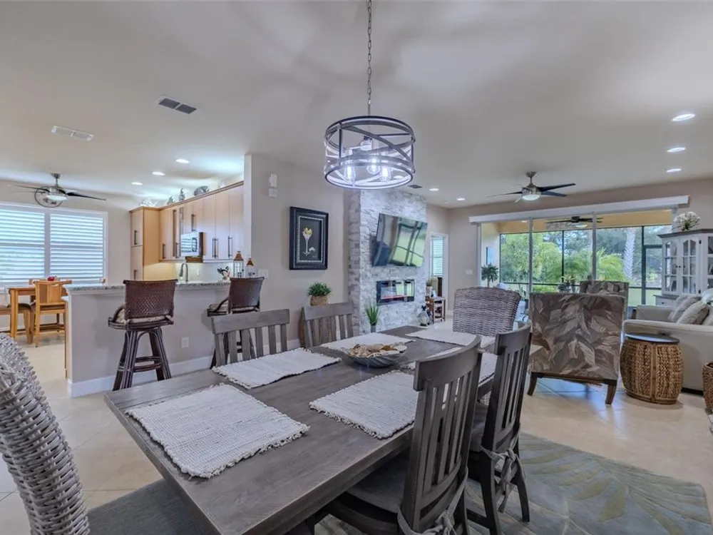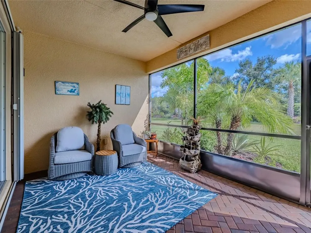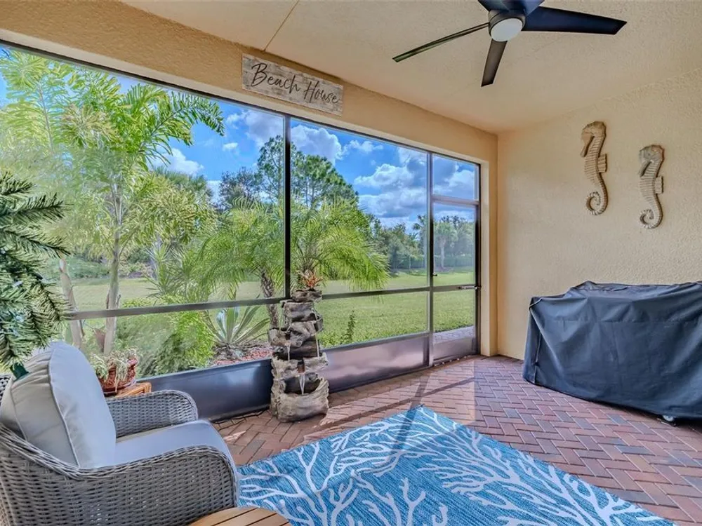 Within the 1709 SF of this VICTORIA model villa, you will find 3 bedrooms, 2 bathrooms, a kitchen with dinette, dining room, great room, and a wonderful lanai. A screened-in front porch affords a tranquil space to enjoy some treasured free time. The full-length decorative glass front door imparts style and distinction and provides a beautiful welcome into the open floorplan of the home. Impeccable 17’x17” ceramic tile on the diagonal graces the common area floors and plantation shutters will be found throughout the home. The dining room features a KICHLER Stetton 3 light Anvil Iron Farmhouse chandelier, a large window overlooking the porch, a commanding view of the open floorplan and it will comfortably accommodate 8 persons. Left of the dining room is a gourmet kitchen with a breakfast bar, 42” solid maple cabinets in a NORDIC style, with soft close hinges and SHELF GENIE pull-outs in lower cabinets and the pantry, extensive granite counters topped with a glass tile backsplash, and stainless-steel appliances that includes a GE slide-in range with convection oven. This kitchen is a beautiful minimalist style that has enough space for the Sous-Chef, and it also provides a cozy dinette where you might enjoy your daily or more intimate meals. The centerpiece of the expansive great room is a custom stone wall, with a built-in LED fireplace and a 75" SAMSUNG tv, that is subtly spectacular. A 52” WINDWARD 5-blade LED ceiling fan will keep the air flowing, recessed canister lights, and remote-controlled patio shades that add that finishing touch to make this great room feel truly special. The 9’ sliders lead to the lanai which will be the perfect place to bring the outdoors, indoors. The view is something to behold. The primary bedroom features wood-look ceramic plank tile, a 52” WINDWARD 5-blade LED ceiling fan, a large window overlooking a substantial backyard, 2 walk-in closets and an ensuite bathroom that has a spacious walk-in chrome-framed glass shower, two separated vanities with granite counters and KOHLER undermount sinks with MOEN Brantford chrome faucets, and a water closet for the commode. With a nod to detail, all the shut off valves have been replaced with multi-turn valves. Bedroom 2 lies at the front of the house, is carpeted and features another 52” WINDWARD 5-blade LED ceiling fan. Bedroom 3 features double-French glass doors, a hip MINKA-AIRE 44” Traditional 3 blade ceiling fan and it’s presently being used as an office. How will you choose to use this space? The second bathroom is also at the front of the home, and it has a tub/shower with floor to ceiling tile with a 4” listello. The laundry room has a SAMSUNG top-load stainless-steel tub washer, and a Moisture Sensor dryer, overhead cabinets and a utility sink. The 20’x19’ garage has two 4’x8’ overhead storage SAFE RACKS, a 50-gal RHEEM water heater, and a whole house water softener system. Rest assured with front and rear of house gutters and hurricane-rated accordion shutters on all windows. This VICTORIA is move-in ready, and she is guaranteed to please. Located in Valencia lakes, Tampa Bay’s premier 55+Active Adult community and close new and exceptional medical facilities, TPA, great West coast beaches and all that Greater Tampa Bay has to offer. Seize the day and start living your idyllic life today.