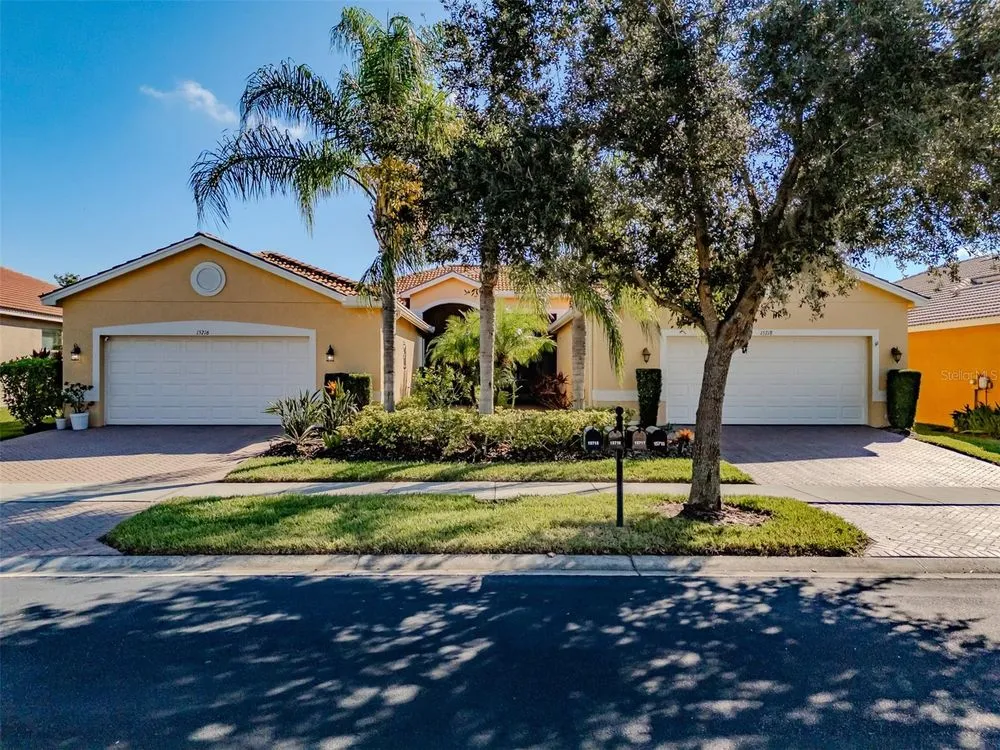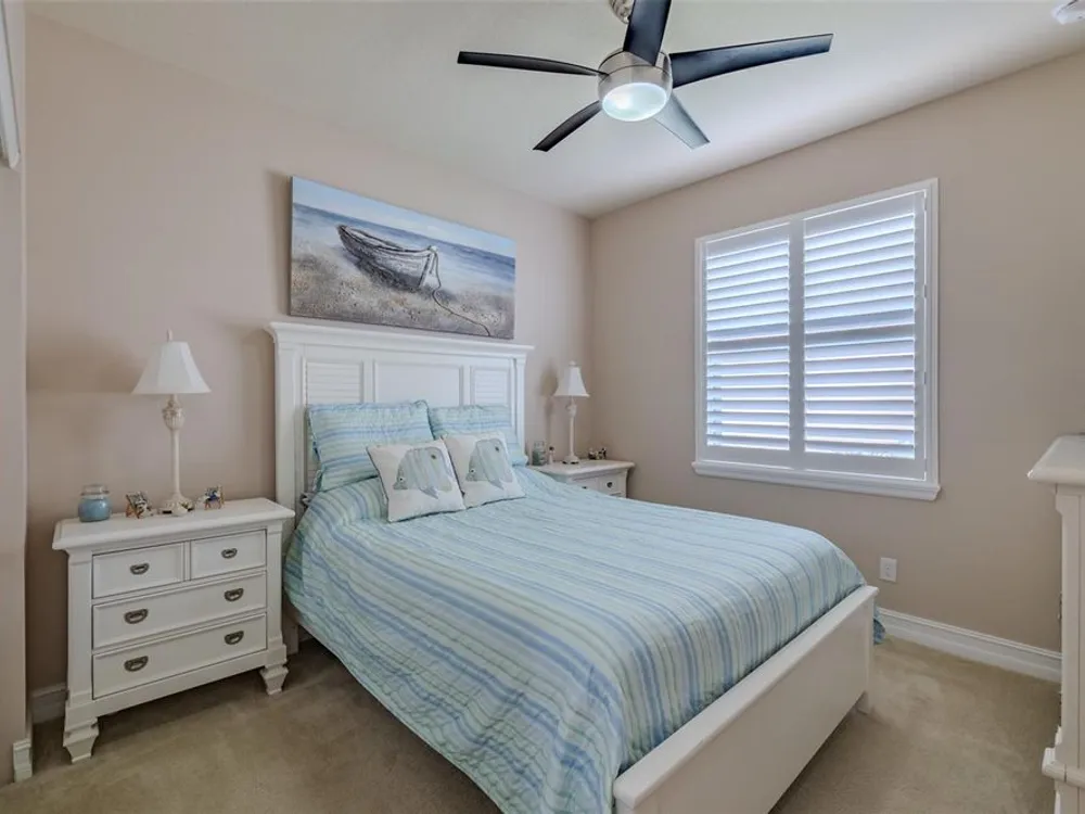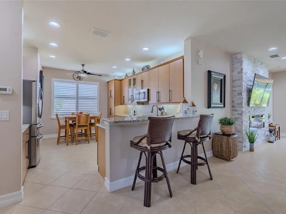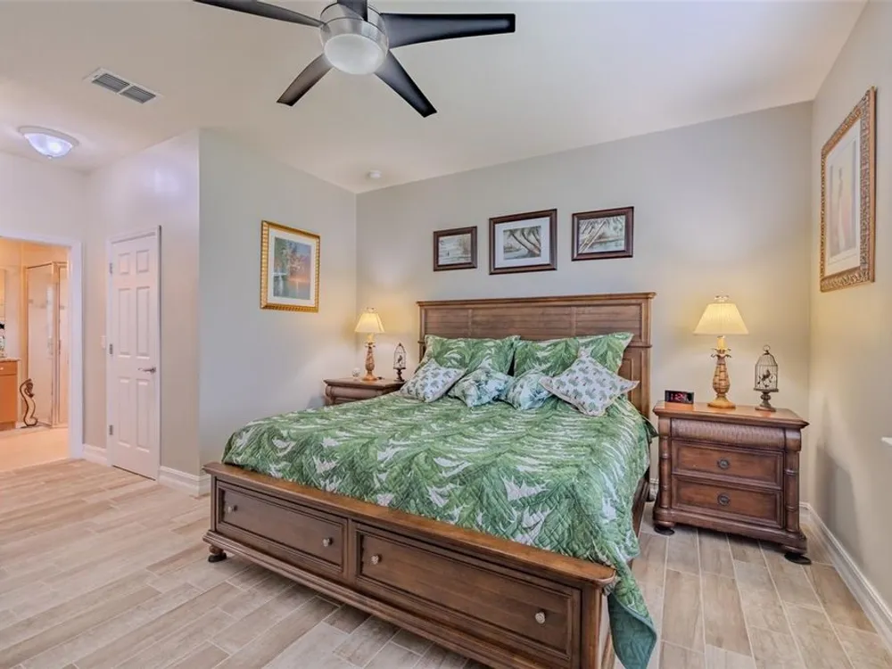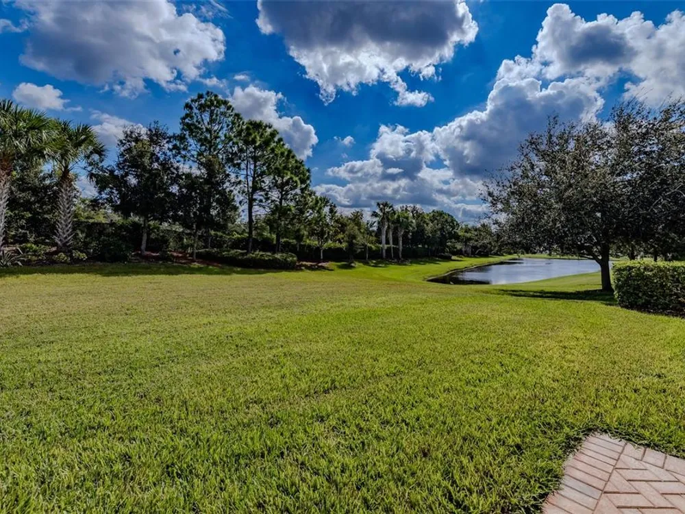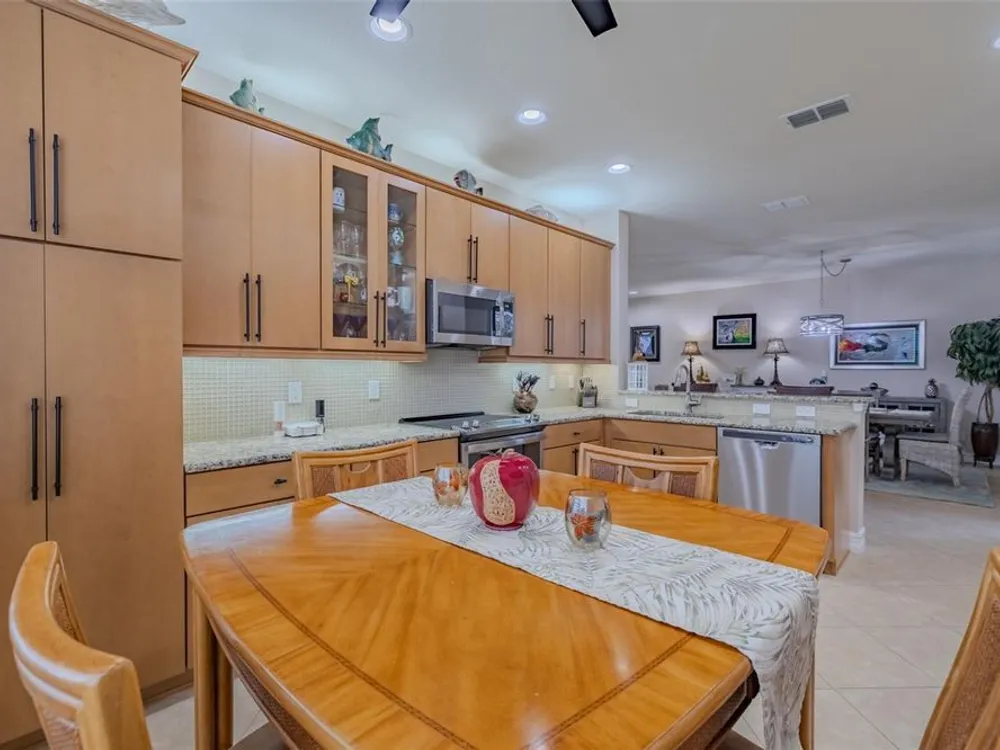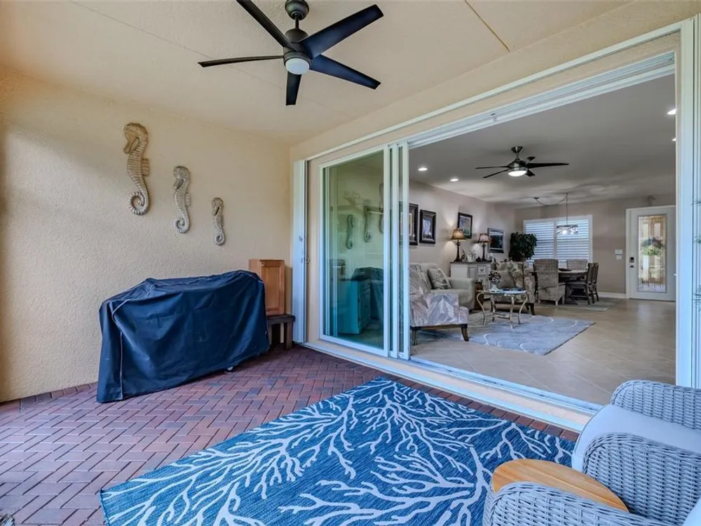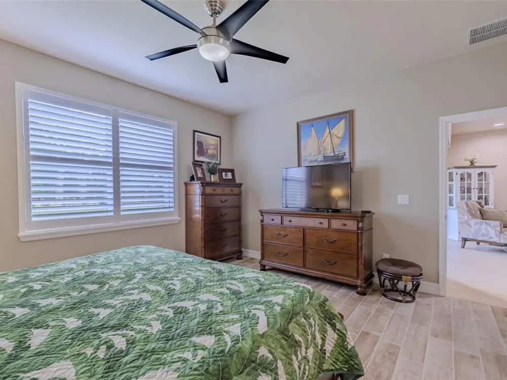 Within the 1709 SF of this VICTORIA model villa, you will find 3 bedrooms, 2 bathrooms, a kitchen with dinette, dining room, great room, and a wonderful lanai. A screened-in front porch affords a tranquil space to enjoy some treasured free time. The full-length decorative glass front door imparts style and distinction and provides a beautiful welcome into the open floorplan of the home. Impeccable 17’x17” ceramic tile on the diagonal graces the common area floors and plantation shutters will be found throughout the home. The dining room features a KICHLER Stetton 3 light Anvil Iron Farmhouse chandelier, a large window overlooking the porch, a commanding view of the open floorplan and it will comfortably accommodate 8 persons. Left of the dining room is a gourmet kitchen with a breakfast bar, 42” solid maple cabinets in a NORDIC style, with soft close hinges and SHELF GENIE pull-outs in lower cabinets and the pantry, extensive granite counters topped with a glass tile backsplash, and stainless-steel appliances that includes a GE slide-in range with convection oven. This kitchen is a beautiful minimalist style that has enough space for the Sous-Chef, and it also provides a cozy dinette where you might enjoy your daily or more intimate meals. The centerpiece of the expansive great room is a custom stone wall, with a built-in LED fireplace and a 75" SAMSUNG tv, that is subtly spectacular. A 52” WINDWARD 5-blade LED ceiling fan will keep the air flowing, recessed canister lights, and remote-controlled patio shades that add that finishing touch to make this great room feel truly special. The 9’ sliders lead to the lanai which will be the perfect place to bring the outdoors, indoors. The view is something to behold. The primary bedroom features wood-look ceramic plank tile, a 52” WINDWARD 5-blade LED ceiling fan, a large window overlooking a substantial backyard, 2 walk-in closets and an ensuite bathroom that has a spacious walk-in chrome-framed glass shower, two separated vanities with granite counters and KOHLER undermount sinks with MOEN Brantford chrome faucets, and a water closet for the commode. With a nod to detail, all the shut off valves have been replaced with multi-turn valves. Bedroom 2 lies at the front of the house, is carpeted and features another 52” WINDWARD 5-blade LED ceiling fan. Bedroom 3 features double-French glass doors, a hip MINKA-AIRE 44” Traditional 3 blade ceiling fan and it’s presently being used as an office. How will you choose to use this space? The second bathroom is also at the front of the home, and it has a tub/shower with floor to ceiling tile with a 4” listello. The laundry room has a SAMSUNG top-load stainless-steel tub washer, and a Moisture Sensor dryer, overhead cabinets and a utility sink. The 20’x19’ garage has two 4’x8’ overhead storage SAFE RACKS, a 50-gal RHEEM water heater, and a whole house water softener system. Rest assured with front and rear of house gutters and hurricane-rated accordion shutters on all windows. This VICTORIA is move-in ready, and she is guaranteed to please. Located in Valencia lakes, Tampa Bay’s premier 55+Active Adult community and close new and exceptional medical facilities, TPA, great West coast beaches and all that Greater Tampa Bay has to offer. Seize the day and start living your idyllic life today.