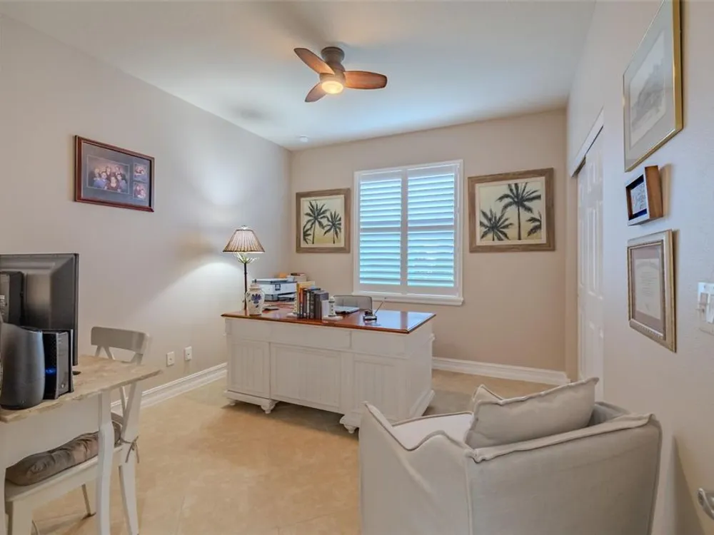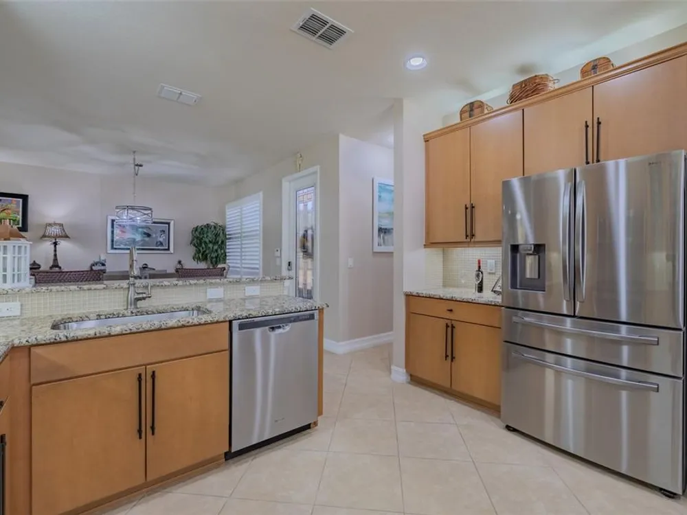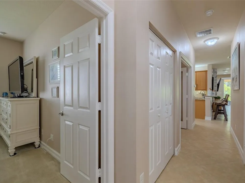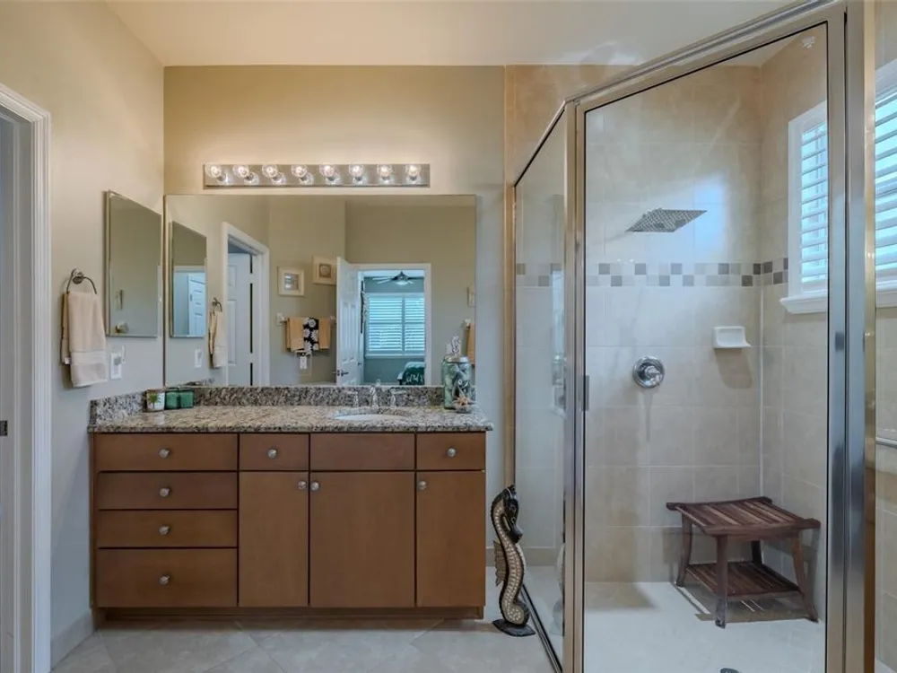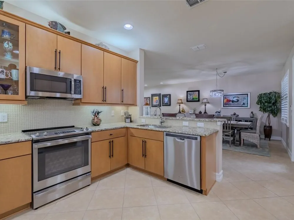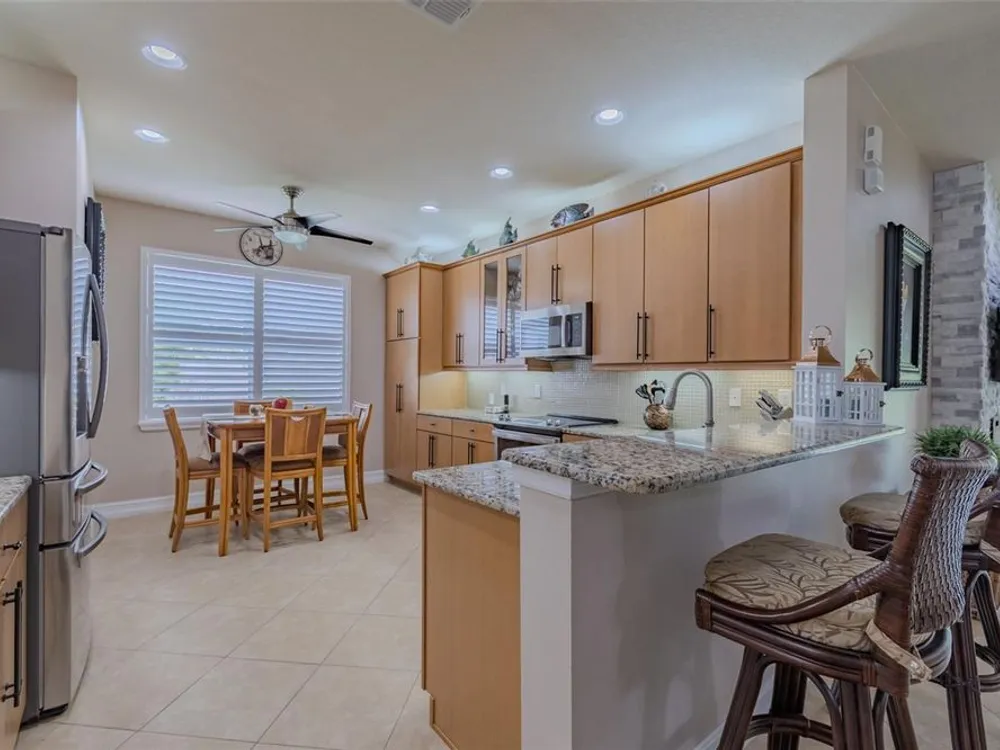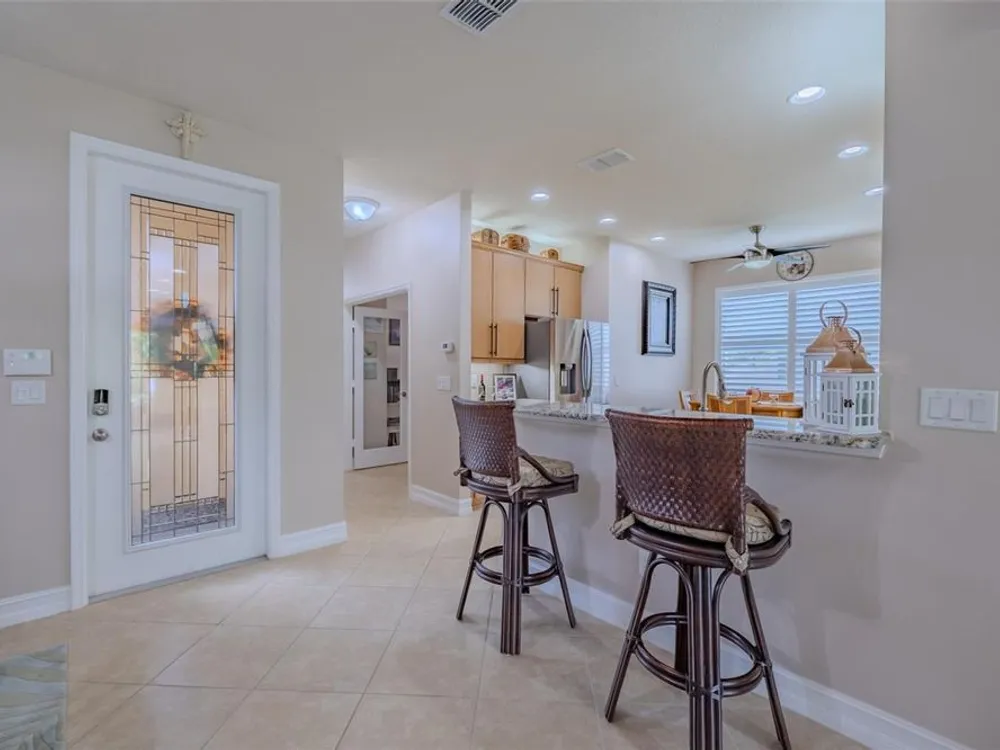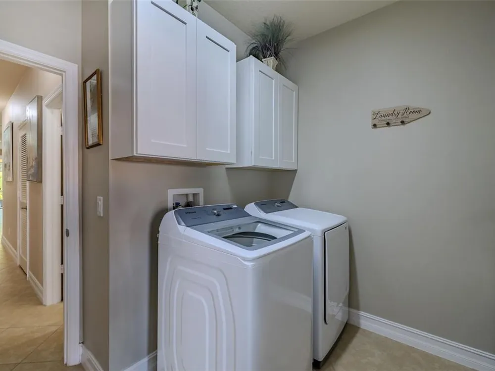 Within the 1709 SF of this VICTORIA model villa, you will find 3 bedrooms, 2 bathrooms, a kitchen with dinette, dining room, great room, and a wonderful lanai. A screened-in front porch affords a tranquil space to enjoy some treasured free time. The full-length decorative glass front door imparts style and distinction and provides a beautiful welcome into the open floorplan of the home. Impeccable 17’x17” ceramic tile on the diagonal graces the common area floors and plantation shutters will be found throughout the home. The dining room features a KICHLER Stetton 3 light Anvil Iron Farmhouse chandelier, a large window overlooking the porch, a commanding view of the open floorplan and it will comfortably accommodate 8 persons. Left of the dining room is a gourmet kitchen with a breakfast bar, 42” solid maple cabinets in a NORDIC style, with soft close hinges and SHELF GENIE pull-outs in lower cabinets and the pantry, extensive granite counters topped with a glass tile backsplash, and stainless-steel appliances that includes a GE slide-in range with convection oven. This kitchen is a beautiful minimalist style that has enough space for the Sous-Chef, and it also provides a cozy dinette where you might enjoy your daily or more intimate meals. The centerpiece of the expansive great room is a custom stone wall, with a built-in LED fireplace and a 75" SAMSUNG tv, that is subtly spectacular. A 52” WINDWARD 5-blade LED ceiling fan will keep the air flowing, recessed canister lights, and remote-controlled patio shades that add that finishing touch to make this great room feel truly special. The 9’ sliders lead to the lanai which will be the perfect place to bring the outdoors, indoors. The view is something to behold. The primary bedroom features wood-look ceramic plank tile, a 52” WINDWARD 5-blade LED ceiling fan, a large window overlooking a substantial backyard, 2 walk-in closets and an ensuite bathroom that has a spacious walk-in chrome-framed glass shower, two separated vanities with granite counters and KOHLER undermount sinks with MOEN Brantford chrome faucets, and a water closet for the commode. With a nod to detail, all the shut off valves have been replaced with multi-turn valves. Bedroom 2 lies at the front of the house, is carpeted and features another 52” WINDWARD 5-blade LED ceiling fan. Bedroom 3 features double-French glass doors, a hip MINKA-AIRE 44” Traditional 3 blade ceiling fan and it’s presently being used as an office. How will you choose to use this space? The second bathroom is also at the front of the home, and it has a tub/shower with floor to ceiling tile with a 4” listello. The laundry room has a SAMSUNG top-load stainless-steel tub washer, and a Moisture Sensor dryer, overhead cabinets and a utility sink. The 20’x19’ garage has two 4’x8’ overhead storage SAFE RACKS, a 50-gal RHEEM water heater, and a whole house water softener system. Rest assured with front and rear of house gutters and hurricane-rated accordion shutters on all windows. This VICTORIA is move-in ready, and she is guaranteed to please. Located in Valencia lakes, Tampa Bay’s premier 55+Active Adult community and close new and exceptional medical facilities, TPA, great West coast beaches and all that Greater Tampa Bay has to offer. Seize the day and start living your idyllic life today.