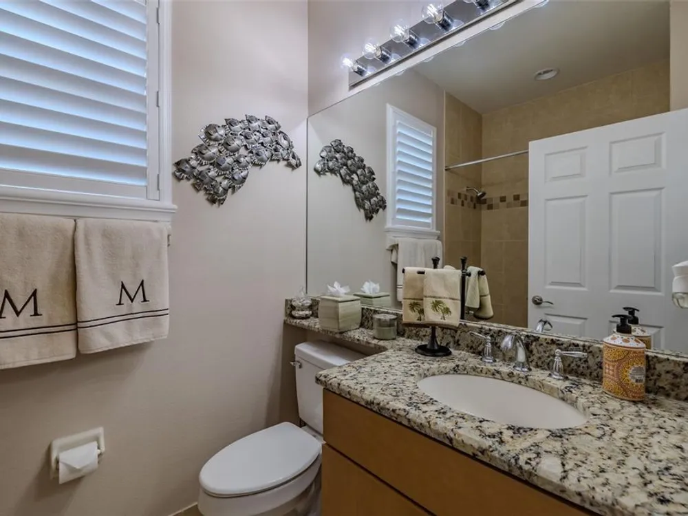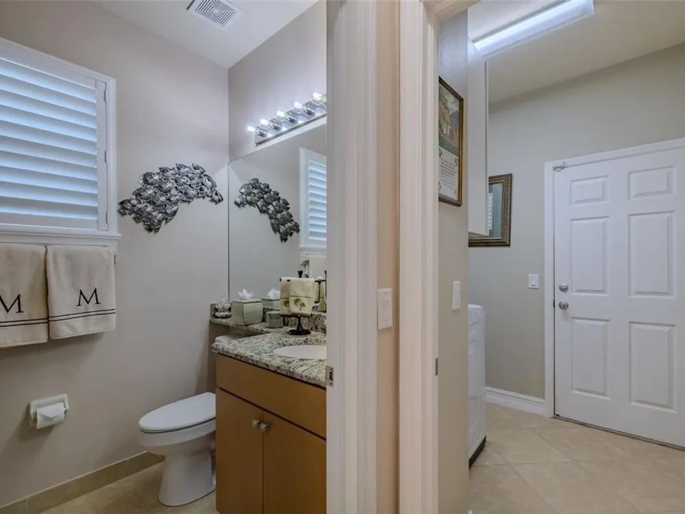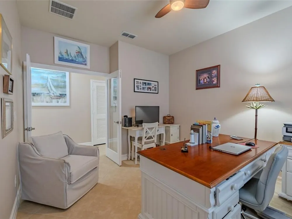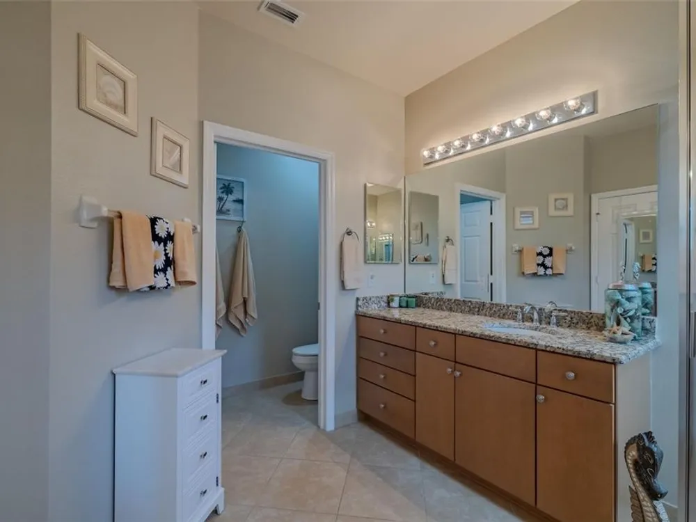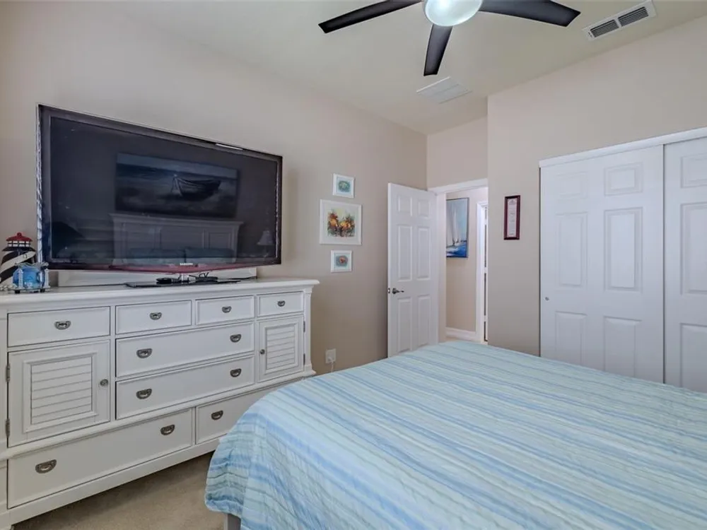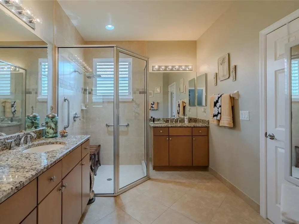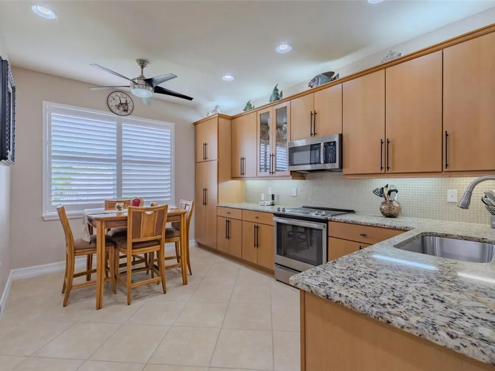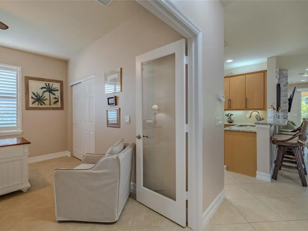 Within the 1709 SF of this VICTORIA model villa, you will find 3 bedrooms, 2 bathrooms, a kitchen with dinette, dining room, great room, and a wonderful lanai. A screened-in front porch affords a tranquil space to enjoy some treasured free time. The full-length decorative glass front door imparts style and distinction and provides a beautiful welcome into the open floorplan of the home. Impeccable 17’x17” ceramic tile on the diagonal graces the common area floors and plantation shutters will be found throughout the home. The dining room features a KICHLER Stetton 3 light Anvil Iron Farmhouse chandelier, a large window overlooking the porch, a commanding view of the open floorplan and it will comfortably accommodate 8 persons. Left of the dining room is a gourmet kitchen with a breakfast bar, 42” solid maple cabinets in a NORDIC style, with soft close hinges and SHELF GENIE pull-outs in lower cabinets and the pantry, extensive granite counters topped with a glass tile backsplash, and stainless-steel appliances that includes a GE slide-in range with convection oven. This kitchen is a beautiful minimalist style that has enough space for the Sous-Chef, and it also provides a cozy dinette where you might enjoy your daily or more intimate meals. The centerpiece of the expansive great room is a custom stone wall, with a built-in LED fireplace and a 75" SAMSUNG tv, that is subtly spectacular. A 52” WINDWARD 5-blade LED ceiling fan will keep the air flowing, recessed canister lights, and remote-controlled patio shades that add that finishing touch to make this great room feel truly special. The 9’ sliders lead to the lanai which will be the perfect place to bring the outdoors, indoors. The view is something to behold. The primary bedroom features wood-look ceramic plank tile, a 52” WINDWARD 5-blade LED ceiling fan, a large window overlooking a substantial backyard, 2 walk-in closets and an ensuite bathroom that has a spacious walk-in chrome-framed glass shower, two separated vanities with granite counters and KOHLER undermount sinks with MOEN Brantford chrome faucets, and a water closet for the commode. With a nod to detail, all the shut off valves have been replaced with multi-turn valves. Bedroom 2 lies at the front of the house, is carpeted and features another 52” WINDWARD 5-blade LED ceiling fan. Bedroom 3 features double-French glass doors, a hip MINKA-AIRE 44” Traditional 3 blade ceiling fan and it’s presently being used as an office. How will you choose to use this space? The second bathroom is also at the front of the home, and it has a tub/shower with floor to ceiling tile with a 4” listello. The laundry room has a SAMSUNG top-load stainless-steel tub washer, and a Moisture Sensor dryer, overhead cabinets and a utility sink. The 20’x19’ garage has two 4’x8’ overhead storage SAFE RACKS, a 50-gal RHEEM water heater, and a whole house water softener system. Rest assured with front and rear of house gutters and hurricane-rated accordion shutters on all windows. This VICTORIA is move-in ready, and she is guaranteed to please. Located in Valencia lakes, Tampa Bay’s premier 55+Active Adult community and close new and exceptional medical facilities, TPA, great West coast beaches and all that Greater Tampa Bay has to offer. Seize the day and start living your idyllic life today.