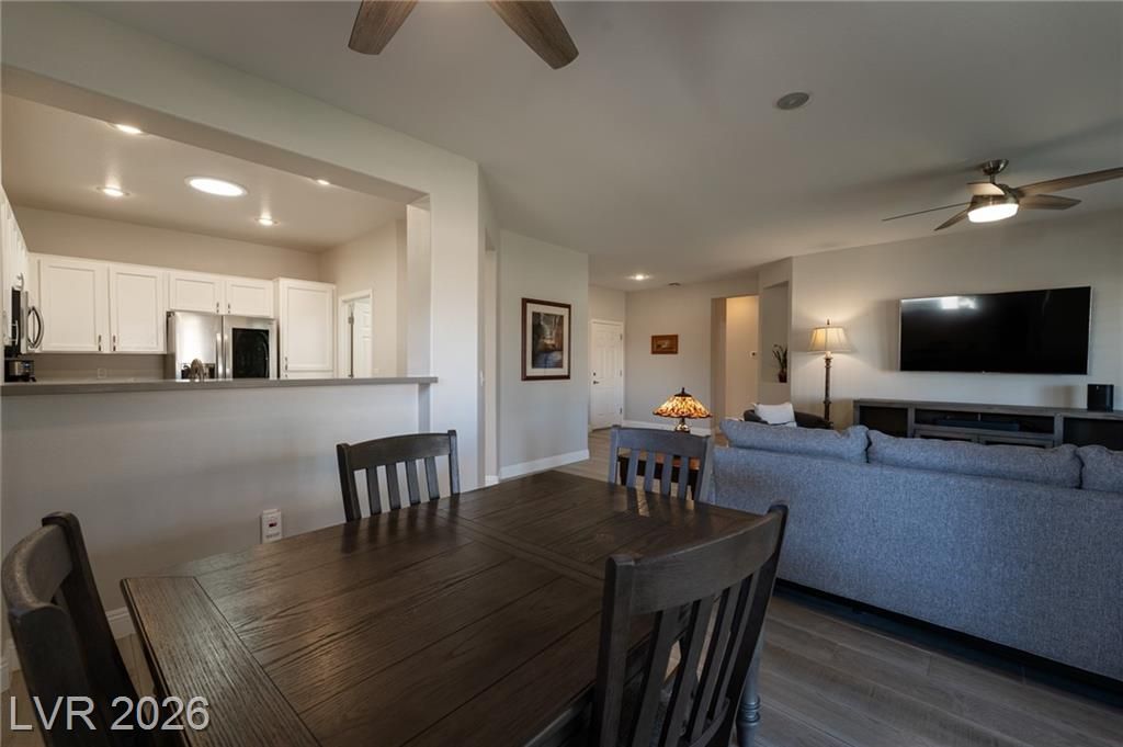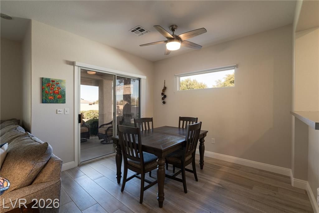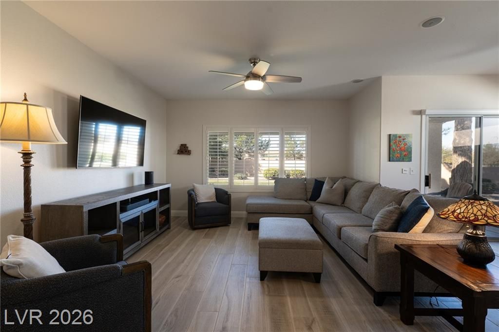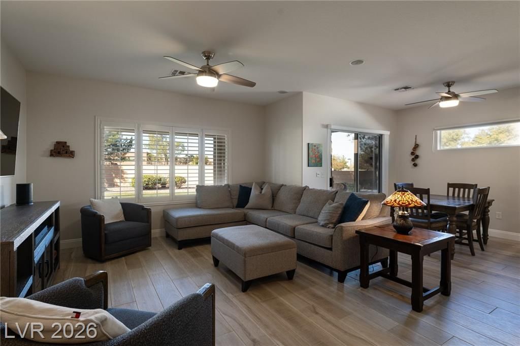 Beautiful attached villa in the highly desirable Sun City Anthem 55+ community! Prime inside corner location offers stunning views and added privacy. This move-in-ready home features wood-look porcelain plank flooring throughout. fresh baseboards, abundant natural light, and plantation shutters throughout. Thoughtfully maintained and tastefully designed with classic white cabinetry, stainless steel appliances and ceiling fans for comfort and style. As a freestanding attached end unit in the Villas, this home also offers extra backyard, side lawn and outdoor space. Sun City Anthem residents enjoy world-class amenities including two golf courses, indoor and outdoor pools, fitness center, walking track, tennis and bocce courts, craft and hobby studios, billiards and card rooms, computer lab, grand ballroom, and more. **HOA billed quarterly and includes landscaping, irrigation, trash, insurance, exterior painting, and block walls. Spacious backyard with no rear neighbors.**