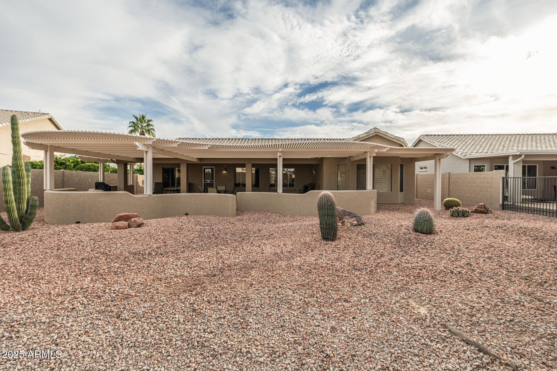 This immaculate, well-maintained home is nestled in a quiet section of Tuscany Falls side of the award-winning golf course resort community of PebbleCreek. You will notice pride of ownership the moment you walk up to the brick paved driveway, coated walkway & pristine desert landscape. The extended floor plan offers generous living space, featuring 3 full bedrooms and 2 full bathrooms, vaulted ceilings and an abundance of windows for natural sunlight. Two of three bedrooms can accommodate full king-bedroom suites and have large walk-in closets designed by Classy Closets. The third bedroom is centrally located and can also be used as an office, library or den. The updated kitchen offers both style and function, featuring an expanded breakfast nook with charming bay windows, granite countertops with full height backsplash, and new stainless-steel appliances. Stately 48-inch upper cabinetry and the lower cabinets offer convenient pull-out shelving and provide exceptional storage. A smart, built-in desk area, perfect for a discreet home office, completes the space. The interior showcases a neutral palate, plantation shutters and porcelain tile throughout the home, 18" set on the diagonal and 20" brick lay tile in the primary bedroom. The generously proportioned laundry room offers ample additional cabinetry and counter space and the washer and dryer convey. The home and garage have been thoughtfully extended by four feet, providing extra depth and square footage. The garage has built-in cabinets for optimized storage and durable, easy to maintain epoxy floors. A soft water loop and R/O are already in place for your convenience. Step into the backyard built for enjoyment. Facing North for comfortable use all day and perfect for hosting gatherings or unwinding in peace. It features an oversized covered patio that flows seamlessly to an expansive pergola area creating an inviting outdoor living space that overlooks a picturesque common area and walking path. The low maintenance desert front and back yards and front and back security doors make this home the perfect lock and leave or full-time haven. This home has everything you need and is move-in ready so you can start enjoying the resort lifestyle right away! Don't miss it! Please see the full list of upgrades and features in the document section.