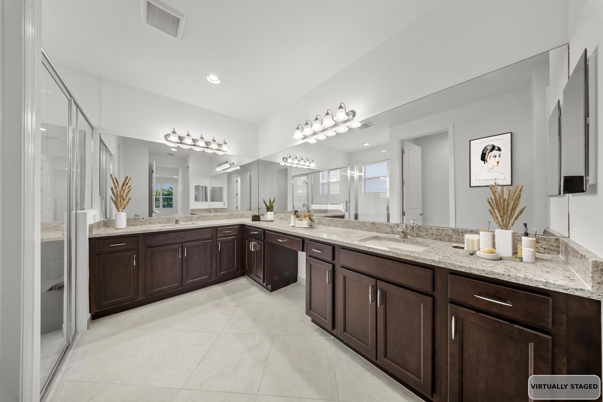 Step into this Sandpiper model with 1,760 living space under air, 2 bedrooms + office/3rd bedroom with pocket doors, and 2 baths. Corner lot with added Clusias for full privacy with fencing and screened patio. Upgrades include diagonal tile, recessed lighting throughout, impact windows, marble windowsills, full gutters, and extra TV hookups inside and on patio. Kitchen with pantry, finished back panel of island with added GFI. Primary suite features 2 walk-in closets, dual sinks, tiled-to-ceiling shower. Guest bath also tiled to ceiling. Laundry room with sink. Valencia Grove offers world-class 55+ amenities: clubhouse, resort pool with cabanas, fitness, pickleball, tennis, and endless social events. Move-in ready with security system.