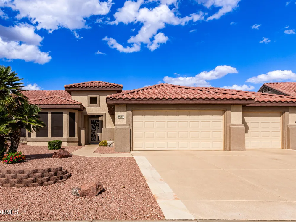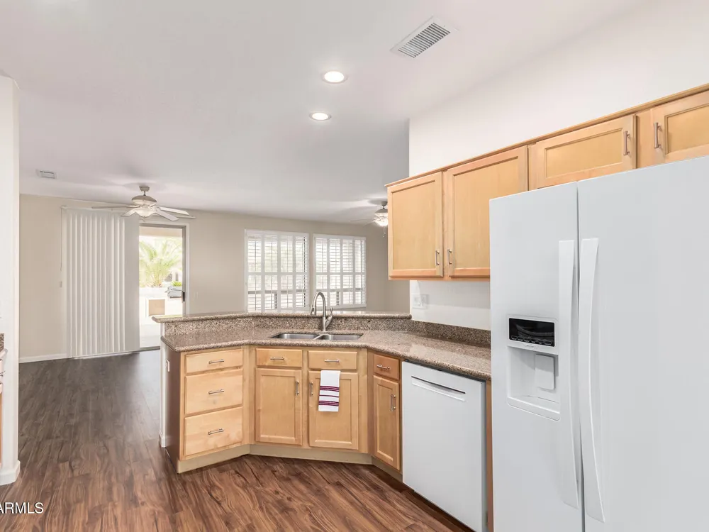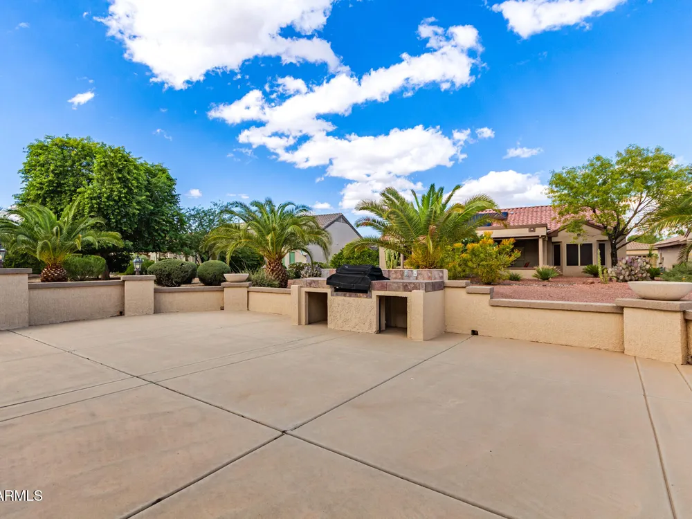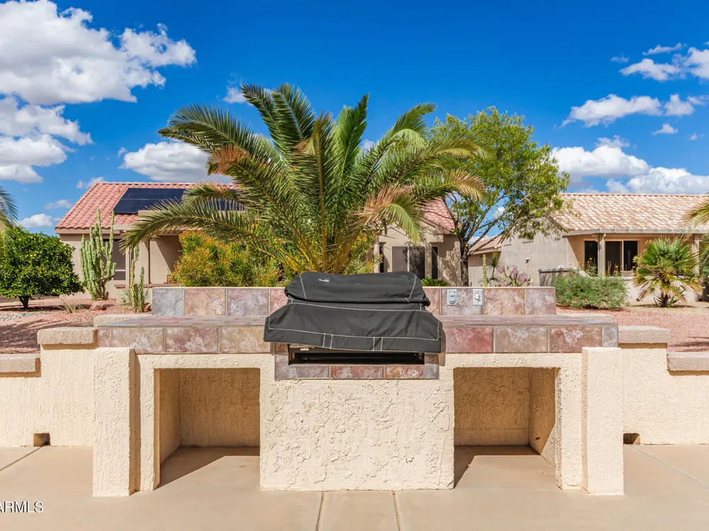 THIS IS A MUST SEE HOME! Step inside to this beautifully maintained 2-bedroom + office, 1.75-bath home. This home features an open-concept floor plan filled with natural light, perfect for entertaining or relaxing in effortless comfort. You will love the kitchen that flows seamlessly into the dining area, great room and eat in kitchen area...allowing you to stay connected with family and guests. Step outside to your large backyard patio, designed for outdoor Arizona living at its best—with a built-in BBQ grill, seating area, and plenty of space for gatherings. This home also features a spacious 3 CAR GARAGE with plenty of storage. Great for parking mulitple cars and/or golf cart. *Wood shutters throughout home. *Washer/Dryer and Refrigerator included!