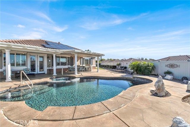 POOL & SPA HOME, on Beautiful Lot at the end of a Quiet Cul-D-Sac, this is a REMARKABLE Enlarged 'EMERALD' Model (3 BA - TWO Primary 'En Suite' Bedrooms with Walk-in Closets + Den/Office - 2305 sf) in Solera at Oak Valley Greens, a 55+ Luxury Active Adult community. ALL UPSCALE FURNISHINGS, including EVERYTHING (Dishware, Decor Items, etc) INCLUDED IN PRICE, if desired. Some Features include: Expanded/remodeled Great room; Remodeled Kitchen & Baths; Pricey Porcelain/Wood-Look Flooring, Plantation Shutters, Ceiling Fans and Specialty Light Fixtures. CLASS & PANACHE - This Home won't Disappoint. Garage is Spacious Double Car with 3rd Parking for Golf Cart, Motorcycle, Storage, Etc. Yard has a Salt Water Pool & Jacuzzi, Extended Alumawood Patio Cover to Enjoy outdoor living in ALL Seasons, BBQ island & Lush grounds with Avocado and Citrus Trees. SPECIAL FEATURE is a 30 amp RV outlet and RV Dump system. Solar is leased at $115/Mo for unbelievably low Utilities. Solera at Oak Valley Greens offers a Great Clubhouse; Many Social Clubs and Activities to meet New Friends; Indoor Jogging track, Fitness center, Tennis courts, Pool/spa, Library; Bocce Ball and Billiards. The Solera 55+ Community has a Picturesque Mountain Backdrop, and is Freeway Close (I-10) - A Short distance to fabulous Shopping (Cabazon or Palm Springs); Casinos; Golf at Oak Valley Greens; Medical Facilities Close by & a short drive to the Charming City of Redlands to the west or Palm Springs to the East. If you're looking for an UPSCALE 55+ Community, you won't want to miss the Ideally Located Community of SOLERA at Oak Valley Greens.