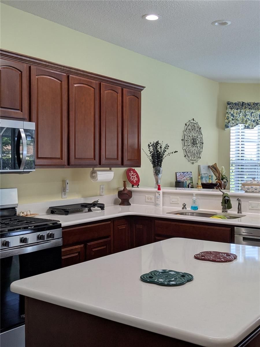 - Ceiling Fan(s), Eat-in Kitchen, High Ceilings, Solid Surface Counters, Stone Counters, Thermostat, Walk-In Closet(s), Window Treatments