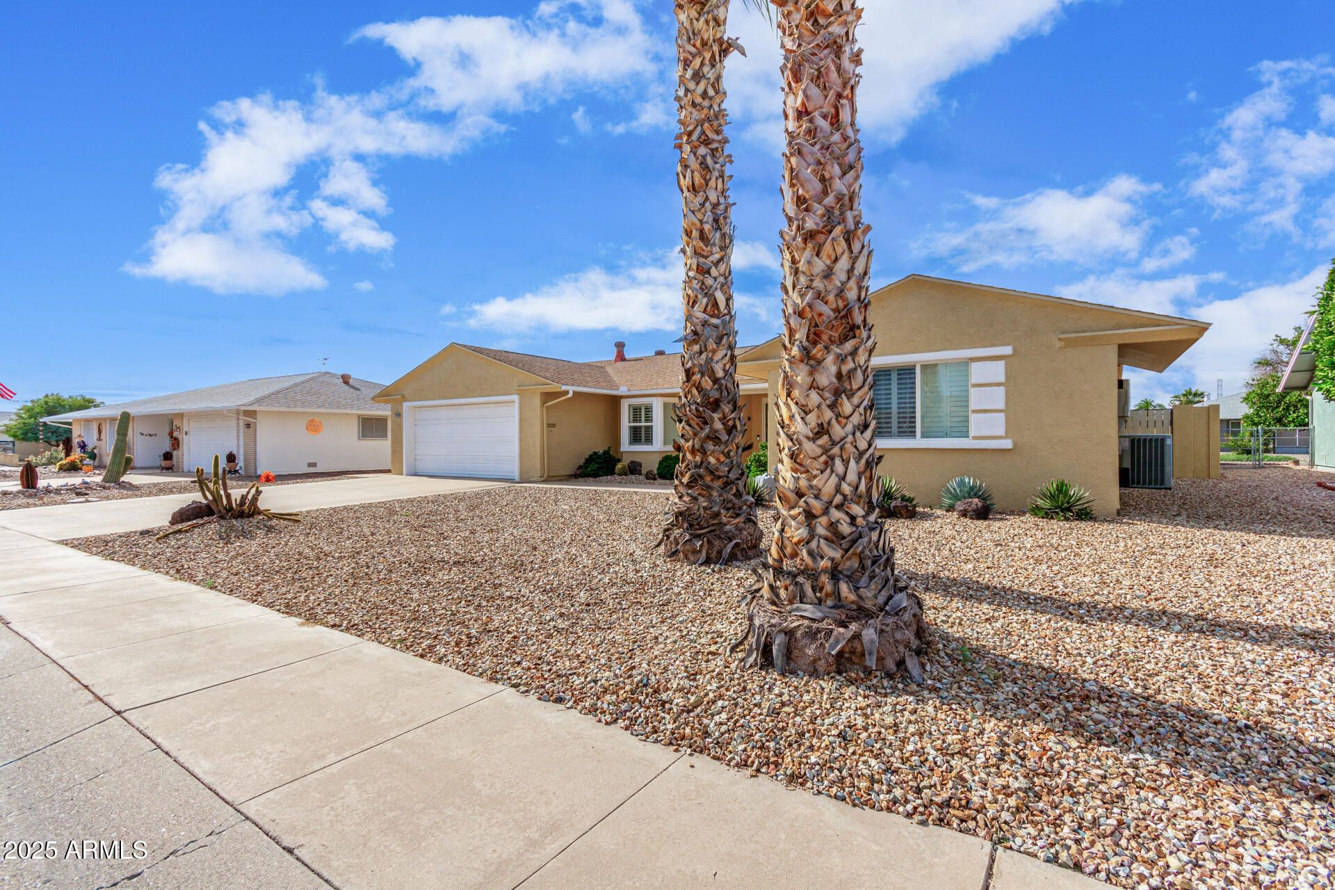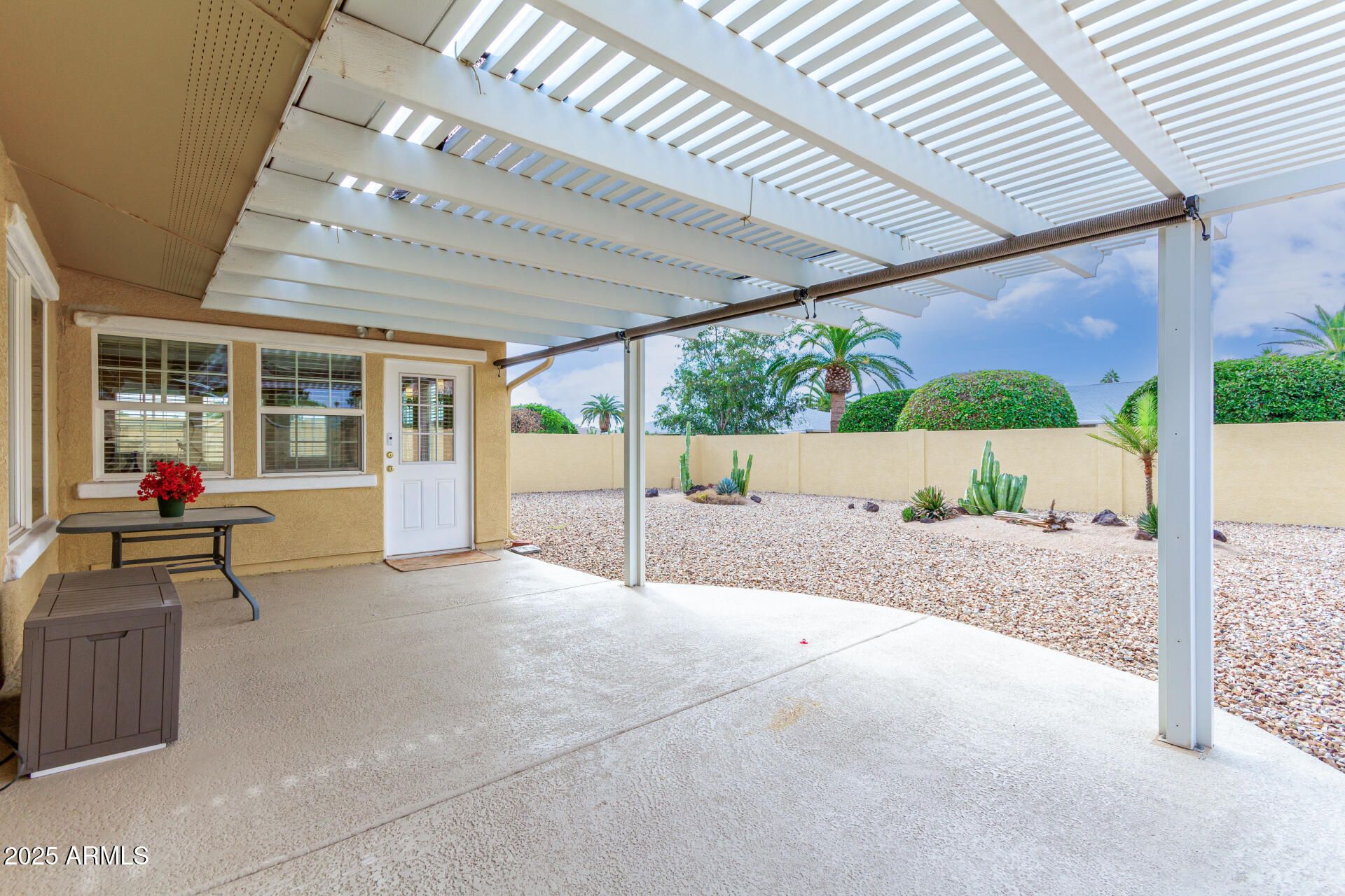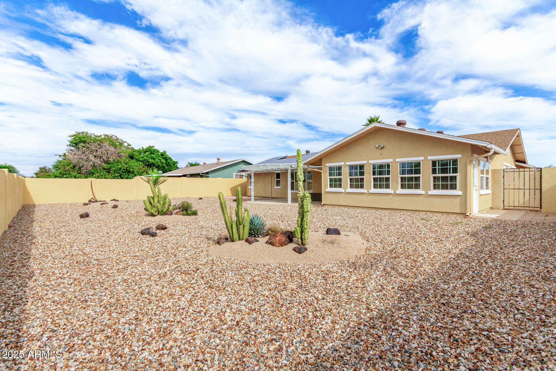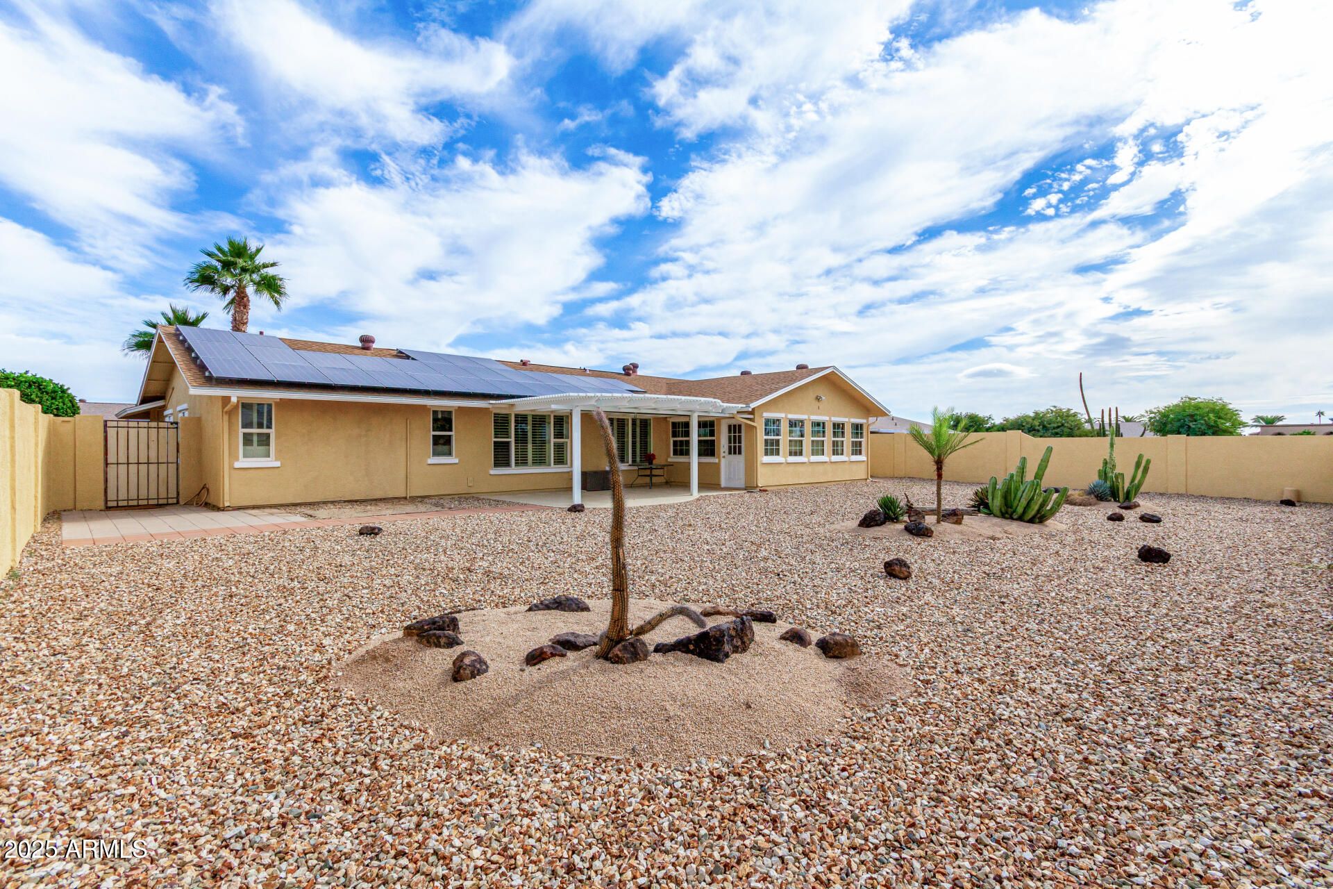 Great floorplan and move-in ready home. Home features 2 bedrooms/ 2 baths, 250 sq ft Arizona Room, large laundry with an office area. Dual-pane windows, plantation shutters t/o and bay window in kitchen. Home features paid solar system. Large low maintenance backyard with full block fence and features a pergola covered patio, dual side entrances and storage shed.