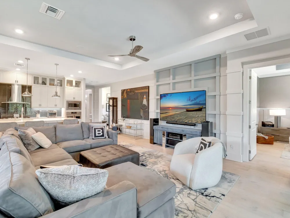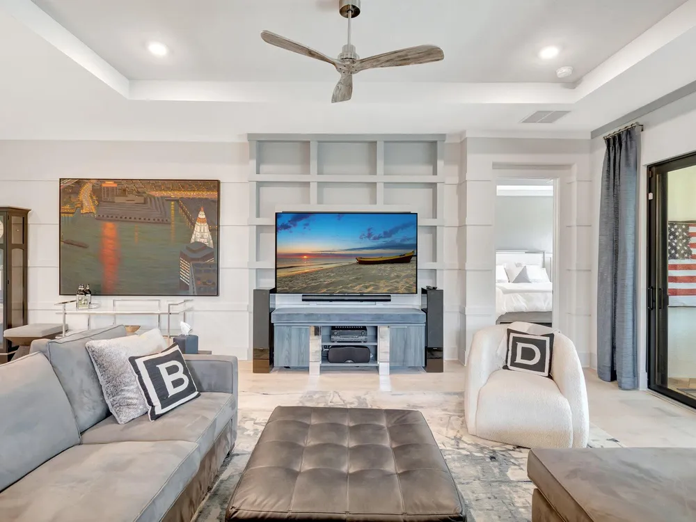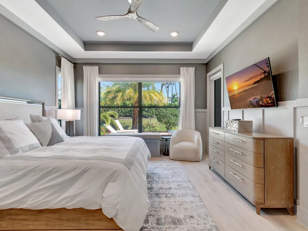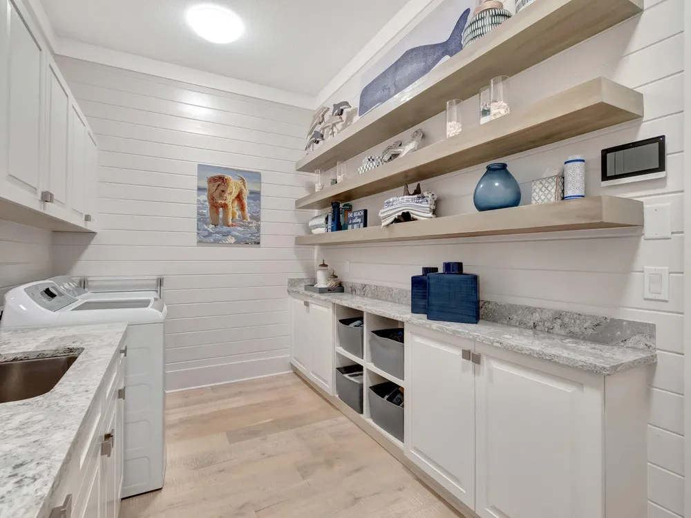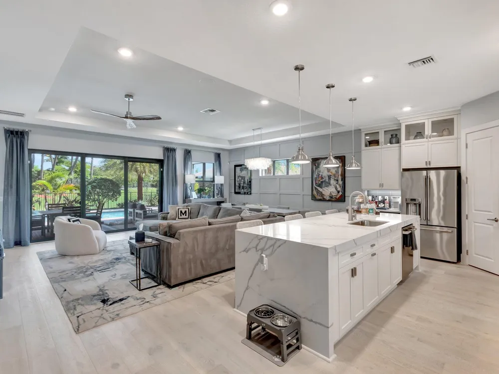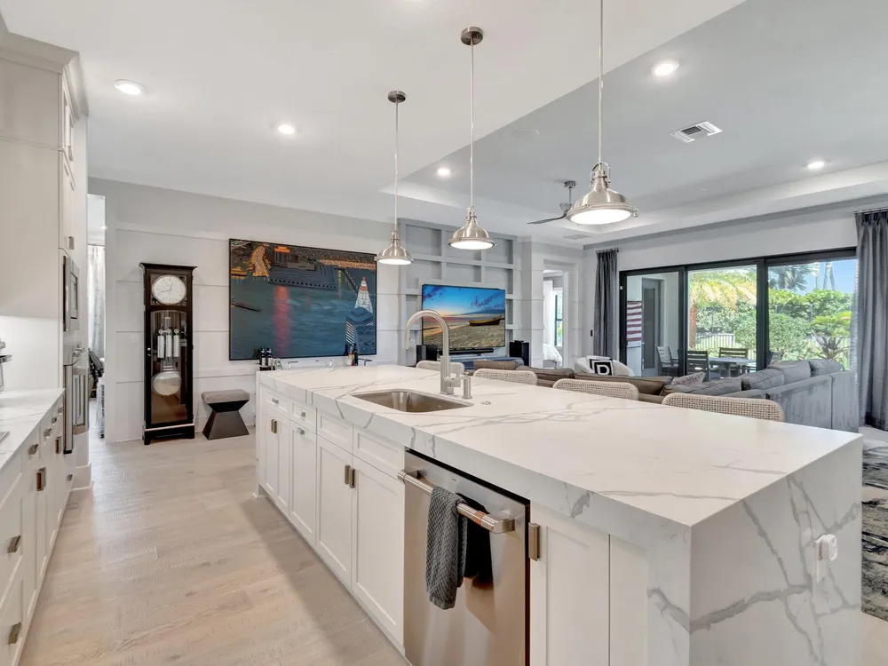 - Built-in Shelving, Closet Cabinetry, Cathedral Ceiling(s), Entrance Foyer, Kitchen Island, Pantry, Split Bedrooms, High Ceilings, Walk-In Closet(s), Home Office, Great Room, Living/Dining Room, Kitchen/Dining Combo, Snack Bar, Impact Glass, Dual Sinks, Primary Downstairs, Separate Shower