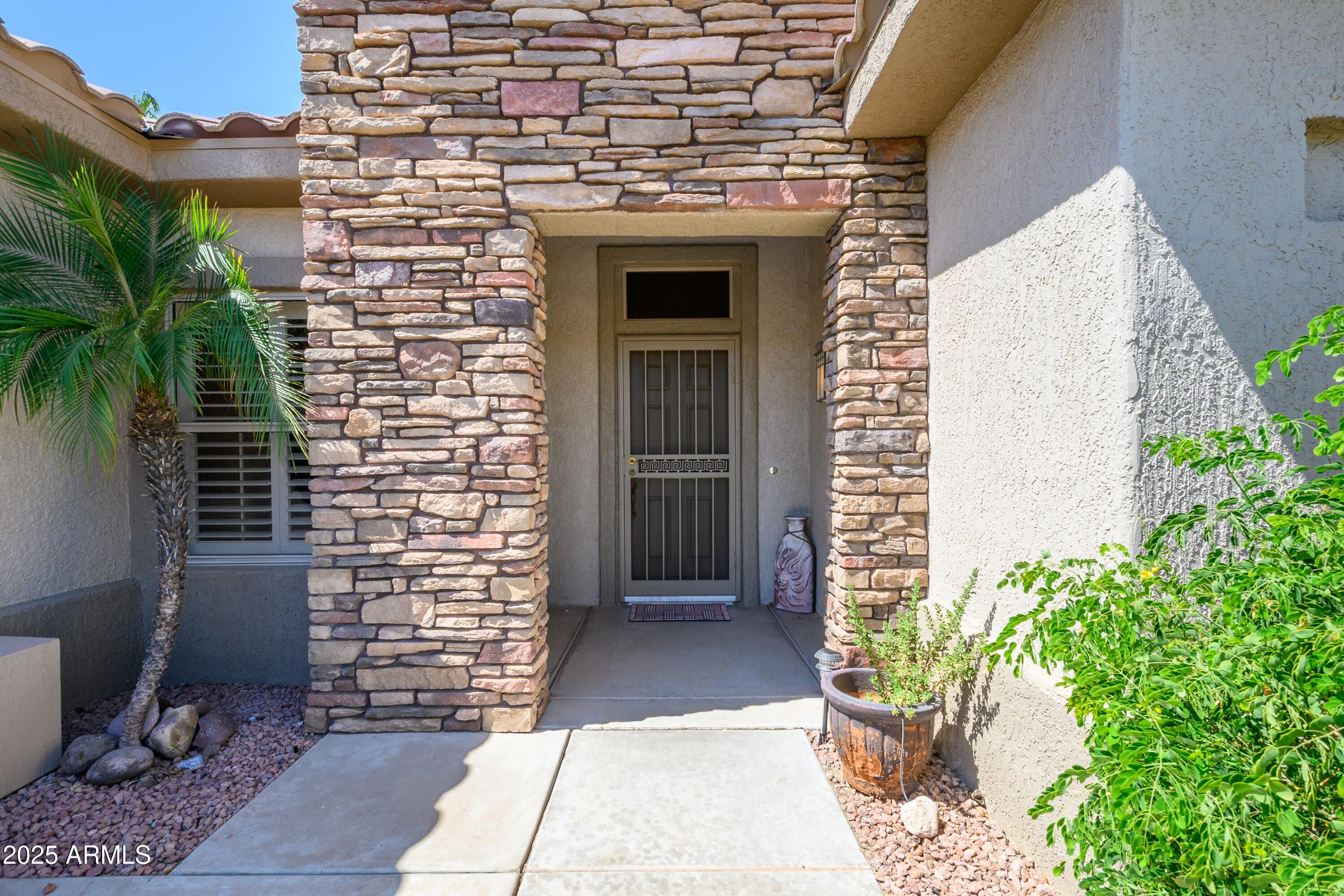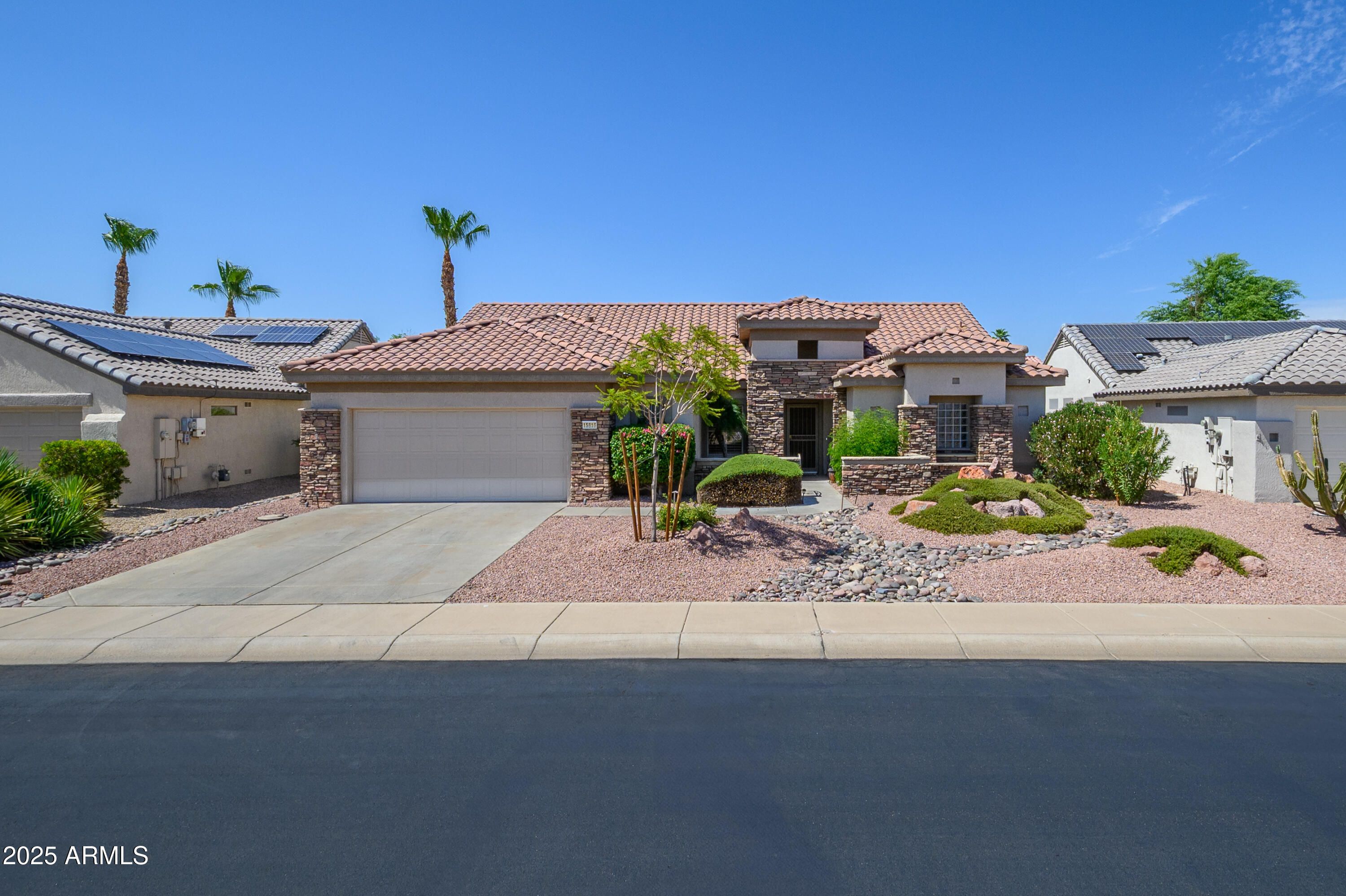 Beautifully maintained Stonecrest model in The Grand with three bedrooms and a desirable split floor plan for privacy. This home features vaulted ceilings, plantation shutters, a spacious kitchen, and a serene primary suite. The standout feature is the lush, fully enclosed backyard—your own ''Secret Garden''—featuring manicured landscaping, a fountain, and a paver patio perfect for enjoying Arizona sunsets: excellent great curb appeal, gated courtyard entry, and a peaceful interior street location. Discover timeless elegance and serene outdoor living in this stunning Stonecrest model located in the highly sought-after Sun City Grand community. Featuring 3 bedrooms, 2 bathrooms, and a spacious 2-car garage, this home blends architectural charm with thoughtful updates and a backyard that will take your breath away. From the moment you arrive, the exceptional curb appeal makes a lasting impression. Beautifully accented with stacked stone, professional desert landscaping, a gated front courtyard, and ambient exterior lighting, the home radiates warmth especially during the golden glow of twilight. Inside, this split-bedroom floor plan offers vaulted ceilings, a light-filled interior, and plantation shutters throughout. The kitchen is centrally located, offering plenty of cabinetry, counter space, and a cozy breakfast nook that opens to the family room. Entertain with ease in the formal living and dining areas or enjoy quiet moments in the inviting gathering spaces. The primary suite is tucked privately on one side of the home and features: Large bay window with views of the garden Dual vanities with granite countertops Spacious walk-in shower with upgraded tile Walk-in closet with built-in organization The two additional bedrooms are located on the opposite side of the home, ideal for guests or hobbies, and share a full bath with neutral finishes. And then there's the backyard... Lovingly referred to as a "Secret Garden," the backyard is a fully enclosed, private retreat surrounded by mature flowering hedges, manicured topiary, and a stunning centerpiece fountain. Imagine morning coffee on the brick paver patio or evening wine under the Arizona sky as ambient garden lighting transforms the space into your own resort-style escape. Additional features: Stacked stone exterior accents Gated entry courtyard with lantern lighting Vaulted ceilings throughout main living areas Custom light fixtures and fans Indoor laundry with upper cabinets Garage with built-in storage and workbench Low-maintenance front and rear landscaping Sunset-facing exposure for ideal afternoon light Quiet interior street with minimal traffic Situated in the heart of The Grand, this home offers access to: 4 championship golf courses Resort-style pools and spas Fitness centers and sport courts On-site dining, social clubs & events Scenic walking trails and golf cart-friendly streets