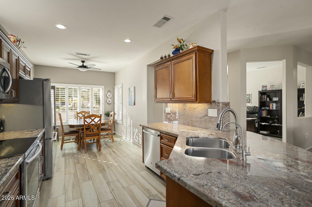 Inviting MADERA with a fantastic outdoor setup — including a front courtyard and an extended back patio with pavers and professional misting system for year round enjoyment. Inside you'll find style and comfort with wood-look tile floors (2023), plantation shutters, lever handles, kitchen updated (2023) with granite countertops, newer appliances, reverse osmosis and in the primary suite, an updated shower (2023). Washer/Dryer with pedestals. Roof (2024) HVAC (2022), extra insulation, soft water system (approx.1 year old), 2 car extended garage and a new garage door and motor. SunRun solar (approx. 8 years into a 25-year lease/$150/month). Backyard has iron fence at rear and sides w/gate, underground drip irrigation system, auto irrigation timer for landscape, a lemon and 2 orange trees.