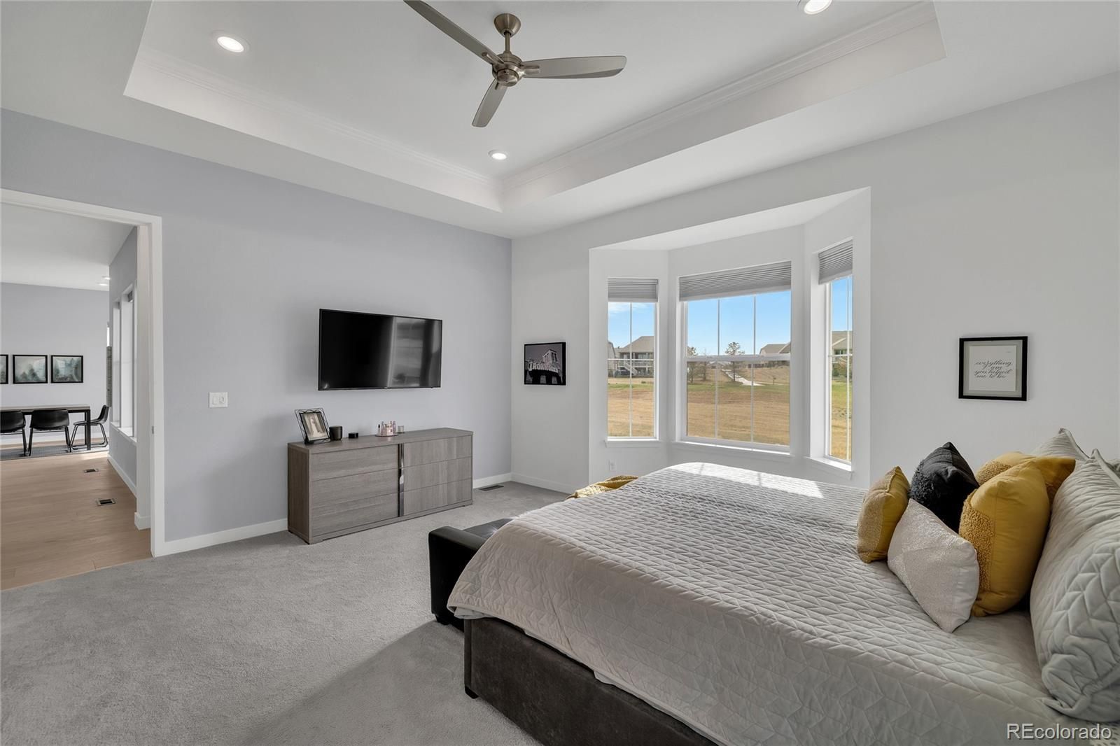 AMAZING VIEWS!, this home will leave you amazed and wanting more! Sitting on the 6th Tee Box with stunning course views, this 3 bedroom, 3 bath home has 2,117 SF on the main level plus an additional 2,117 SF of beautifully finished basement living area. Wide plank luxury vinyl floors & carpet, and tile run throughout the living areas of the main level. The kitchen has beautiful quartz countertops with a large island, pantry, gas cooktop, and stylish double ovens. There is a dining area just off the kitchen and both are open to a wonderful family room. With 12' ceilings, lots of windows and great light, and golf course views it is the perfect area for entertaining. The Primary Suite has a bay window and a high tray ceiling and features a Primary Bath accented by a custom glass shower door, large tiled shower and duel vanities. A large en suite bedroom features a full bath and large closest, perfect for out of town visitors; while a 3rd bedroom can double as an office or den. The family room, kitchen, and Primary Bedroom all have stunning fairway views! Need more space? The basement is magnificently finished with a large family area, 3 large rooms, and a nicely finished gym. Back on the main level walk out the back sliding door onto a large deck with a sprawling extended patio, plenty of room, back deck blinds that create the perfect outdoor living! This 55+ neighborhood is the ideal community for active adults offering an abundance of clubs, 2 pools (inside & outside), tennis and pickleball courts, and a wonderful restaurant and bar that offers a great place to gather with friends for happy hour or dinner. And of course there is fantastic golf course if you enjoy the Links! Come make HTC your new Home!