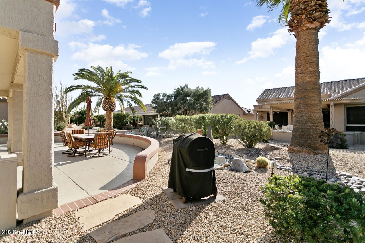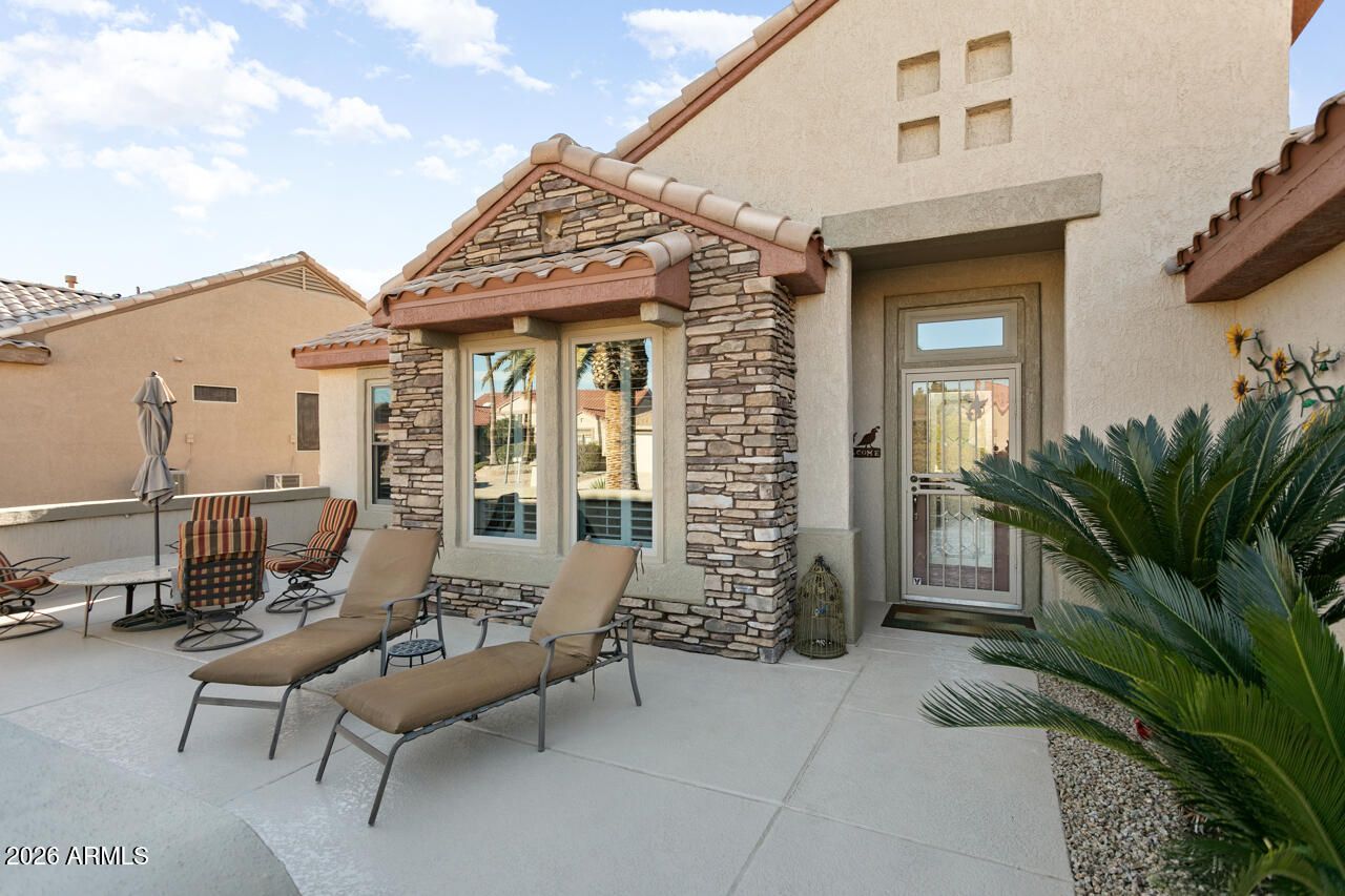 Beautifully upgraded Palo Verde. The curb appeal is special w/ a front courtyard & stone veneer and water feature. This split 2 bedroom, 2 bath home also offers a flexible den/office.Notice the beautiful crown molding! Kitchen features granite countertops, breakfast room, SS appliances, breakfast bar, pull-out drawers & shaker cabinet fronts. Primary suite has a bay window, updated bathroom w/ double sinks, granite counters & tiled shower. Guest bathroom was updated with granite counters & tiled shower. Inside laundry has cabinets for added storage. Plantation shutters on the Anderson windows, offer style and function. Roof (2022) Water heater (2020) HVAC (2025), RO,.Exterior Paint (2025). Extend your living area on this welcoming back patio w/ soothing water feature, built-in-BBQ, misting system & lush landscaping