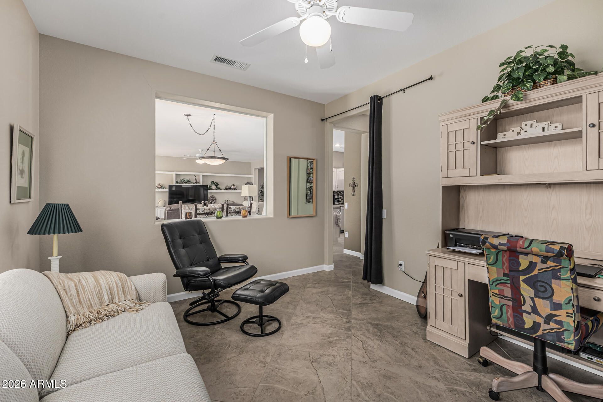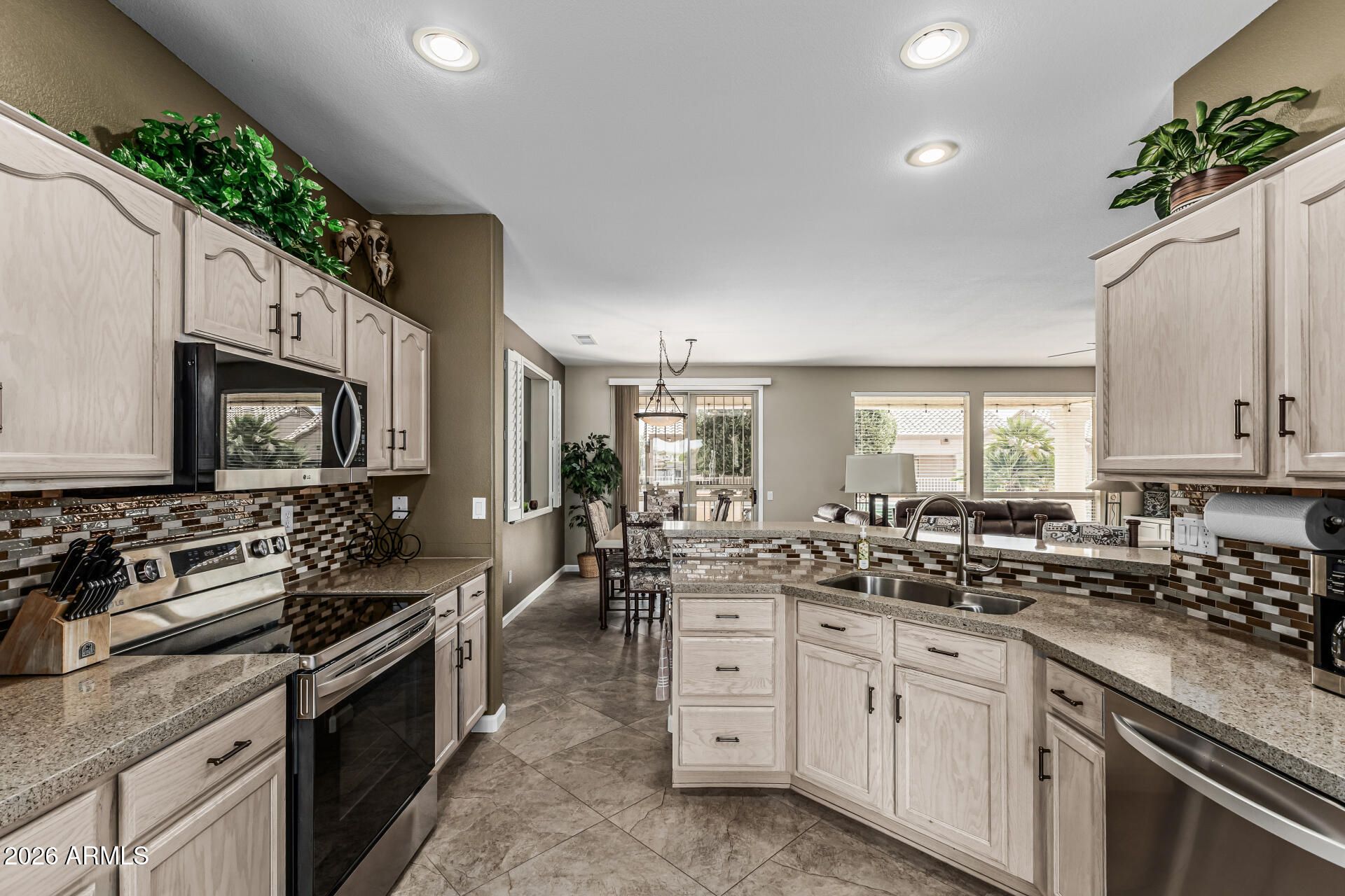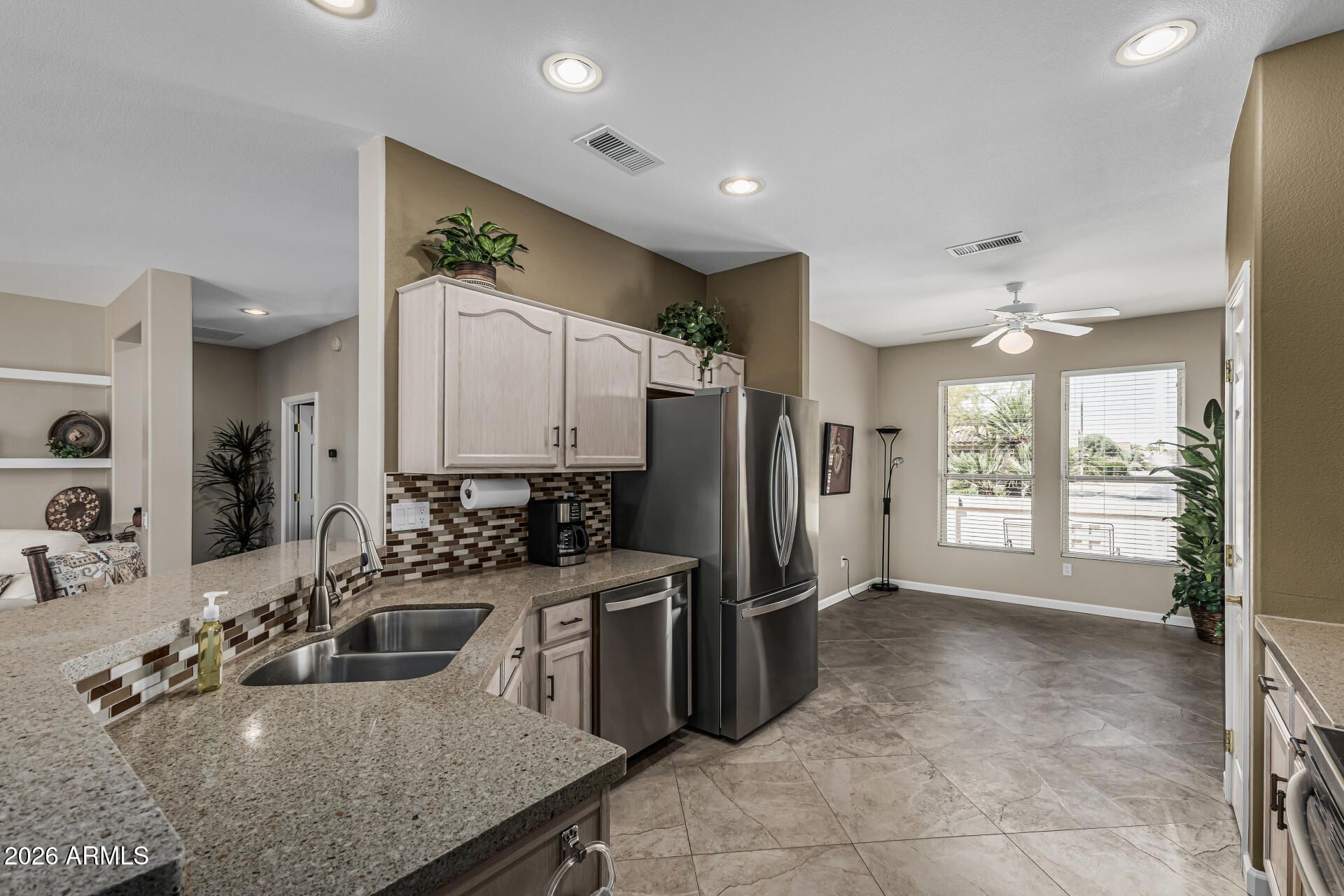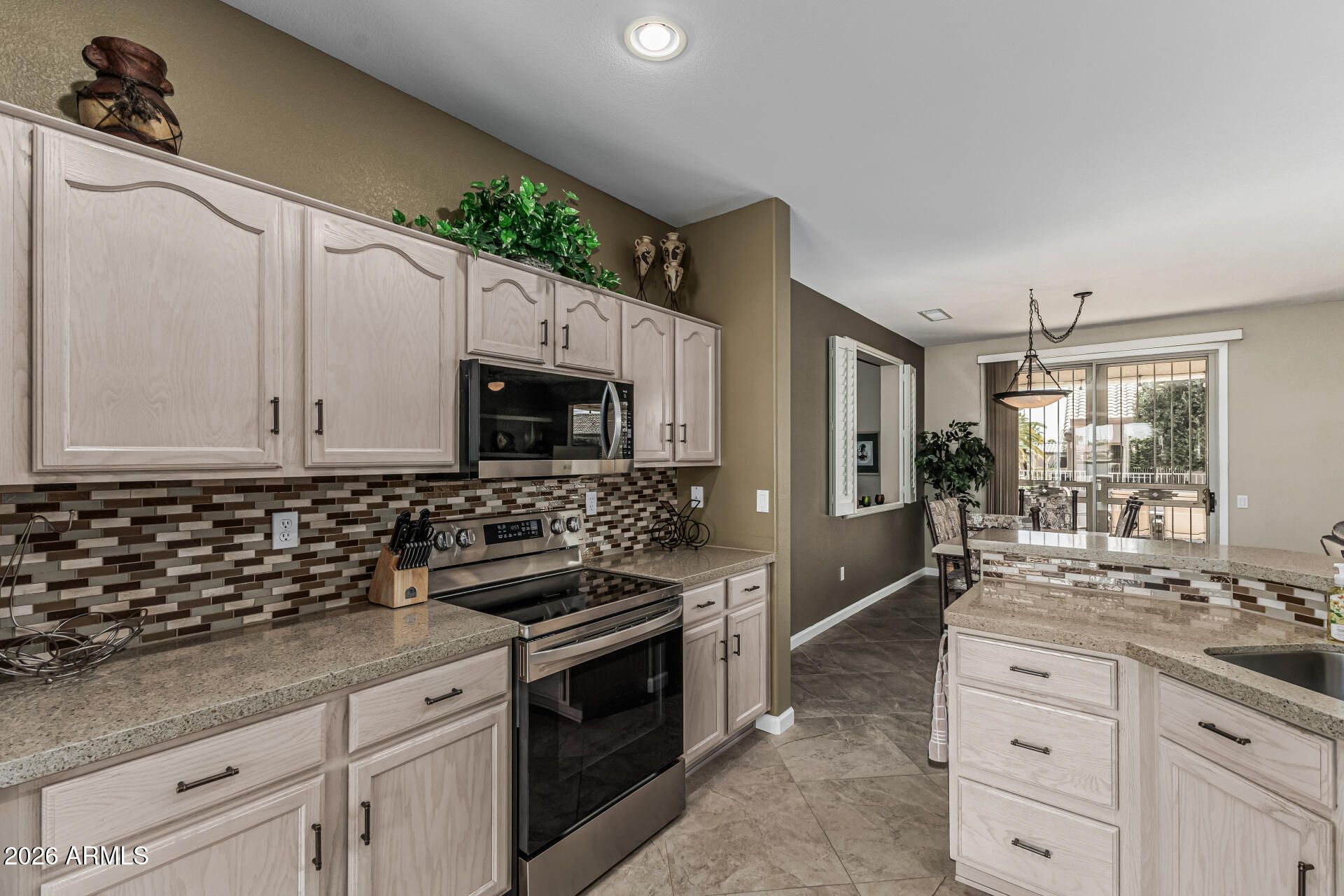Welcome Home!!! This gorgeous 2 bedroom 2 bath home at the desirable 55+ active community of Sun City Grand Desert Sage is in a fantastic location. Close to restaurants, shopping, parks, multiple golf courses & easy access to the 303 Fwy. As soon as you step into this home, you can see the Pride of Ownership with all that has been done. This elegant kitchen offers newer stainless steel appliances (2025), quartz counter tops, a breakfast bar, full height mosaic tiled backsplashes, a pantry & plenty of cabinetry for storage & organization. Your spacious master suite offers a plethora of natural light from your bay windows, a walk in closet, dual quartz vanity & a walk in shower. This home also offers 24x24 diamond laid tiled flooring, ceiling fans, a den/office area to utilize, a two car extended garage, roof replaced in Dec of 2024, front & back security doors for your privacy, as well as a low maintenance backyard with a large covered patio. Your community offers 4 - 18 hole Championship Golf Courses, a pet park, lawn bowling & horseshoe pits, walking & biking trails, multiple clubs & organization to be a part of, fitness centers & day spa, tennis, pickleball, bocce ball & softball fields, as well as a lakes to take a leisurely stroll around or cast your line out to catch the big one. This gem in the desert is a Great Buy & a Must See!!! **Furniture is available on a separate bill of sale.