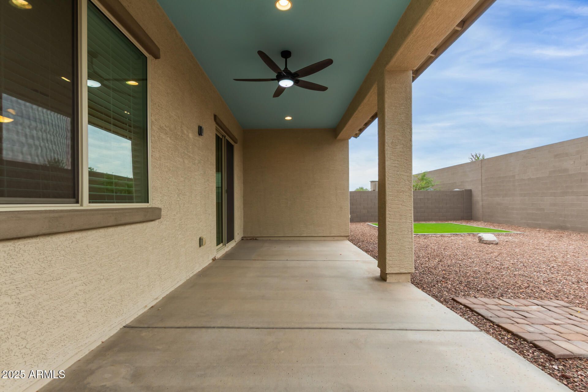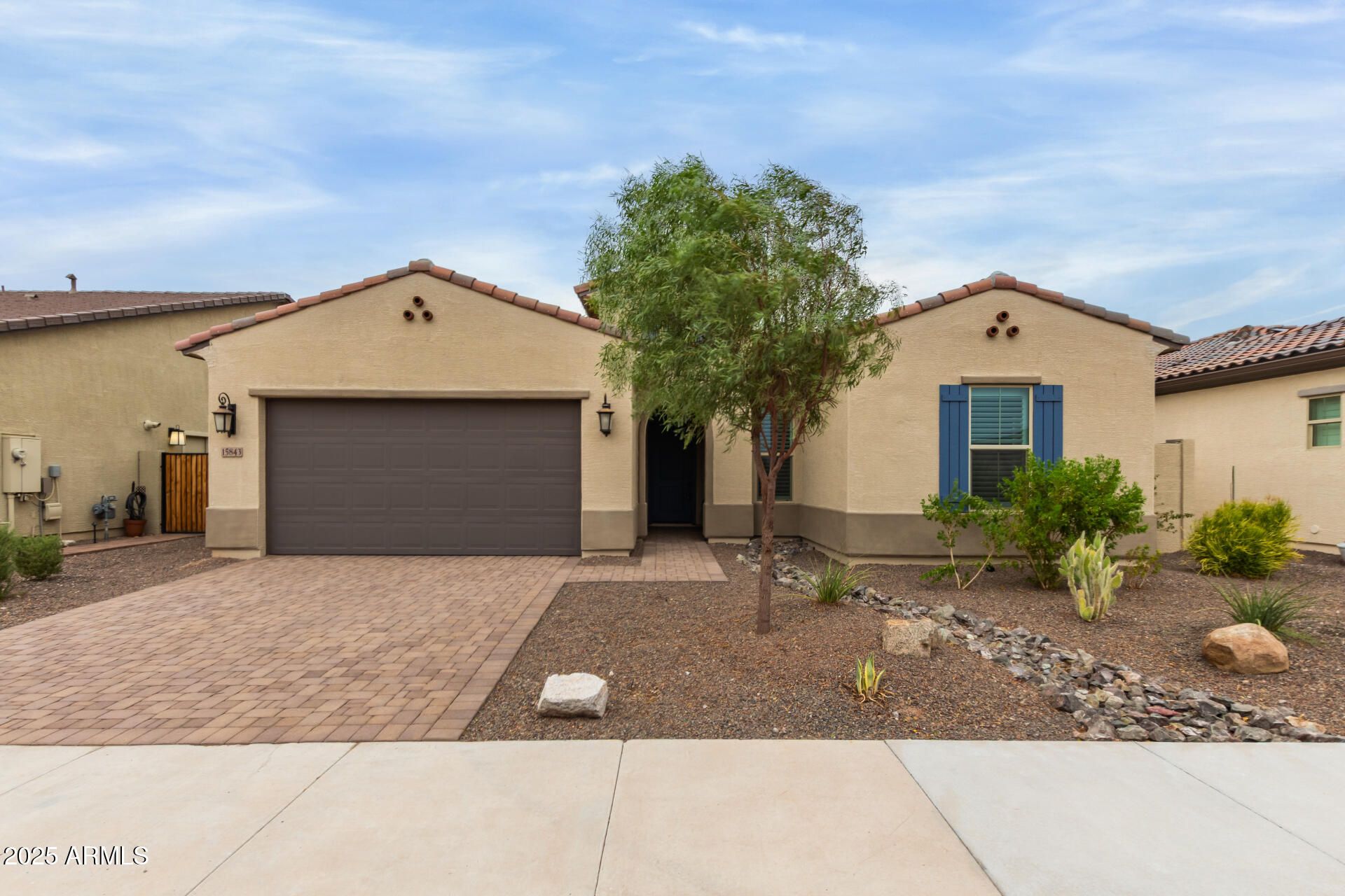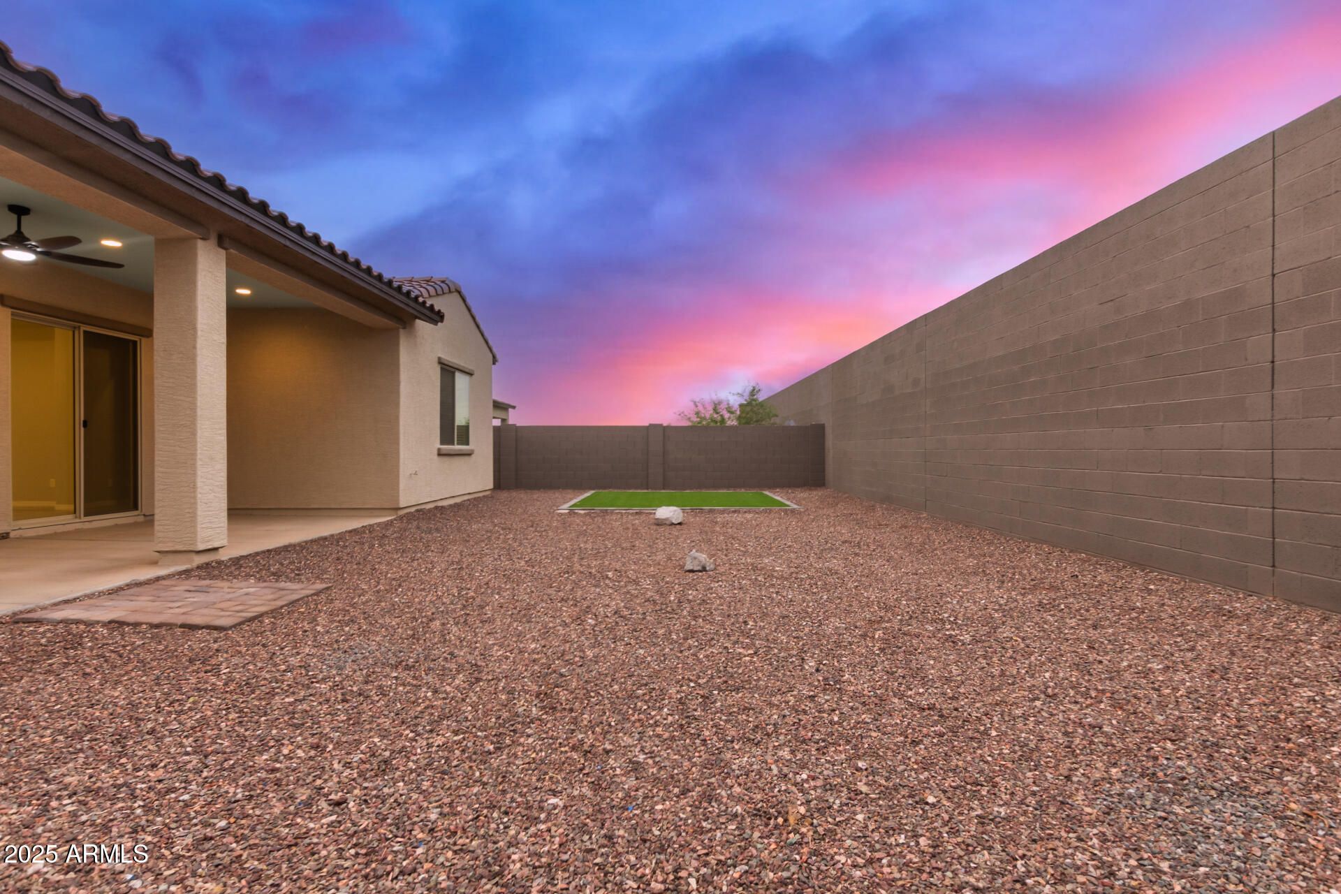 Nearly new and thoughtfully designed, this 2023-built home offers modern style, comfort, and convenience in the CantaMia community of Estrella Mountain Ranch. With over 2,300 sq. ft. of living space, this single-level home features a bright, open-concept layout highlighted by 9-foot ceilings and abundant natural light. A versatile flex space provides options for a home office, fitness room, or additional living area. Wood shutters add timeless character, while tile flooring throughout the main areas ensures durability and easy care. Bedrooms are carpeted for comfort. The gourmet kitchen is designed for everyday living, with a spacious island, granite countertops, custom backsplash, walk-in pantry, and stainless-steel appliances including a gas cooktop and wall oven. The primary suite is a private retreat with a spa-style bath featuring a soaking tub, separate shower, dual vanities, and a walk-in closet. The backyard, enclosed with a block wall, offers privacy and desert landscaping.