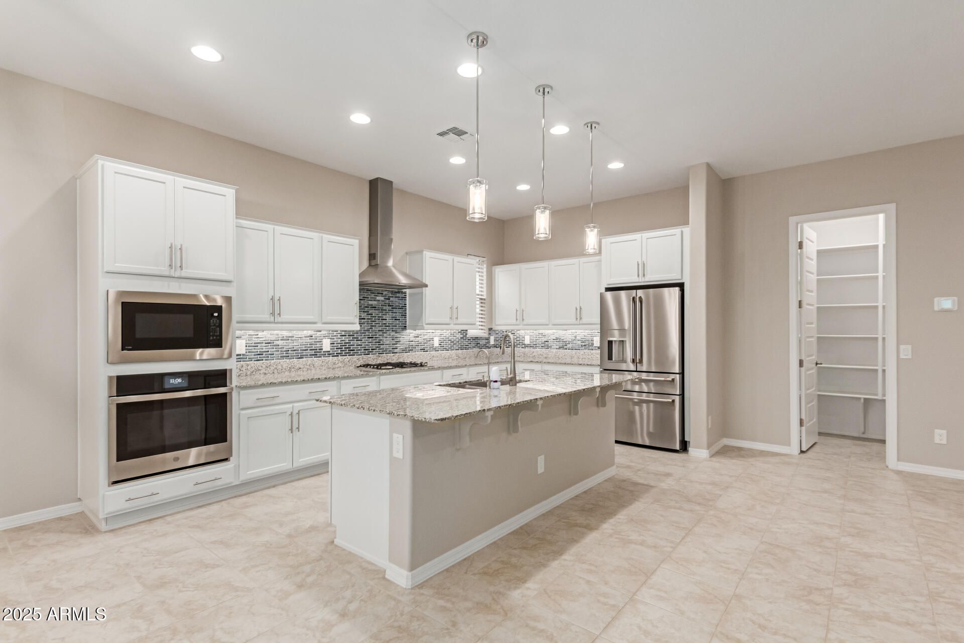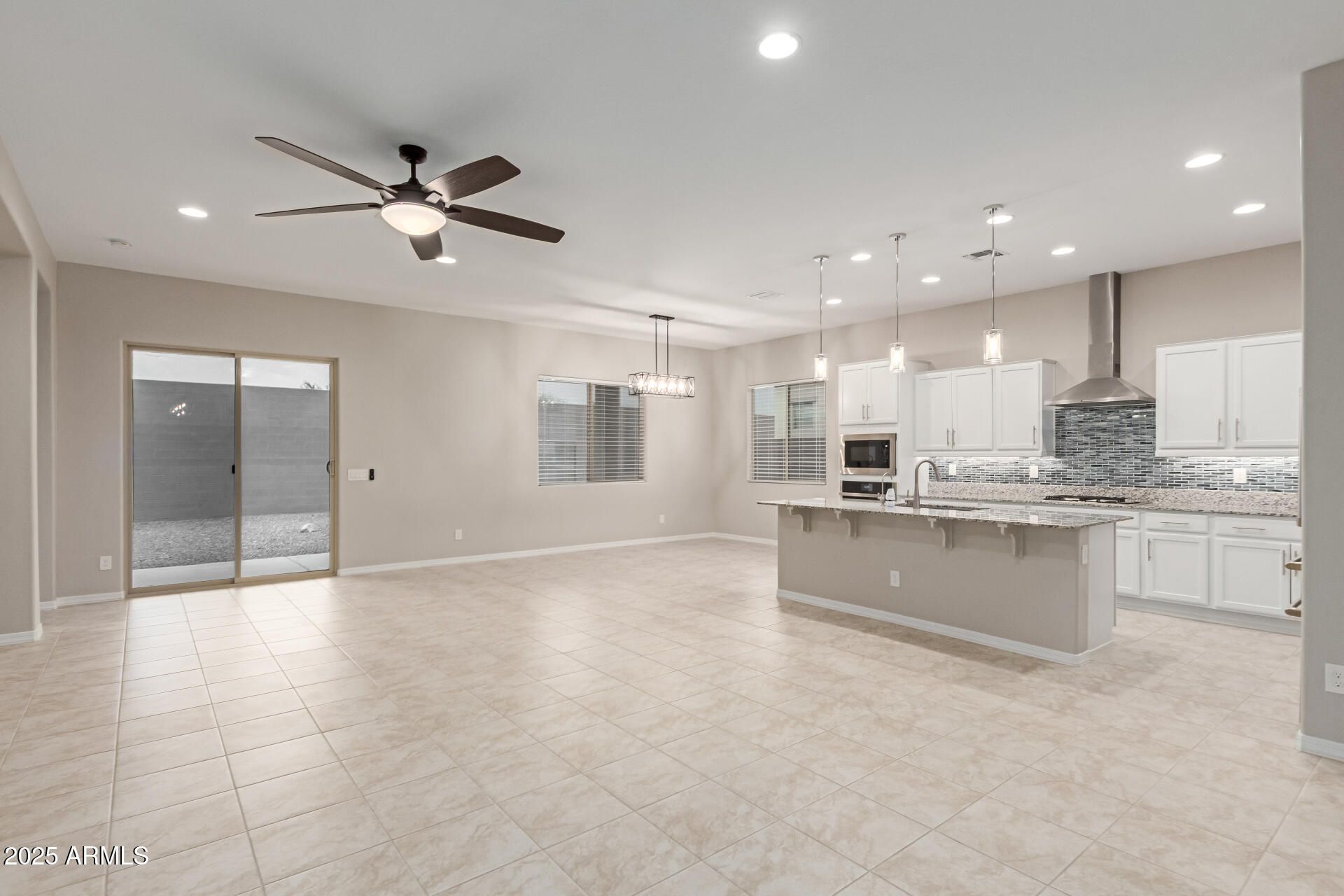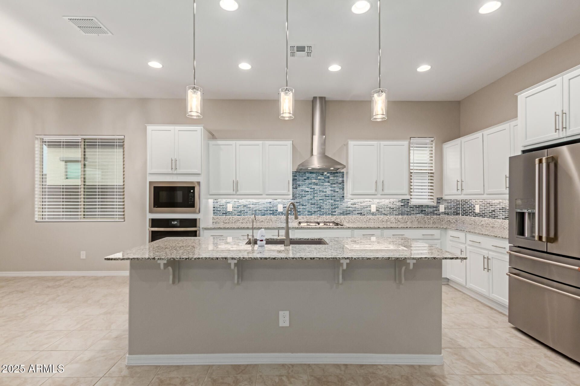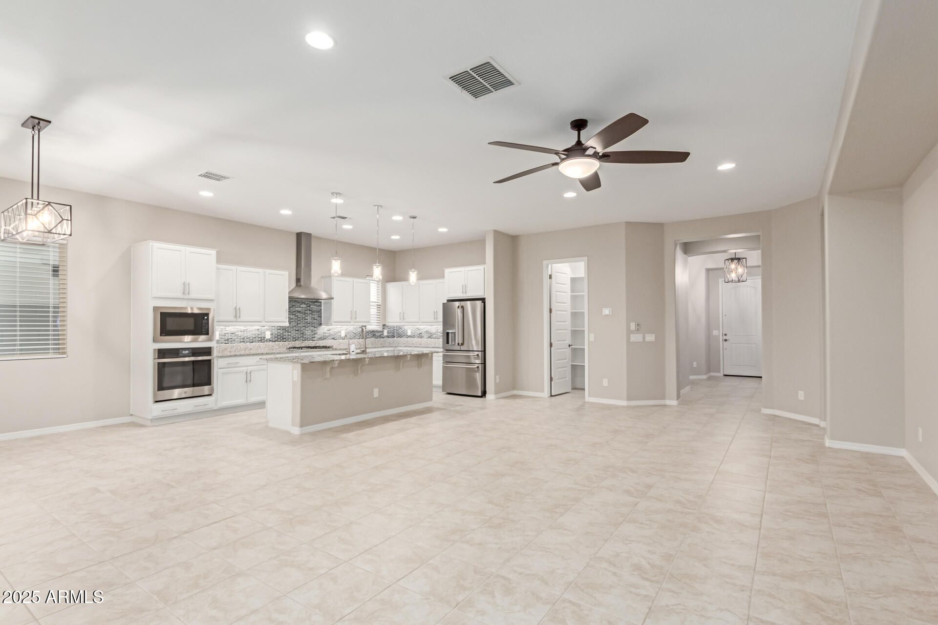 Nearly new and thoughtfully designed, this 2023-built home offers modern style, comfort, and convenience in the CantaMia community of Estrella Mountain Ranch. With over 2,300 sq. ft. of living space, this single-level home features a bright, open-concept layout highlighted by 9-foot ceilings and abundant natural light. A versatile flex space provides options for a home office, fitness room, or additional living area. Wood shutters add timeless character, while tile flooring throughout the main areas ensures durability and easy care. Bedrooms are carpeted for comfort. The gourmet kitchen is designed for everyday living, with a spacious island, granite countertops, custom backsplash, walk-in pantry, and stainless-steel appliances including a gas cooktop and wall oven. The primary suite is a private retreat with a spa-style bath featuring a soaking tub, separate shower, dual vanities, and a walk-in closet. The backyard, enclosed with a block wall, offers privacy and desert landscaping.