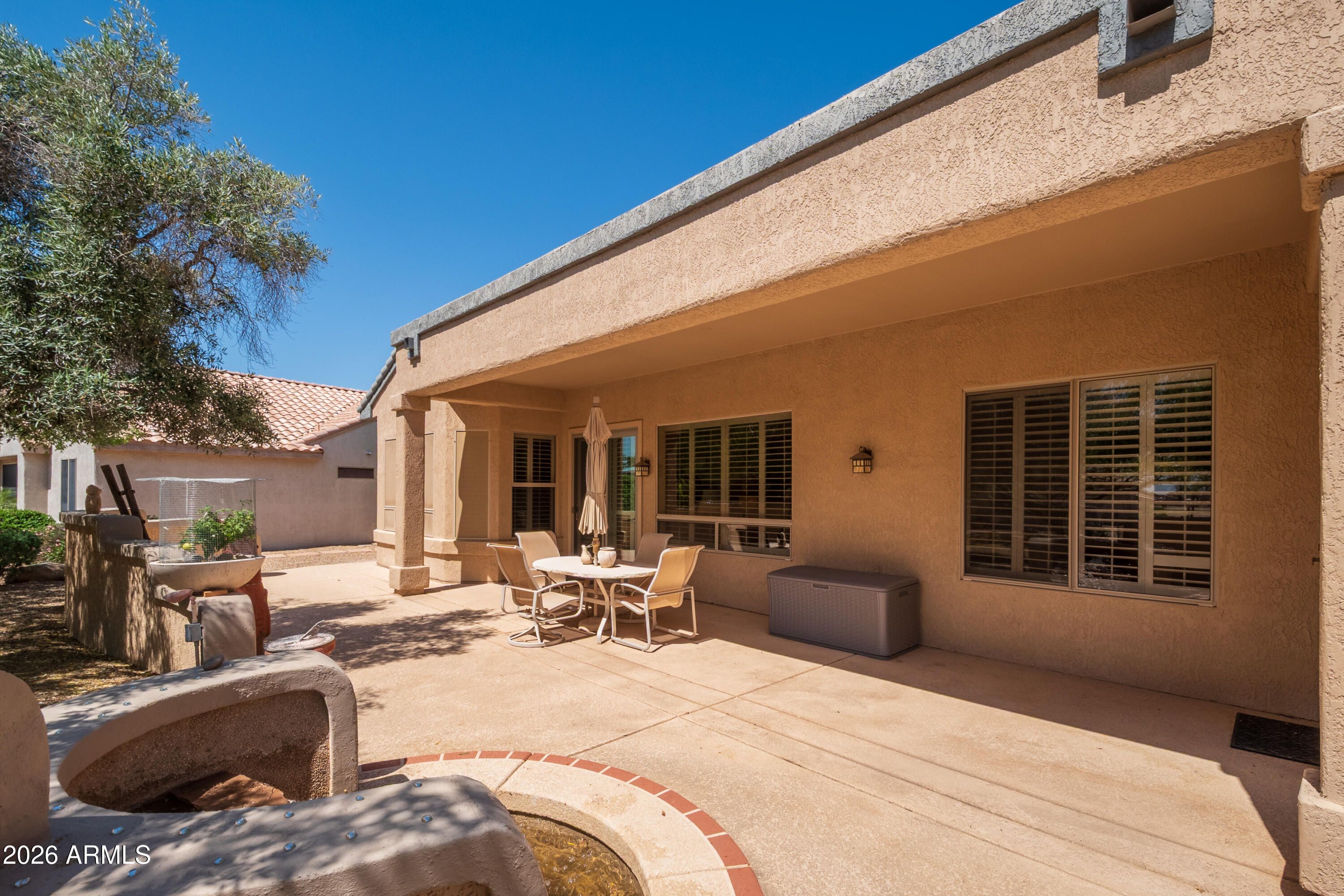 Beautiful Sun City Grand home featuring 2 bedrooms plus a den, with the guest bedroom offering a private ensuite. Tile and carpet are thoughtfully placed throughout. Large Great Room with Bay Window in eating area. Separate Dining Room has built-in storage together with shutters and entry door making it flexible space to use as a den, hobby room, etc. The kitchen boasts Corian countertops, an island, and abundant cabinetry. Spacious laundry room includes a utility sink and folding counter. The primary suite features a bay window and direct patio access. Extended 2-car garage includes a golf cart bump-out, built-in cabinets, and workbench. North/South exposure with backyard facing south. Enjoy outdoor living on the expansive covered patio complete with a water feature.
