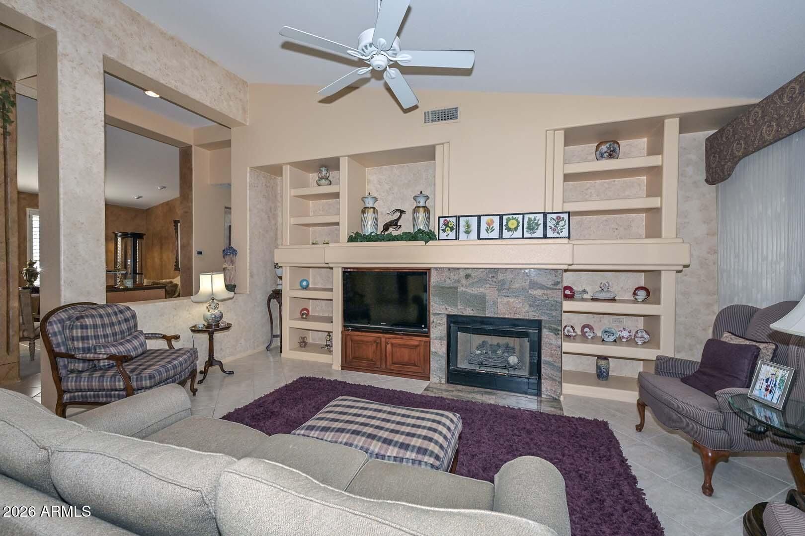 Welcome to resort-style living in The Grand! This beautifully designed 2-bedroom+den, 2-bath home offers comfort, space, and flexibility with a rare 3-car garage. Inside, are formal living and dining rooms, soaring vaulted ceilings, and a thoughtfully designed layout ideal for both everyday living and entertaining. The kitchen features an island and ample cabinetry which opens to the great room, where a cozy fireplace creates a warm and inviting focal point. The den provides the perfect space for a home office, hobby room, or guest overflow. Step outside to a private backyard with mature, easy-care landscaping, a covered patio, and a relaxing spool—perfect for enjoying Arizona's beautiful weather year-round. Located in The Grand, one of the West Valley's premier active adult communities, residents enjoy an unparalleled lifestyle with multiple championship golf courses, state-of-the-art fitness centers, resort-style pools and spas, tennis and pickleball courts, walking trails, and countless clubs and social activities. The community also features on-site dining, arts and crafts studios, and a full calendar of events designed to keep life active, social, and fun.