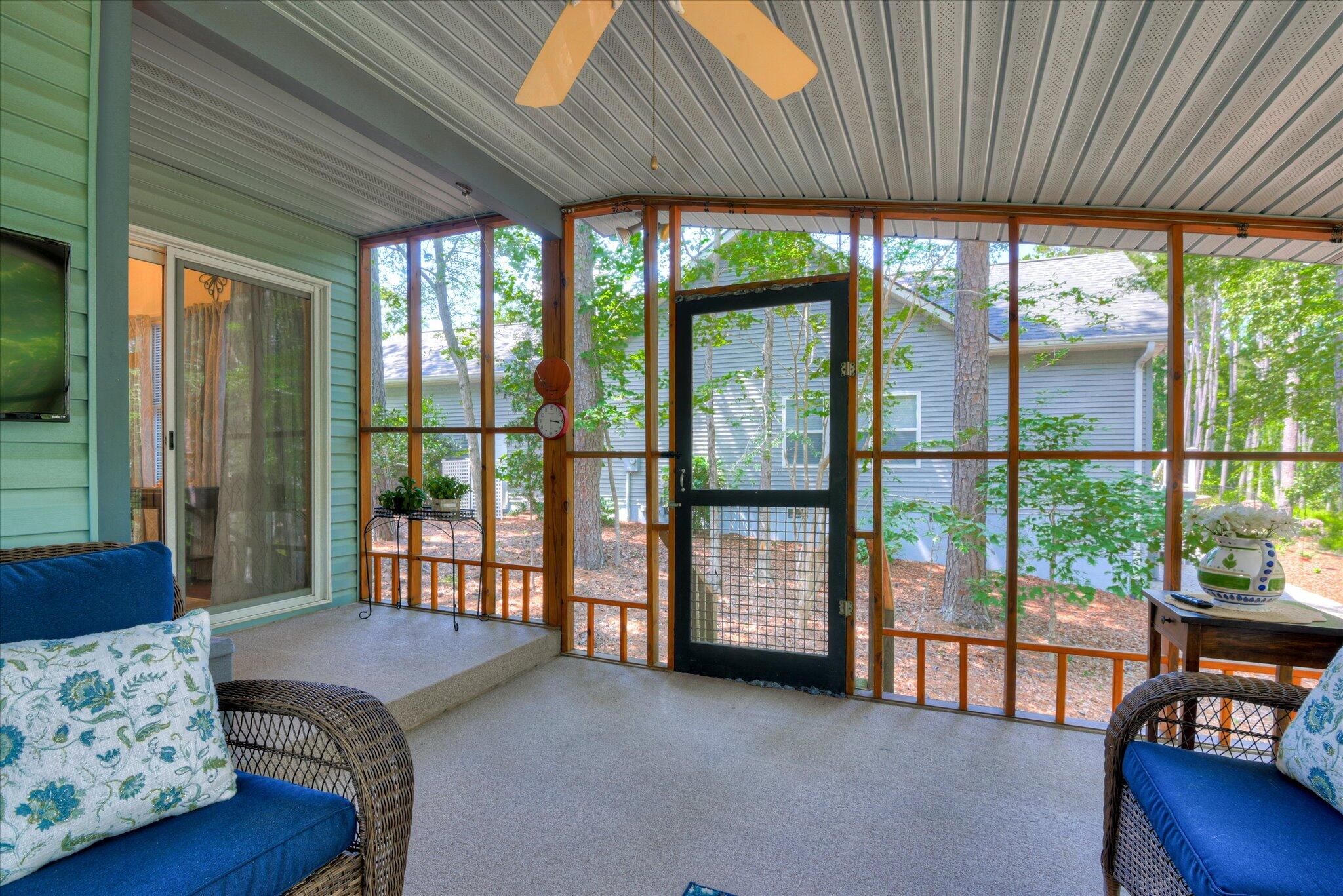 This home is a MUST SEE, perfect retreat for a privacy seeking single or second home. This 2 bedroom, 2 bath home, with an attached two-car garage, has all the amenities without wasted space. It sits on a tree'd lot with a feeling of privacy and a connection to nature. The back abuts reserved land and the mature forest provides cooling shade. A large screened and carpeted porch that wraps around the back corner provides a protected outdoor space to enjoy time to relax. The tiled kitchen and baths and the deep wood tones of the LVT in the rest of the house, the vaulted ceilings and fresh paint in the dining area and family room, provide an upscale environment. Details like the center island, pantry cabinet and new fridge in the kitchen, the pass-through from the kitchen to dining area and the floor outlets in the fireplaced family room, enhance your living space even further. This idyllic home is located in the desirable Tara neighborhood in Savannah Lakes Village. Living here means you are part of a vibrant and active community, which includes access to WCTEL's high-speed gigabit fiber network. Nearby Lake Thurmond provides some of the best freshwater fishing the southeast has to offer. Within the village you will find all of the on-site amenities it has to offer - several eateries, 2 premier golf courses, tennis, pickleball, indoor and outdoor pools with hot tub and sauna, fitness facility, walking trails and so much more. Come home to your dream lifestyle.