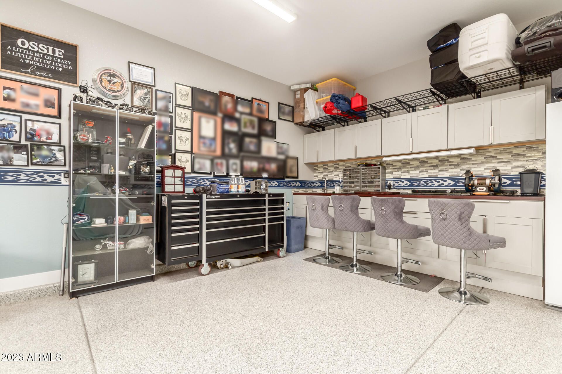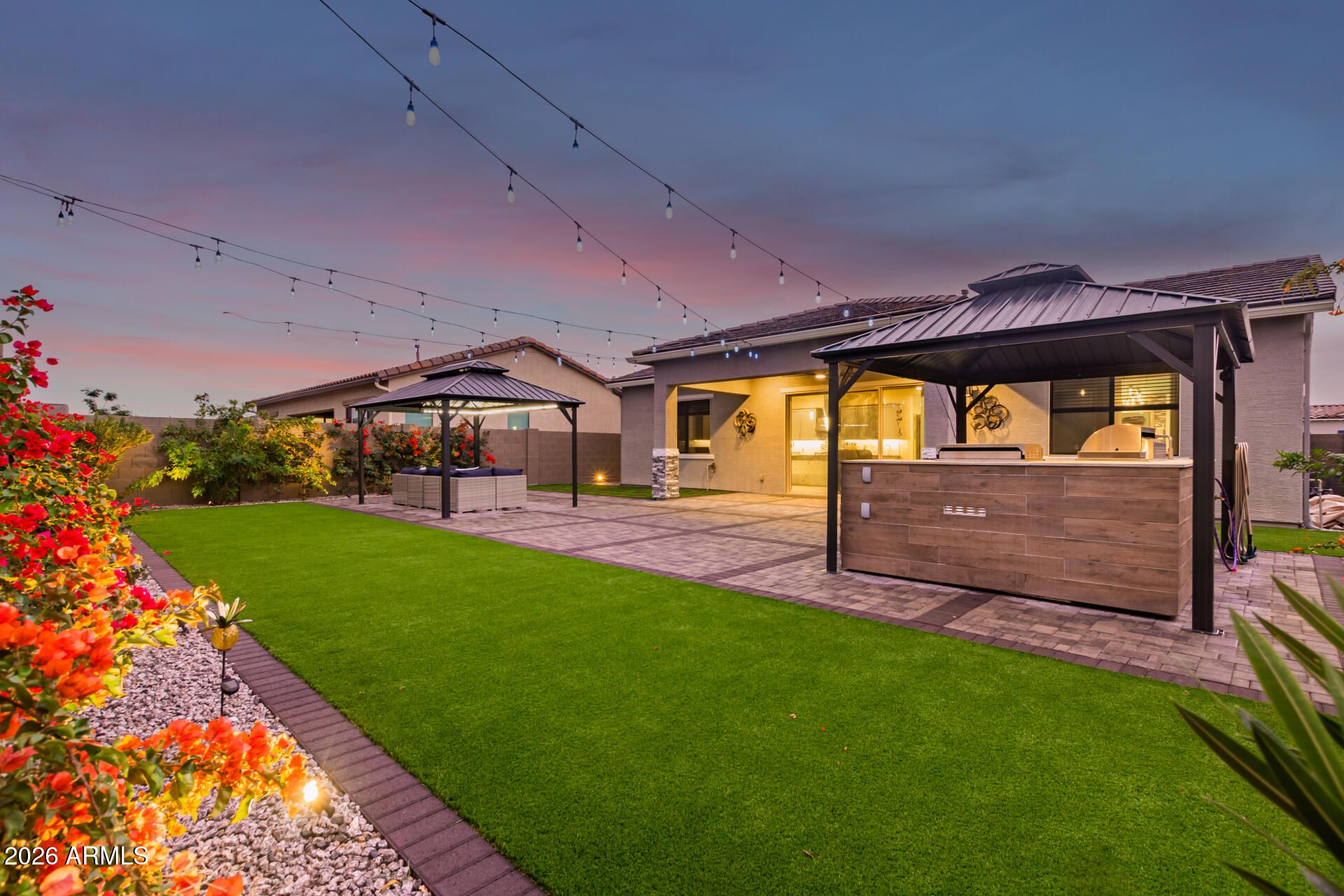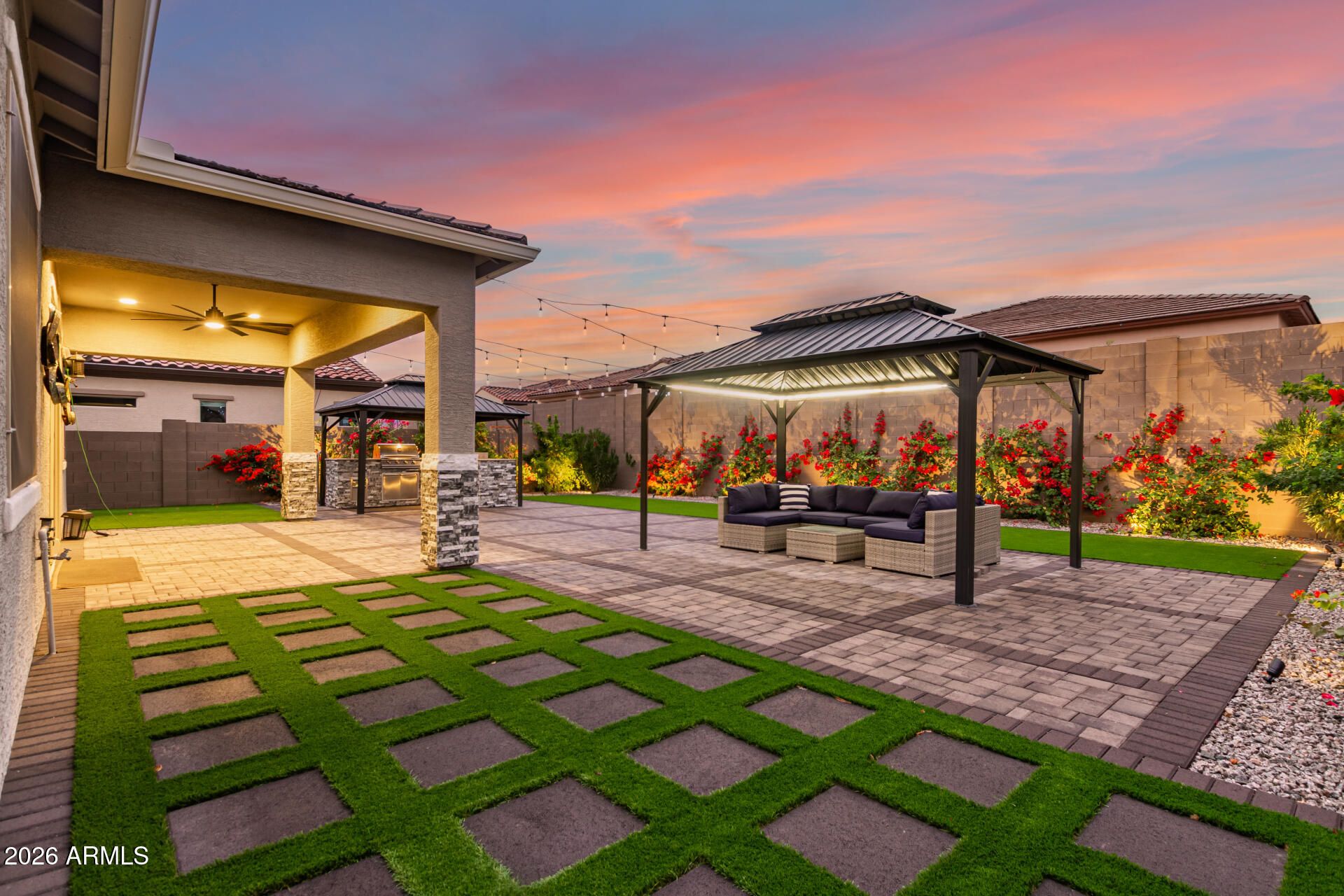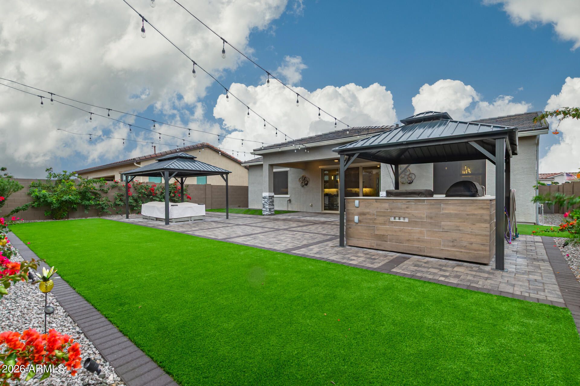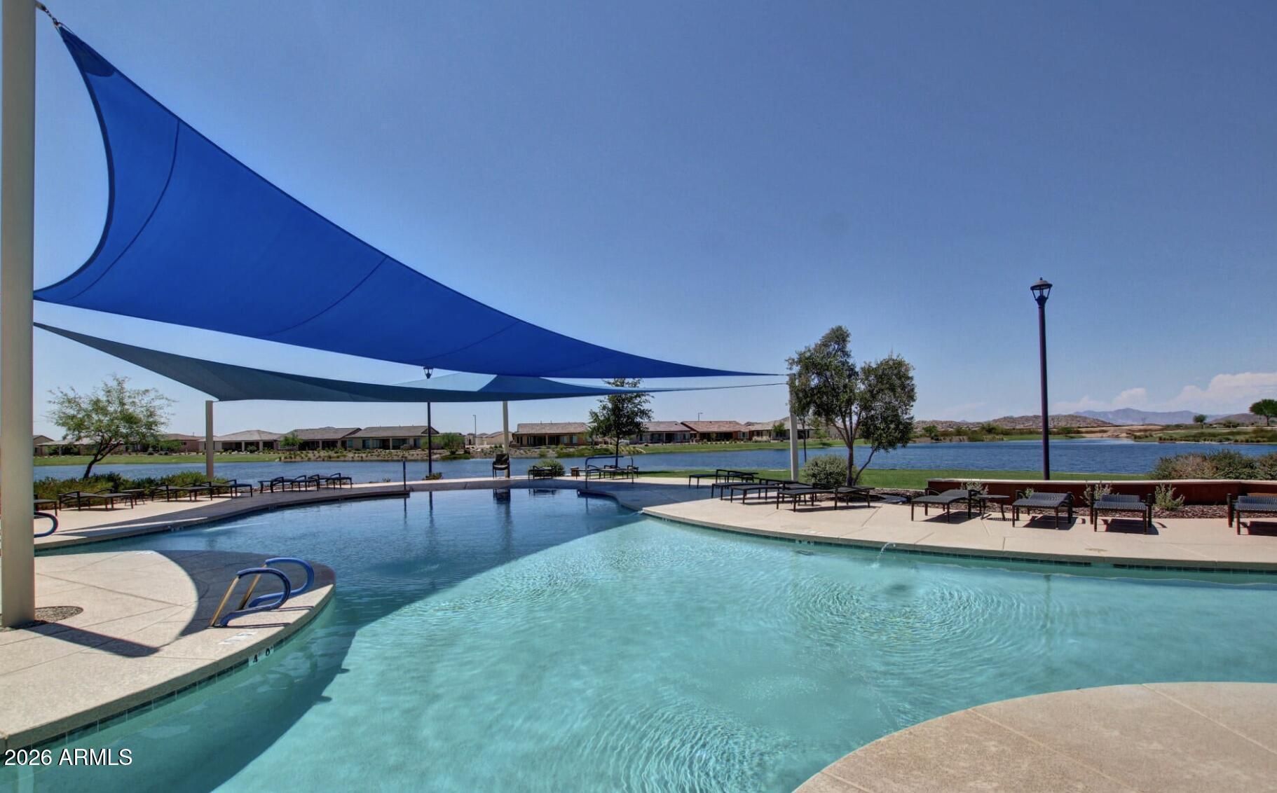 Impeccably upgraded and truly move-in ready, this exceptional home features over $100k + in thoughtfully curated, high-end enhancements, with every detail intentionally designed and flawlessly executed. Striking designer landscaping creates unforgettable curb appeal and sets the tone from the moment you arrive. The heart of the home is a chef-inspired kitchen with premium Café appliances, custom finishes, and a layout that blends beauty and function ideal for both everyday living and entertaining. The primary retreat offers a serene escape, highlighted by a spa-like ensuite with an indulgent shower and refined finishes throughout. Outdoors, a resort-style backyard invites year-round enjoyment with an outdoor kitchen, multiple pergolas, and spaces designed for both relaxation & gathering. The garage is a standout feature, offering epoxy flooring, a dedicated work area, and custom built-in storage, perfectly designed for organization, hobbies, and functionality. Added bonus, a whole-home water filtration and softening system, adding comfort and long-term value. Located in one of Goodyear's most desirable 55+ active adult communities. Community amenities include 29,000. sqft Village Center, Cafe & Bar, 2,000 sqft Fitness Room, Aerobic & Yoga Room, Locker Rooms, Tech Wing, Event Room, Art Studio, Dog Park, Pickleball Courts, Bocce Ball Courts, Tennis Courts, Hiking /Biking Trails. Don't miss the opportunity to make this exquisite residence your own and experience luxury living at its finest!