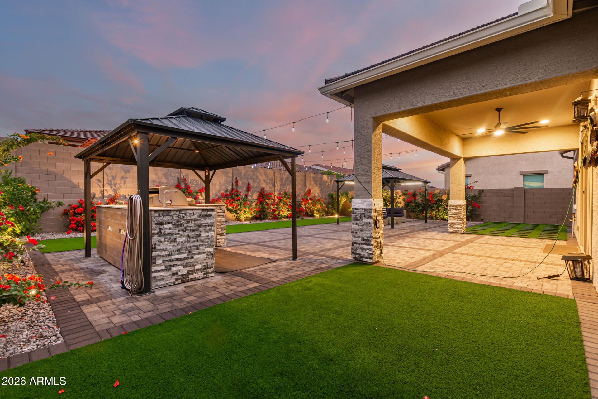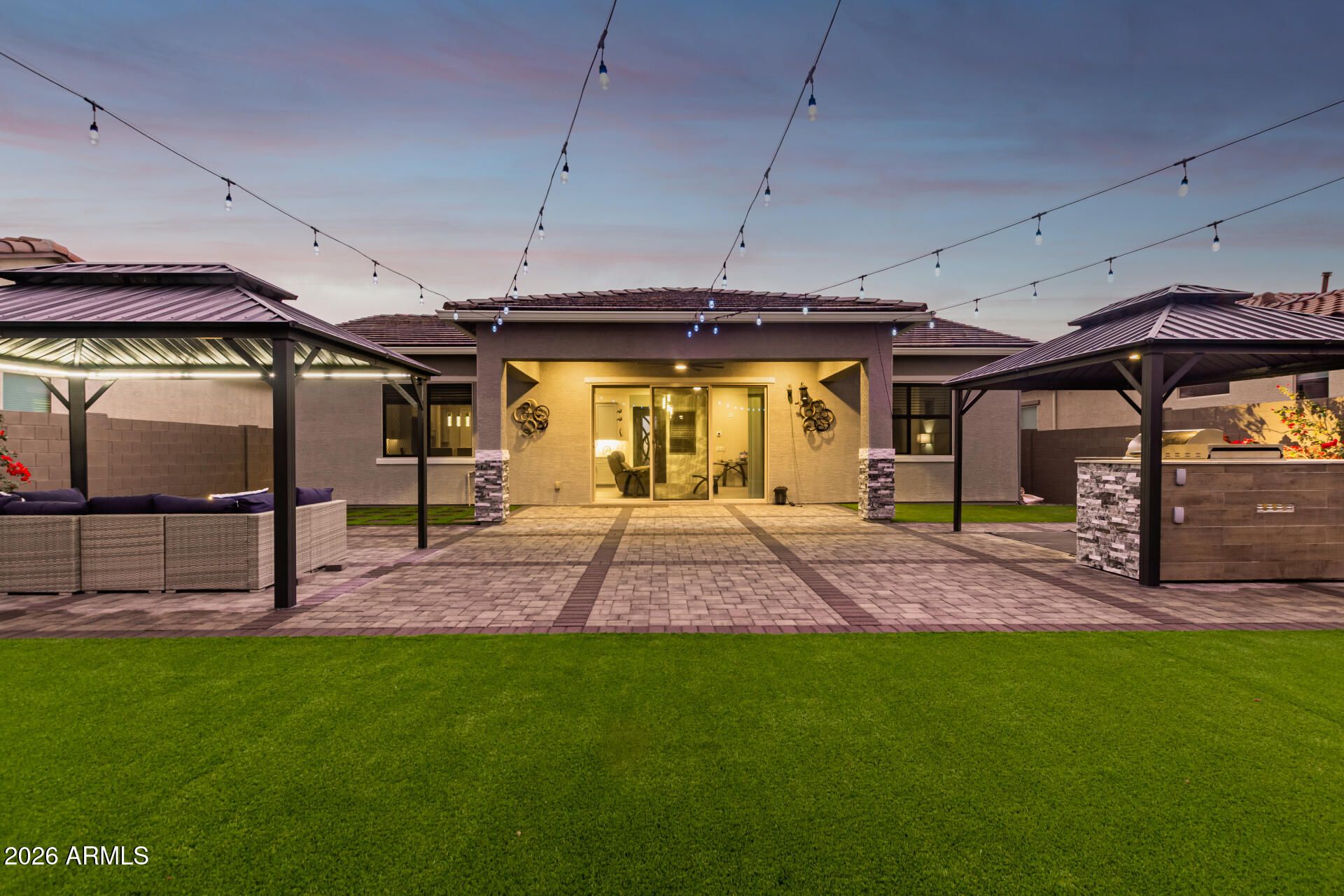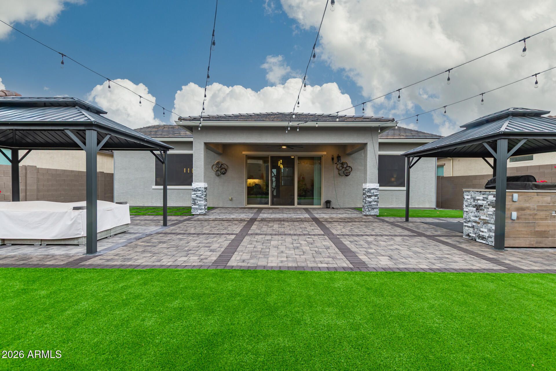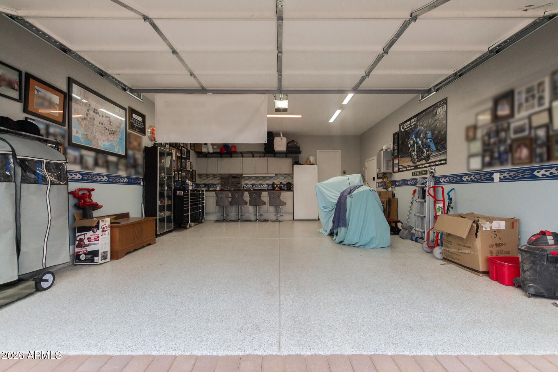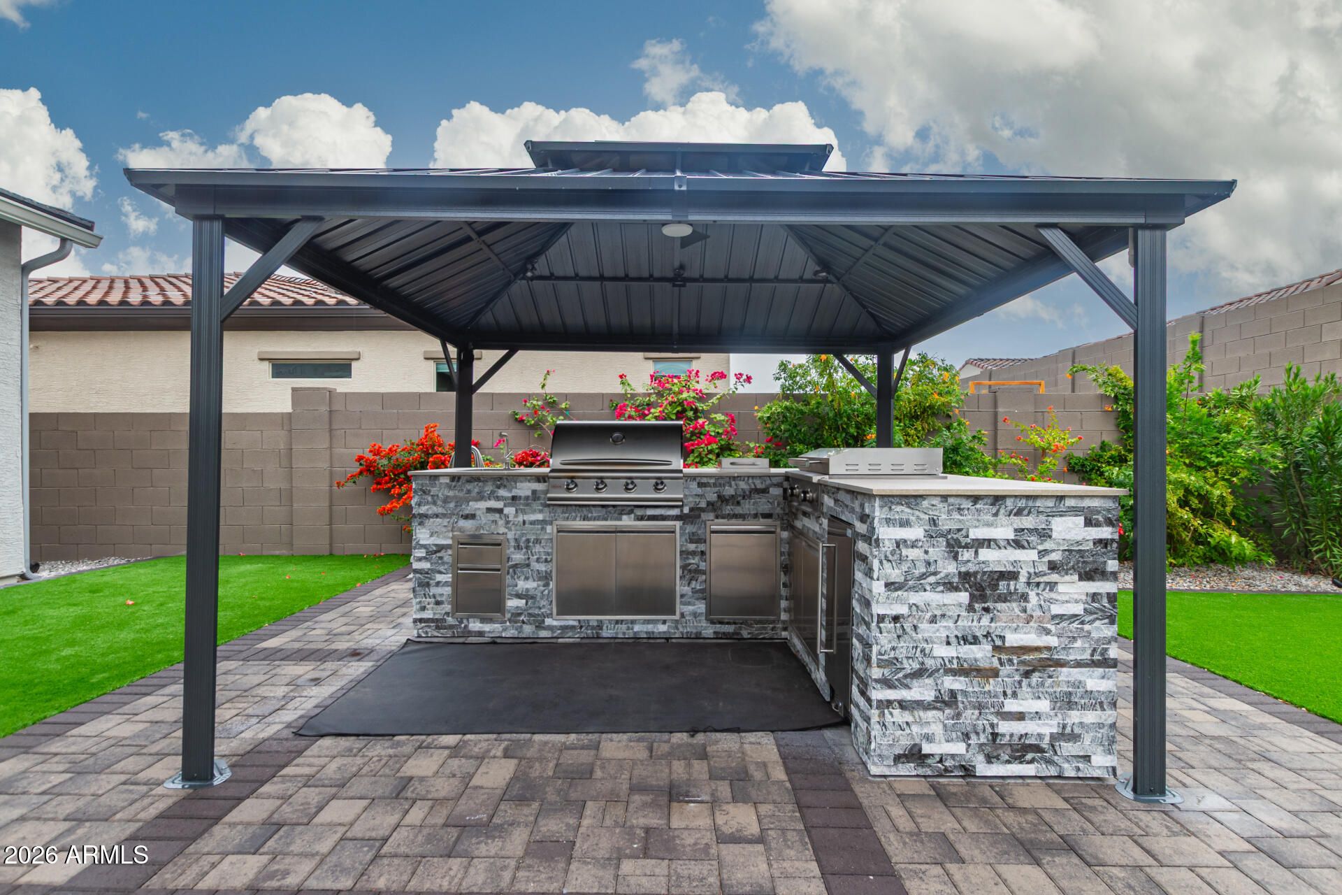 Impeccably upgraded and truly move-in ready, this exceptional home features over $100k + in thoughtfully curated, high-end enhancements, with every detail intentionally designed and flawlessly executed. Striking designer landscaping creates unforgettable curb appeal and sets the tone from the moment you arrive. The heart of the home is a chef-inspired kitchen with premium Café appliances, custom finishes, and a layout that blends beauty and function ideal for both everyday living and entertaining. The primary retreat offers a serene escape, highlighted by a spa-like ensuite with an indulgent shower and refined finishes throughout. Outdoors, a resort-style backyard invites year-round enjoyment with an outdoor kitchen, multiple pergolas, and spaces designed for both relaxation & gathering. The garage is a standout feature, offering epoxy flooring, a dedicated work area, and custom built-in storage, perfectly designed for organization, hobbies, and functionality. Added bonus, a whole-home water filtration and softening system, adding comfort and long-term value. Located in one of Goodyear's most desirable 55+ active adult communities. Community amenities include 29,000. sqft Village Center, Cafe & Bar, 2,000 sqft Fitness Room, Aerobic & Yoga Room, Locker Rooms, Tech Wing, Event Room, Art Studio, Dog Park, Pickleball Courts, Bocce Ball Courts, Tennis Courts, Hiking /Biking Trails. Don't miss the opportunity to make this exquisite residence your own and experience luxury living at its finest!