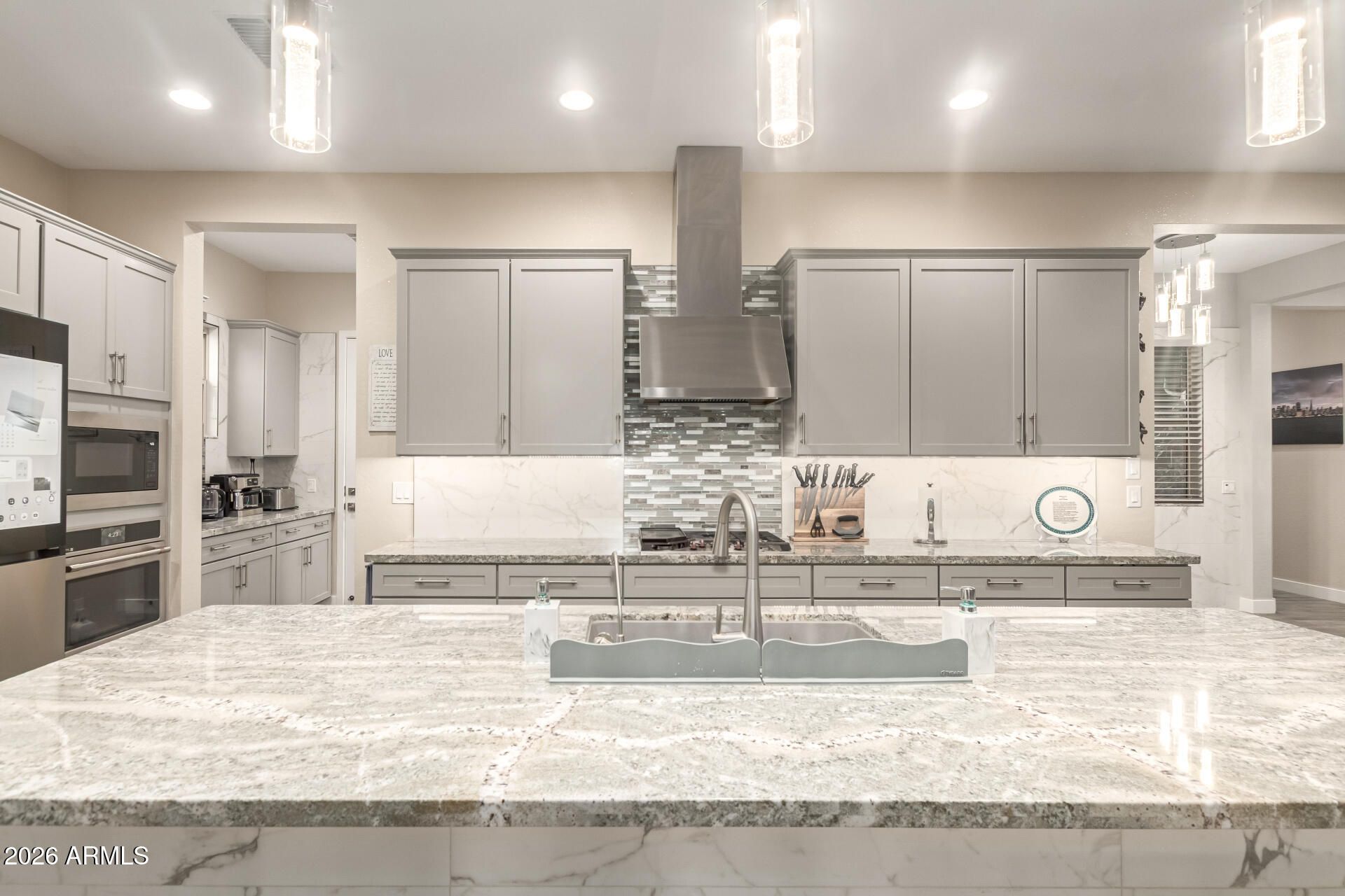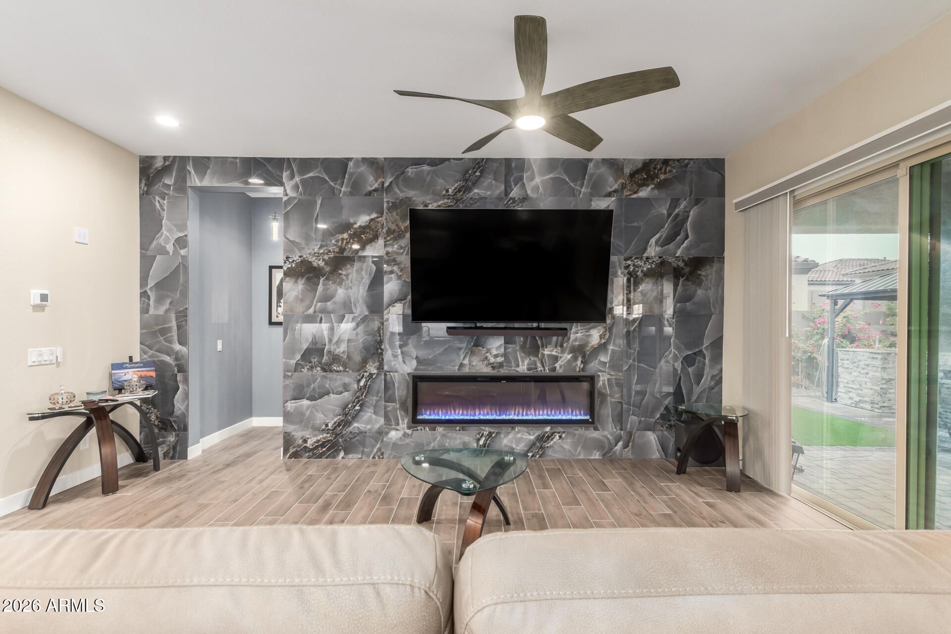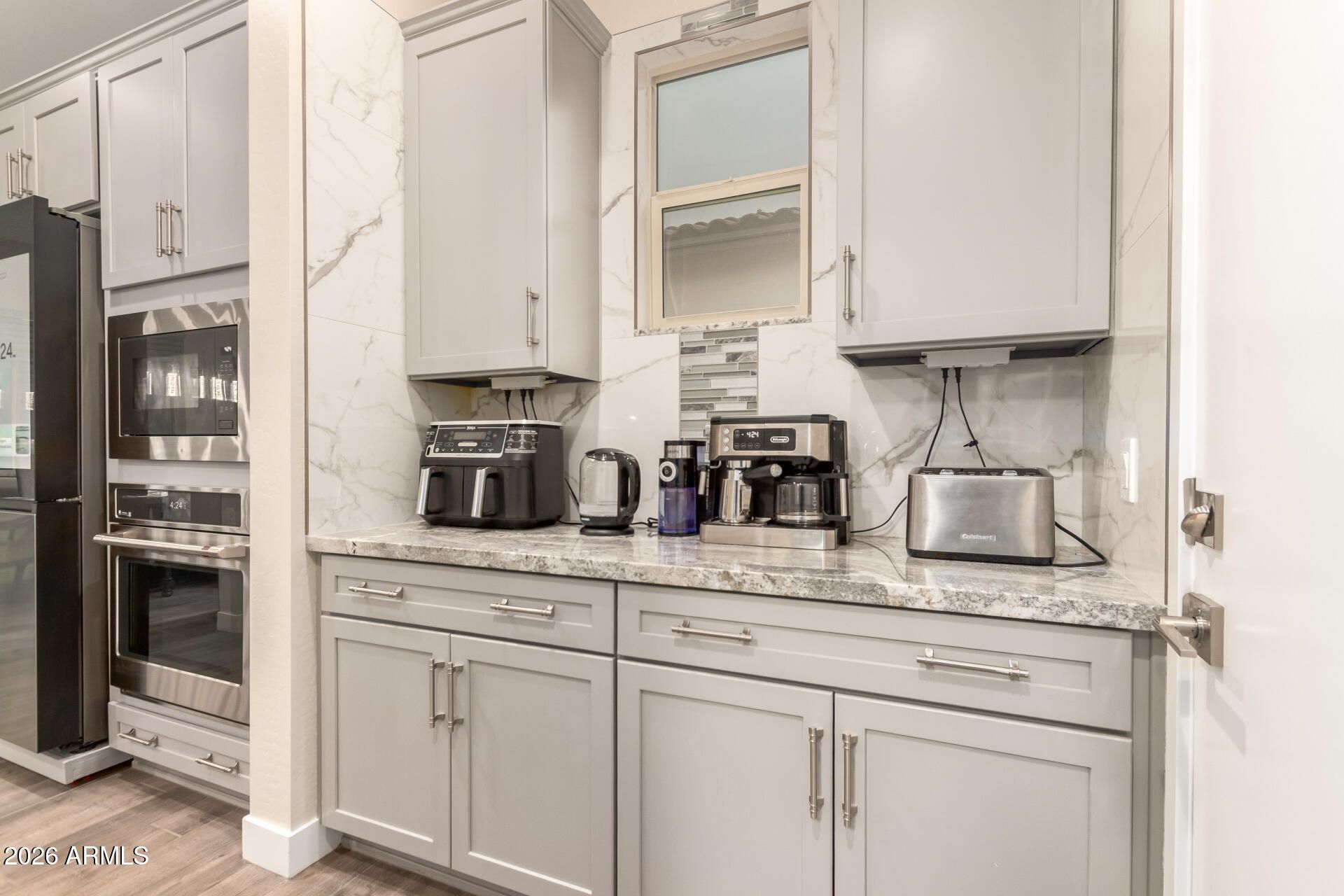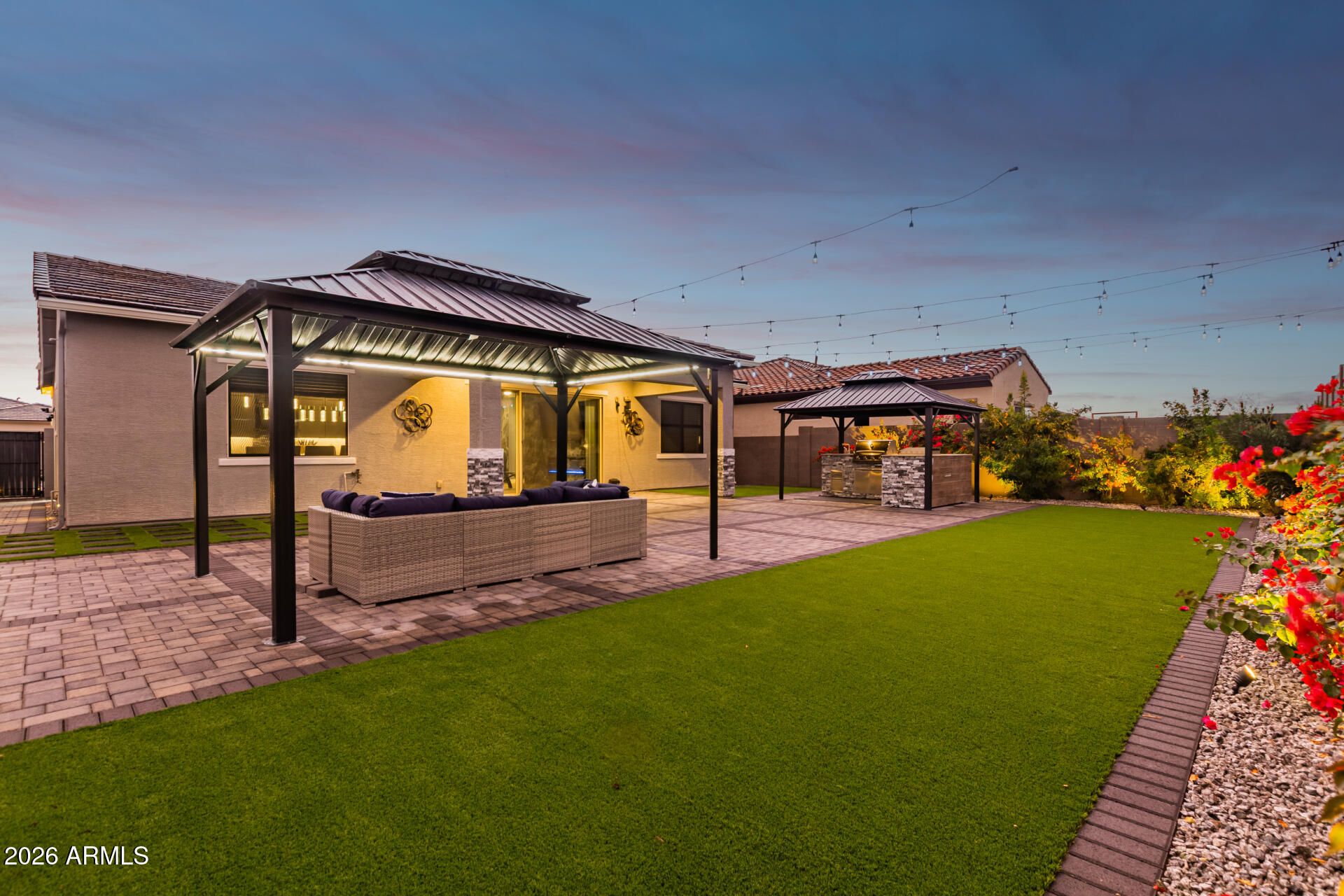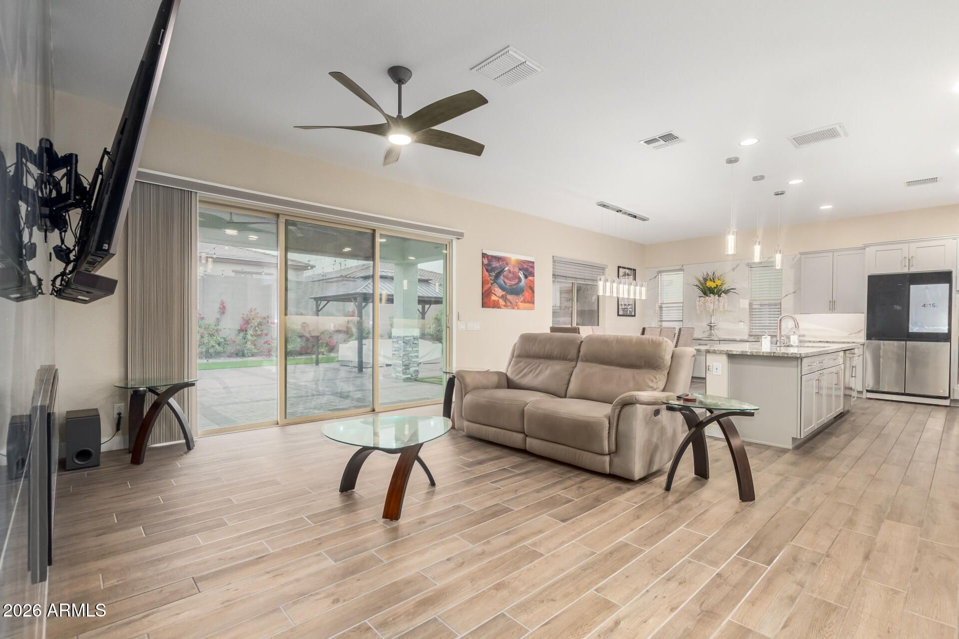 Impeccably upgraded and truly move-in ready, this exceptional home features over $100k + in thoughtfully curated, high-end enhancements, with every detail intentionally designed and flawlessly executed. Striking designer landscaping creates unforgettable curb appeal and sets the tone from the moment you arrive. The heart of the home is a chef-inspired kitchen with premium Café appliances, custom finishes, and a layout that blends beauty and function ideal for both everyday living and entertaining. The primary retreat offers a serene escape, highlighted by a spa-like ensuite with an indulgent shower and refined finishes throughout. Outdoors, a resort-style backyard invites year-round enjoyment with an outdoor kitchen, multiple pergolas, and spaces designed for both relaxation & gathering. The garage is a standout feature, offering epoxy flooring, a dedicated work area, and custom built-in storage, perfectly designed for organization, hobbies, and functionality. Added bonus, a whole-home water filtration and softening system, adding comfort and long-term value. Located in one of Goodyear's most desirable 55+ active adult communities. Community amenities include 29,000. sqft Village Center, Cafe & Bar, 2,000 sqft Fitness Room, Aerobic & Yoga Room, Locker Rooms, Tech Wing, Event Room, Art Studio, Dog Park, Pickleball Courts, Bocce Ball Courts, Tennis Courts, Hiking /Biking Trails. Don't miss the opportunity to make this exquisite residence your own and experience luxury living at its finest!