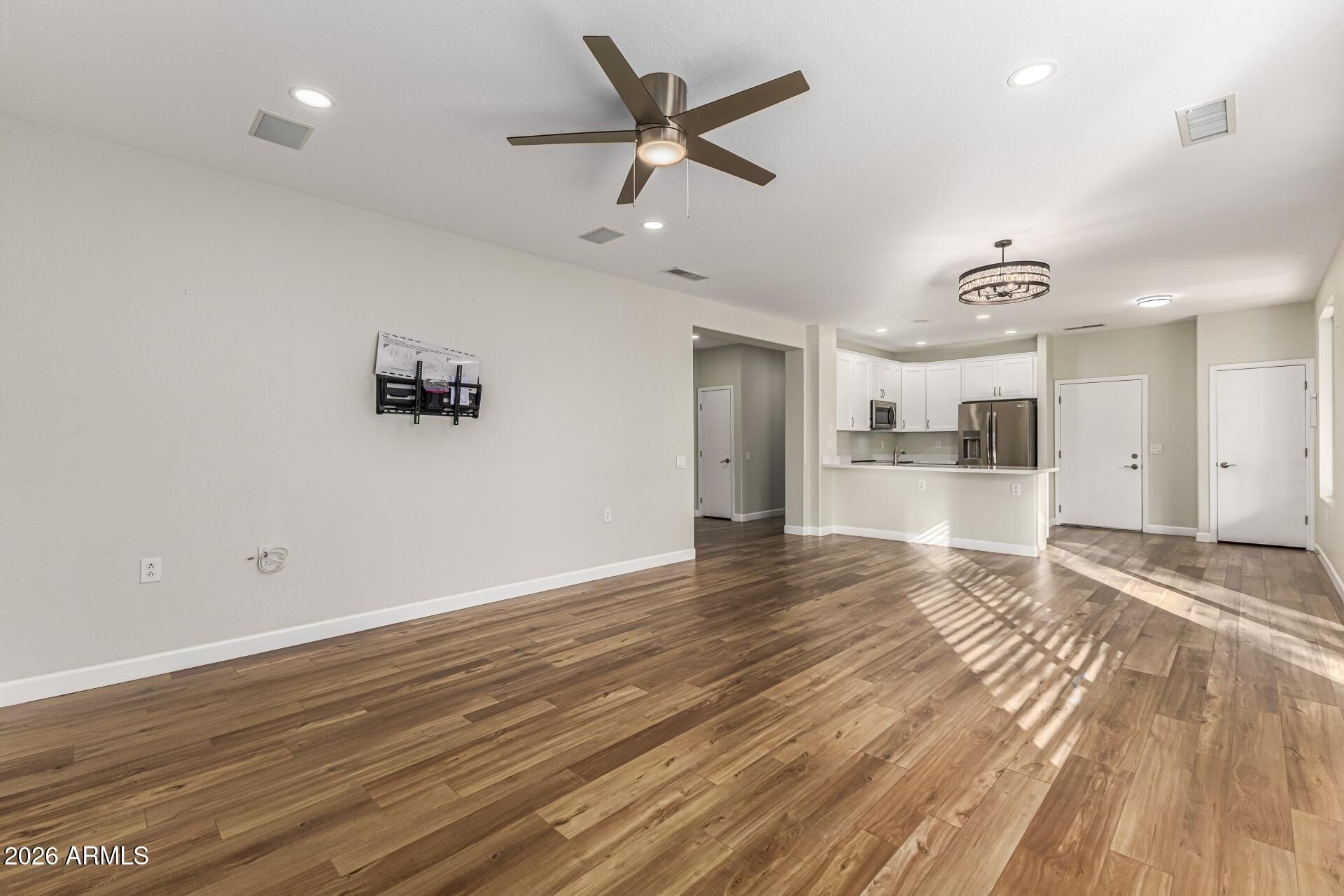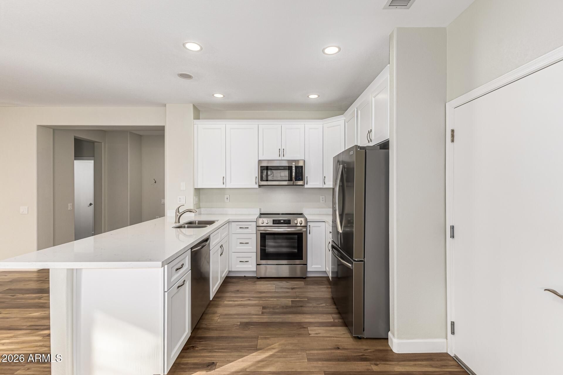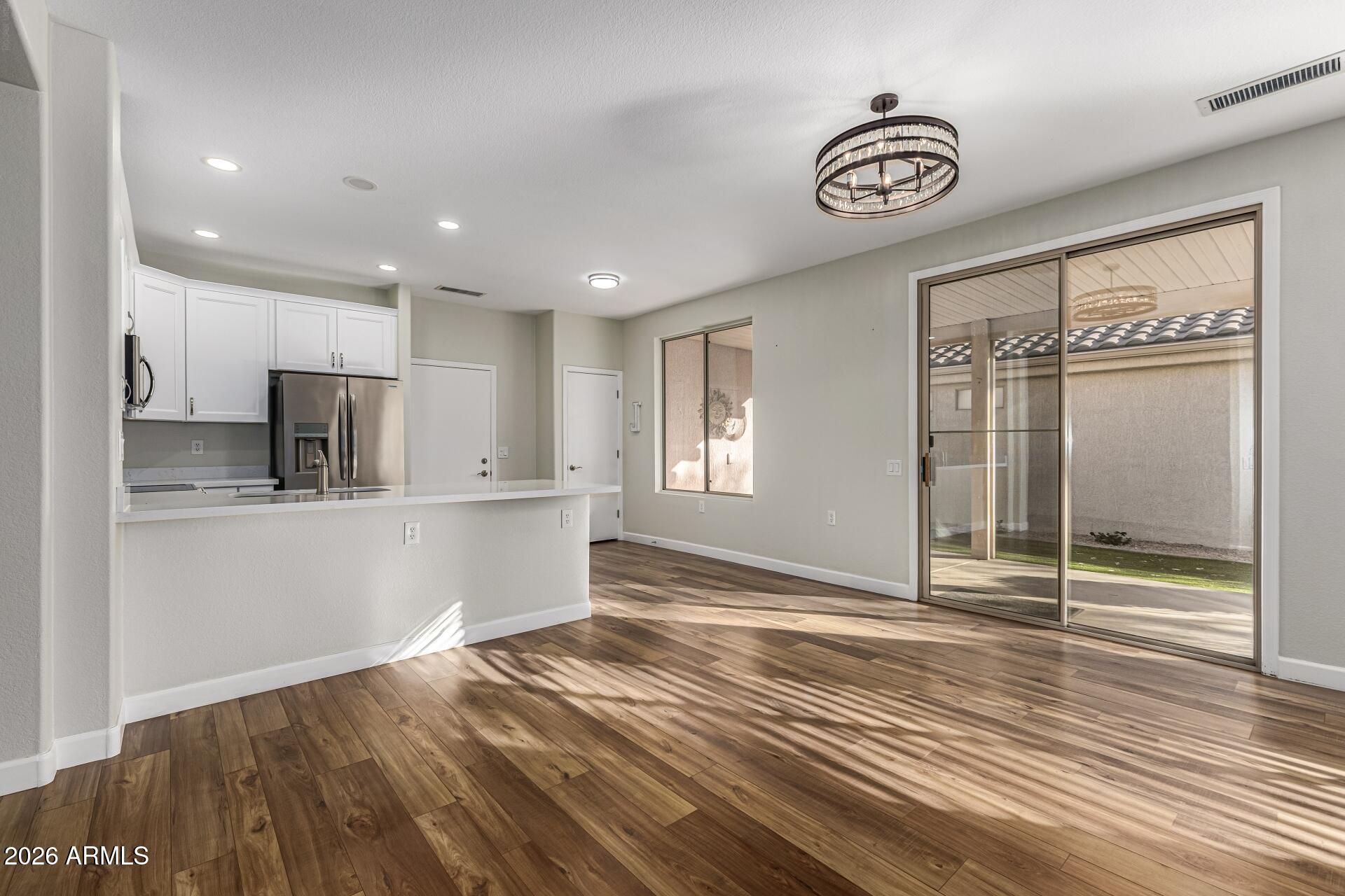 Welcome to a home that truly stands apart in Sun City Grand, where thoughtful, high-quality renovation meets one of the West Valley's most sought-after active adult communities. Completely transformed in 2023, this is not a cosmetic update or a partial refresh. This is a full, top-to-bottom renovation where every detail was carefully considered and executed, creating a home that feels clean, cohesive, and truly move-in ready. From the moment you step inside, the difference is obvious. Beautiful wood-look flooring in a soft champagne blonde tone flows throughout the main living areas, paired with fresh interior paint, new baseboards, and all-new lighting, including added recessed LED fixtures that brighten and elevate the entire space. Every switch, outlet, and plate was replaced, an oft -overlooked detail that contributes to the polished, like-new feel throughout the home. The kitchen has been completely reimagined to align with today's preferences for connected, functional living. Unlike many homes in the neighborhood with closed-off or outdated layouts, this space offers a more open feel to the main living area and features a single-level quartz countertop design, eliminating the raised bar that can make spaces feel divided. A peninsula provides additional workspace and casual seating, while brand-new white cabinetry, stainless steel appliances, and a true pantry deliver both beauty and everyday functionality. This is a kitchen that lives well, whether you are cooking, entertaining, or simply enjoying a quiet morning at home. The split floor plan offers privacy and comfort with two bedrooms and two bathrooms. The primary suite is spacious and thoughtfully designed, featuring a large walk-in closet and an updated bathroom that balances style with accessibility. The walk-in shower includes a built-in bench and grab bars, along with additional support near the toilet area, offering ease of use without sacrificing design. The secondary bedroom and bathroom provide flexibility for guests, office space, or hobbies, with new carpet and updated finishes continuing the home's consistent level of quality. Storage has been significantly improved throughout the home, including a pantry, linen closet, coat closet, additional hallway storage with a hanging bar, and the oversized walk-in closet in the primary suite. Even the closets were thoughtfully considered during the renovation, reflecting a level of attention that goes beyond surface-level updates. Behind the scenes, key systems provide additional peace of mind. The water heater was replaced shortly before the current owner's purchase in 2023, the A/C unit has a 2017 manufacture date, and the roof has had updates in recent years. The exterior paint is also relatively recent, complementing the fully refreshed interior. The backyard continues the theme of low-maintenance, easy living with artificial turf, mature landscaping, and a covered patio that creates a comfortable outdoor retreat. It is an ideal space for morning coffee, evening wine, or simply enjoying Arizona's weather without the upkeep of a high-maintenance yard. The home also features a two-car garage with permanent, poured concrete ramp access into the home, a rare and valuable feature that adds both convenience and long-term usability. Beyond the home itself, Sun City Grand offers a lifestyle that truly sets it apart. Known as one of the West Valley's premier active adult communities, it feels more like a private resort than a traditional neighborhood. From the moment you enter, you notice the pride of ownership, beautifully maintained landscaping, and a thoughtfully designed layout that makes it easy to enjoy everything the community has to offer. At the heart of the community are multiple expansive recreation centers, each offering a wide range of amenities designed for both relaxation and activity. Residents enjoy indoor and outdoor heated pools, dedicated lap pools, and spa areas that create a resort-style experience. Two full fitness centers provide modern equipment, group classes, and spaces for strength training, cardio, and overall wellness. For those who enjoy staying active, the community features miles of walking and biking paths, along with tennis courts, pickleball courts, and a wide variety of recreational opportunities. Golf is a major highlight, with four beautifully maintained courses offering play for all skill levels, all set against stunning desert surroundings. What truly elevates Sun City Grand is the lifestyle and sense of connection it offers. A wide variety of clubs, social groups, and organized activities make it easy to meet neighbors and stay engaged. Whether it is arts, music, dance, or special interest groups, there is always something happening. Scenic common areas, including a lake and gathering spaces, further enhance the overall experience and create a true sense of community. The location also provides convenient access to nearby shopping, dining, medical services, and everyday essentials, making daily life both simple and enjoyable. Designed as an age-restricted community, Sun City Grand offers limited flexibility allowing some residents as young as 45, while maintaining the active adult lifestyle it is known for. What truly sets this property apart is not just the renovation itself, but the quality and completeness of it. Many homes in the area have been partially updated or renovated years ago. This home was done recently, thoroughly, and with a level of detail that is immediately noticeable. It offers a rare opportunity to enjoy the charm and convenience of Sun City Grand with the feel of a home that has already been brought fully into today's standards. This is the kind of home buyers notice the moment they walk in and remember long after they leave.