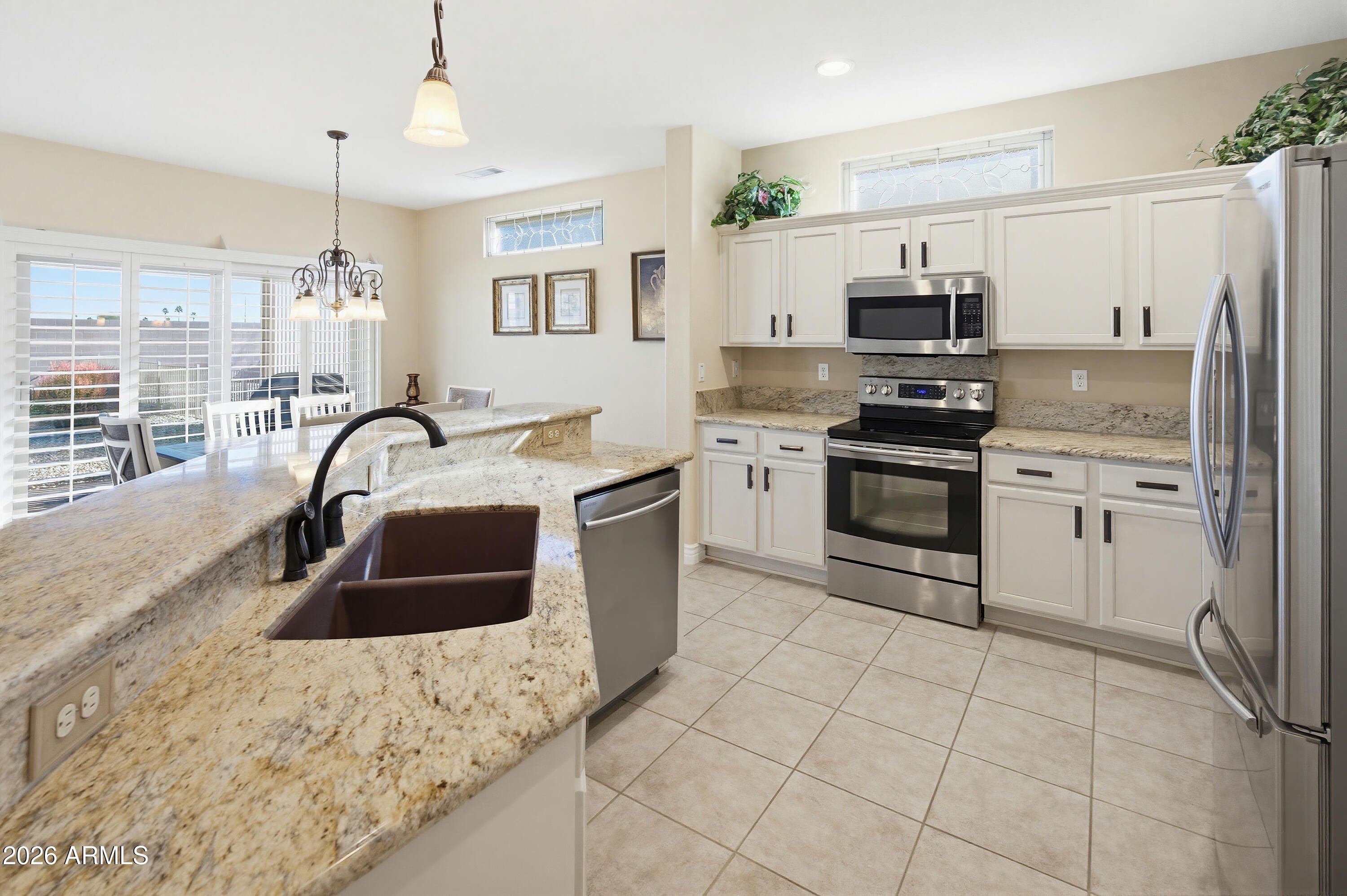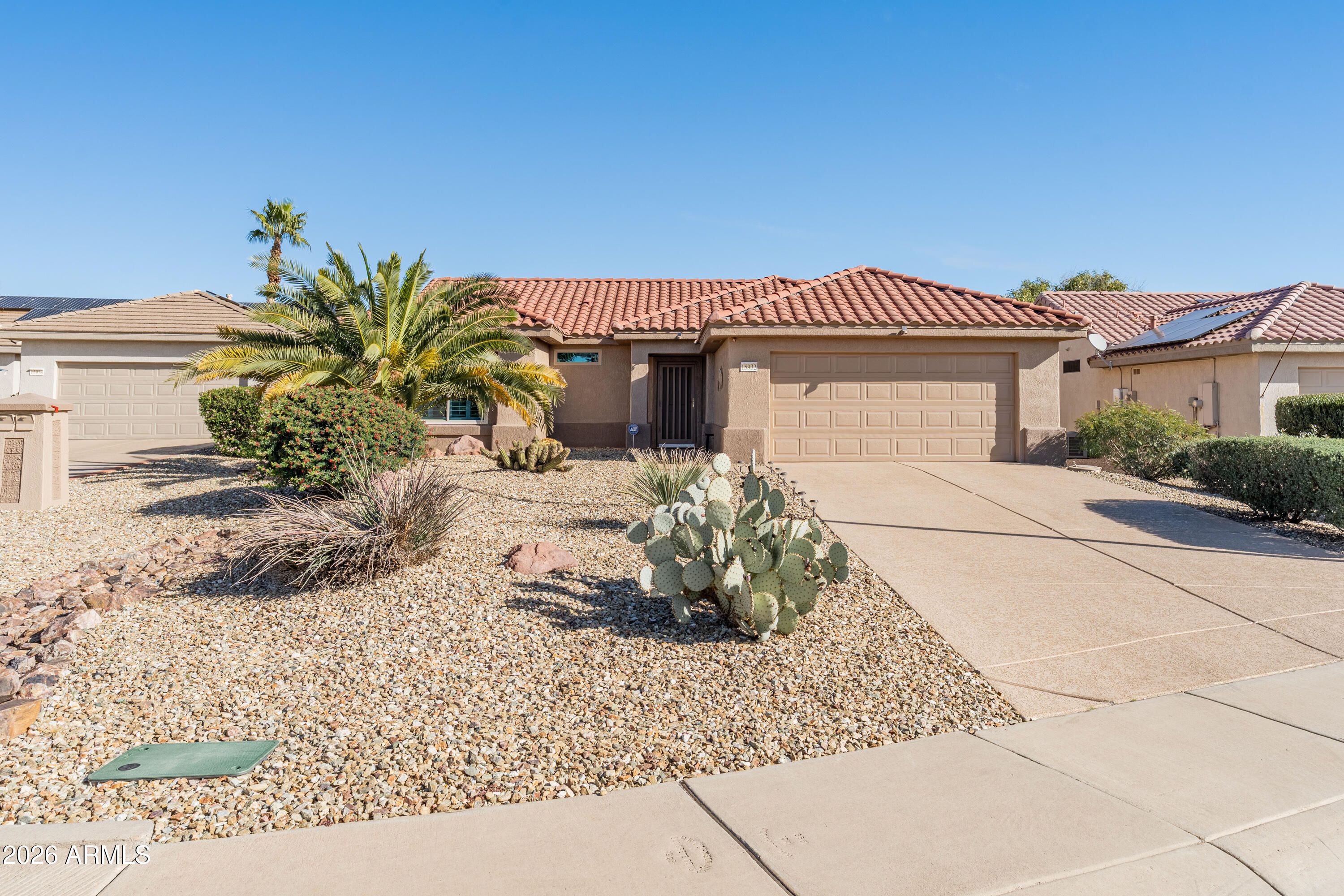 WELCOME HOME to this beautifully maintained ACACIA model. Situated on a PREMIUM, OVERSIZED LOT, this home boasts exceptional curb appeal and an extra-long driveway. Includes 16-inch ceramic tile, elegant plantation shutters, and updated tall baseboards throughout. Spacious kitchen with granite countertops & SS appliances. The primary suite includes a bay window and an ensuite bath featuring dual vanities and a step-in shower. Significant upgrades including a NEWER HVAC (2020), NEW WINDOWS (2021), and a recirculating hot water system. The OVERSIZED BACKYARD is a true outdoor oasis, featuring an expansive covered patio and cozy firepit-perfect for enjoying Arizona nights. Located in a premier active adult community, this move-in-ready gem is the lifestyle upgrade you've been searching for!