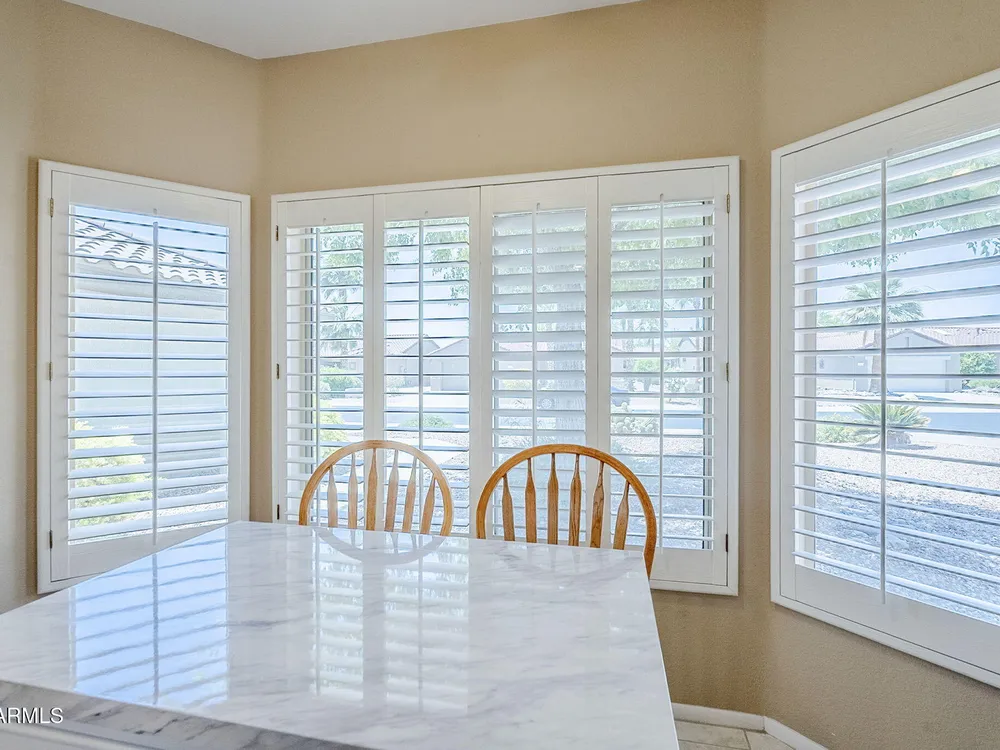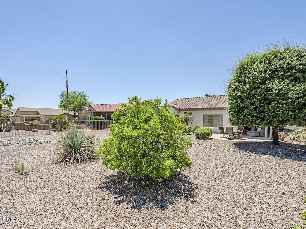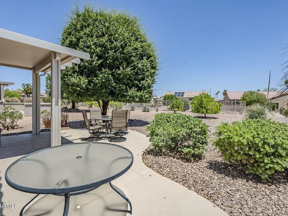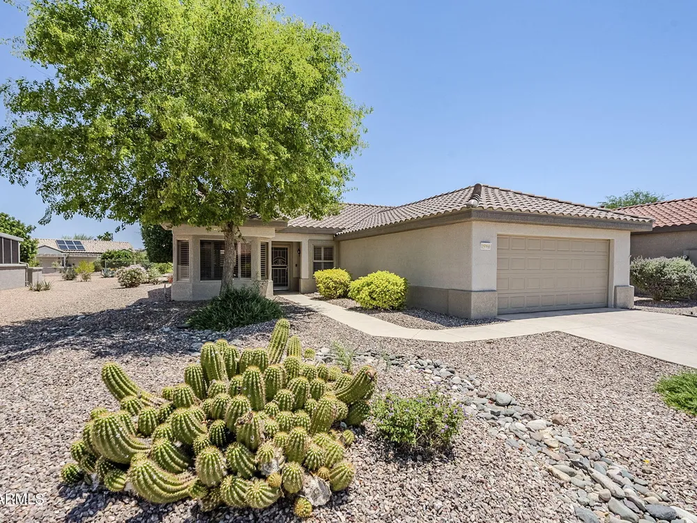 Discover effortless living in this charming Willow Model nestled in the highly sought-after Sun City Grand, also known as The Grand! Set on a spacious, low-maintenance lot with mature fruit trees and a water-efficient PVC irrigation system, this home offers both beauty and convenience. Step inside to find bright bay windows in the kitchen and primary suite, elegant plantation shutters throughout, and a thoughtful layout designed for comfort. Recent exterior paint gives the home fresh curb appeal, while the hot water circulator ensures instant hot water whenever you need it. The extended-length garage provides ample space for storage and includes built-in cabinets plus an electric vehicle charging station—a perfect blend of modern living and practicality.