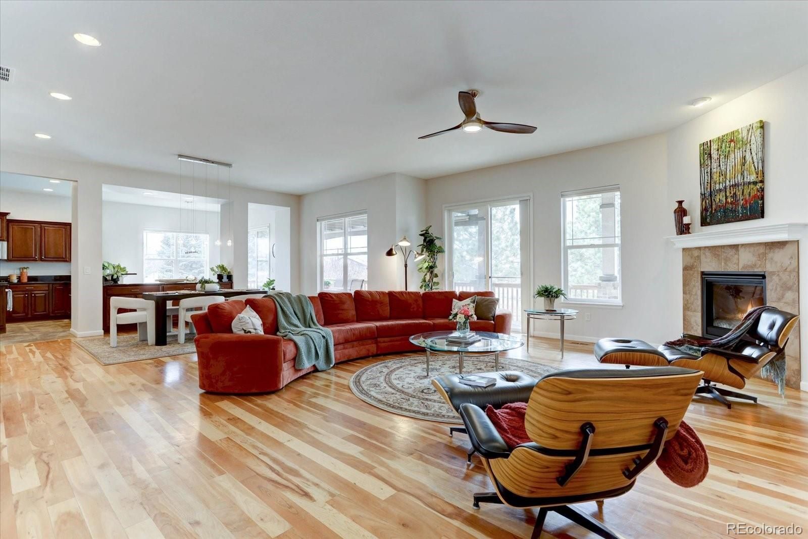 Great cul-de-sac location! Mountain views and a whole lot of comfortable living space! This Vail model Pulte home was designed with entertaining in mind. It has a gracious chef's kitchen with SS appliances, granite countertops and a large prep island with eat in area that exits to a large covered deck sheltered by large Austrian pine trees but still allowing for Rocky Mountain views! The open concept floor plan includes a dining area with alcove for your buffet or hutch, although there is a built in buffet area between kitchen and DR with additional cabinetry. Throughout the main living area is a beautiful hickory hardwood floor that offers a warm and inviting presence with an overhead ceiling fan and gas fireplace. You will love the large primary suite with access onto the covered porch, large windows and en suite with walk in closet. The guest BR on the main level is generously sized with an adjacent guest bath. The Living Room offers a spacious entertaining area with a gas fireplace, lots of natural light, beautiful flooring and open concept living. The downstairs leads to a comfortable sitting area/game or media room with a built in Murphy bed. There is another bedroom off this living space with it's own en suite with double sinks. As the basement is partially finished, there is an additional storage and utility area that could offer space for almost any hobby you might wish to engage in. This is a wonderful property in Anthem Ranch. Come for the views, but stay for the lifestyle!