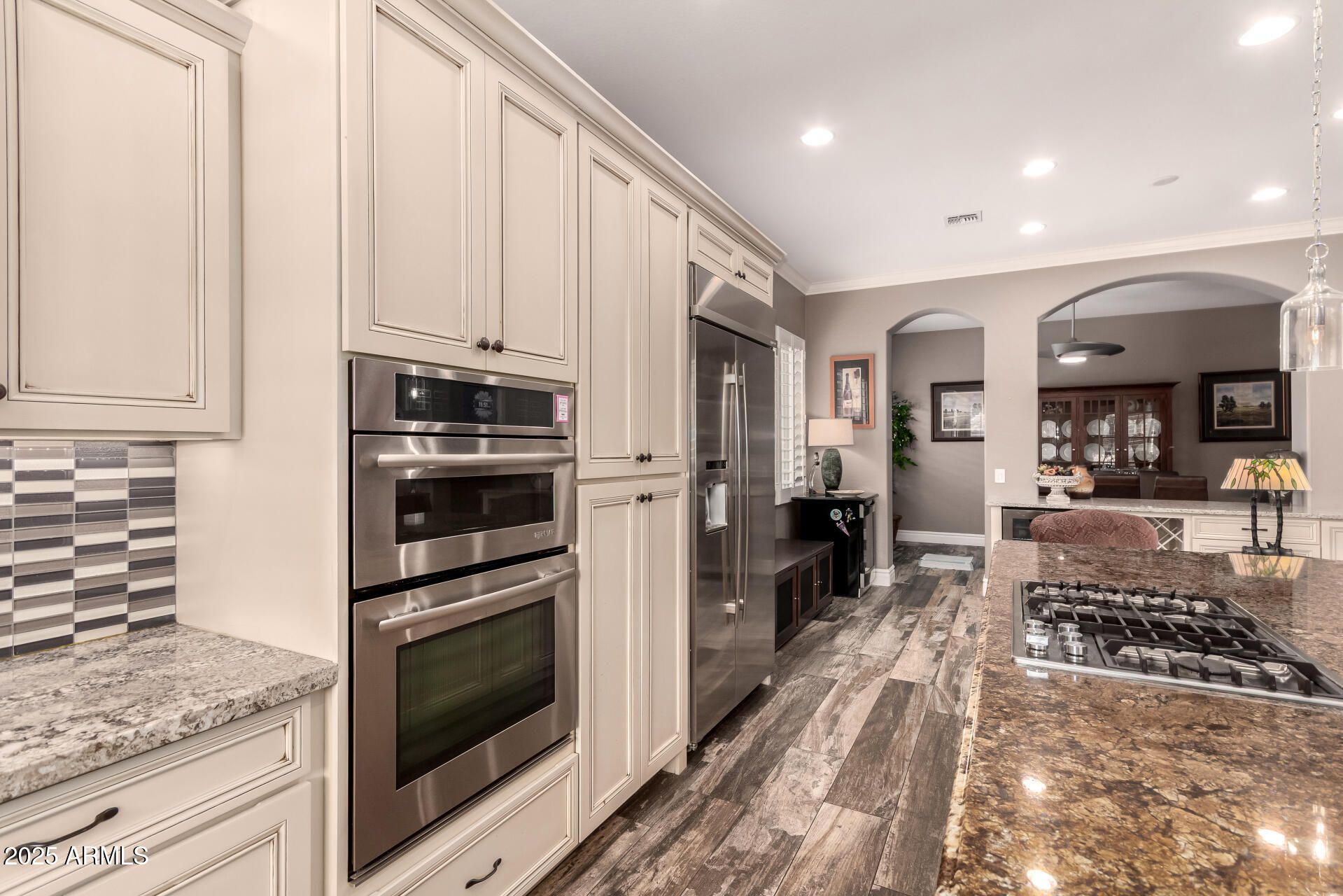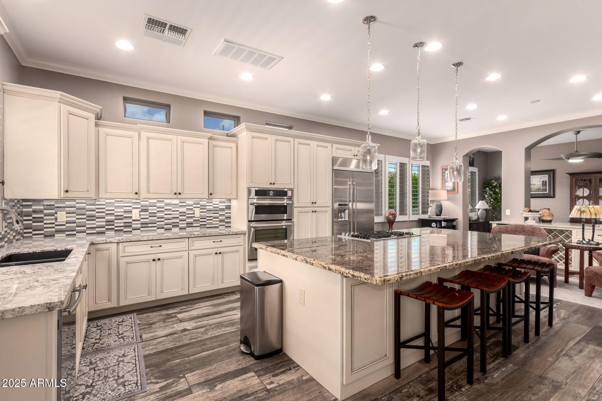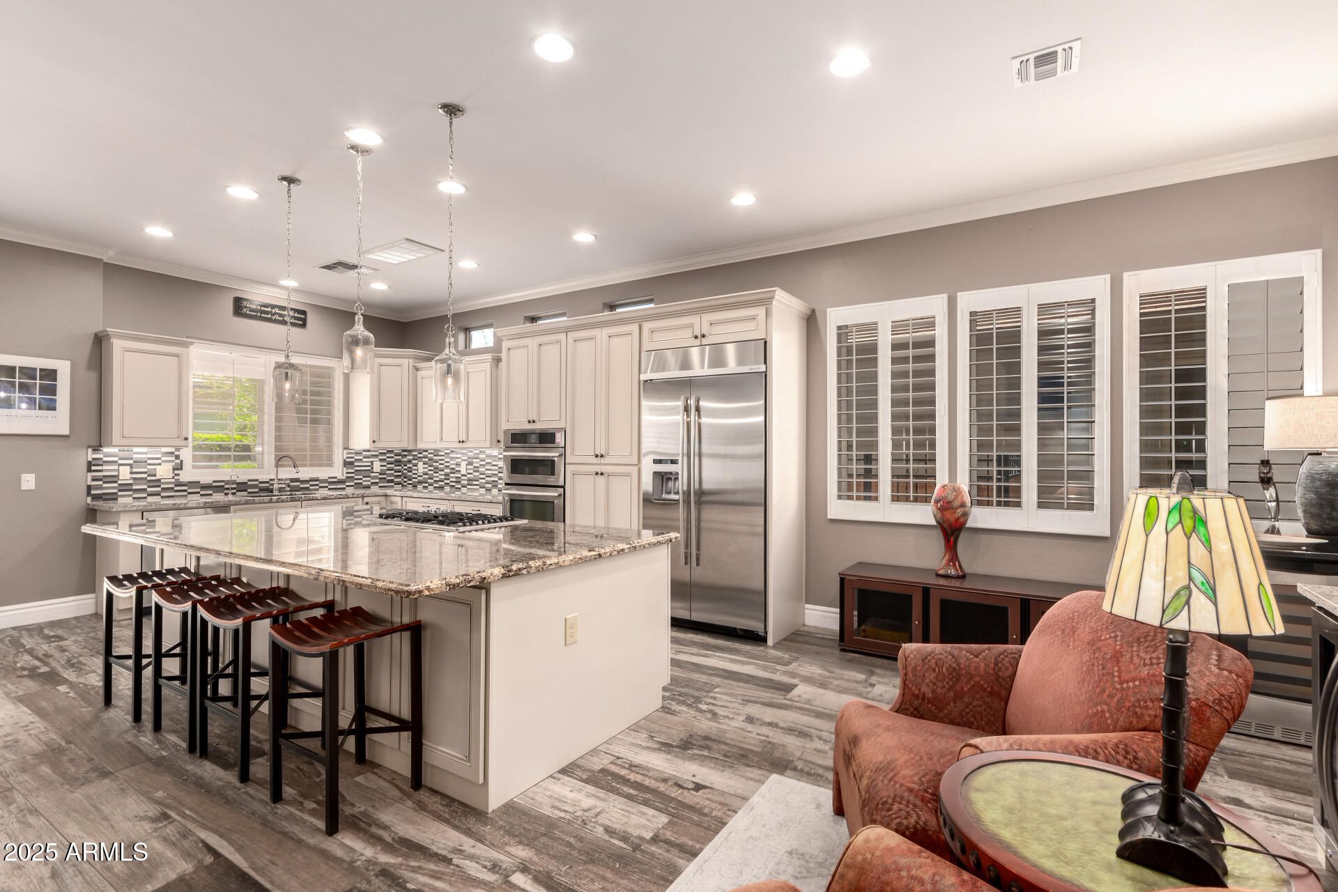 Welcome to the exciting, nearly sold-out gated community of Encanterra! Finally, here's your chance to own a rare 3 bedroom, 3 bath home that offers just the right finishing touches. Step inside and you'll find a fabulous open floor plan with a gourmet kitchen, highlighted by a stunning stone island, stainless steel appliances, and a built-in refrigerator — perfect for entertaining. The spacious primary suite includes a beautifully finished bathroom w/ a low-entry shower, while the secondary bedrooms & baths offer comfort & style for family or guests. Enjoy low-maintenance luxury floors in all the living areas. Step outside and you'll be wowed by a backyard straight out of a magazine — the ultimate place to enjoy a glass of wine or host under the Arizona stars. Plus NEW AC Dec. 2024!