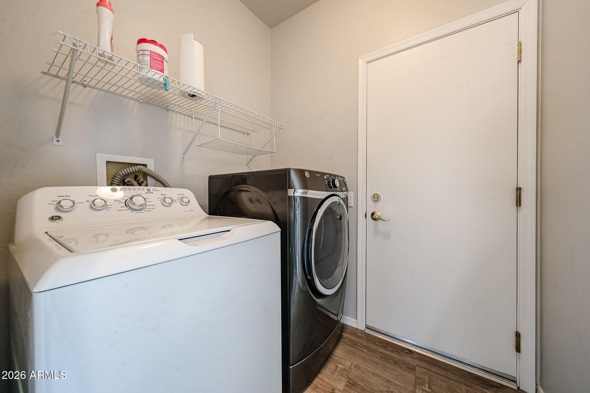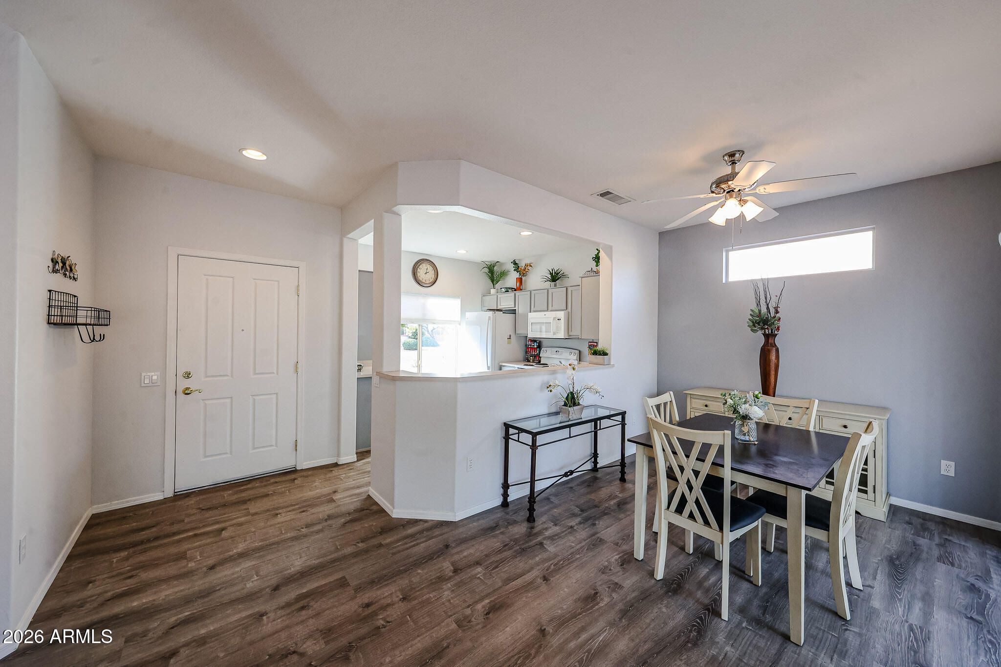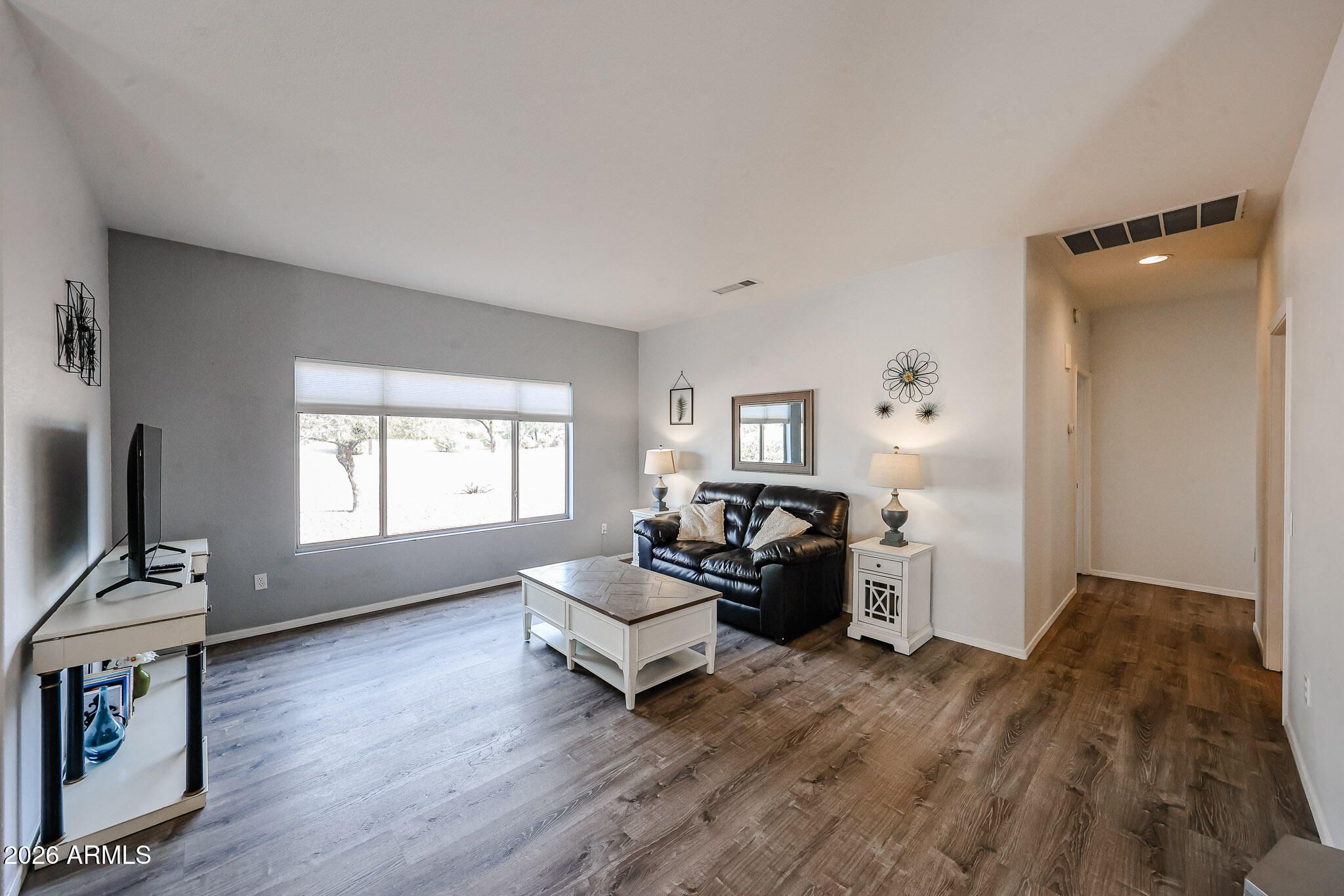 Move right in to this beautifully furnished 2 bedroom, 2 bath Willow model. Enjoy Luxury Vinyl Wood Plank flooring throughout the main living areas, cozy carpet in the bedrooms, and a spacious primary bath with a walk-in shower. Situated in the highly desirable 45+ Active Adult Community of The Grand in Surprise, this home features a bright, cheerful kitchen that opens to the living and dining areas, creating an inviting open-concept layout. Additional highlights include north/south exposure and a convenient indoor laundry room with washer and dryer included.
