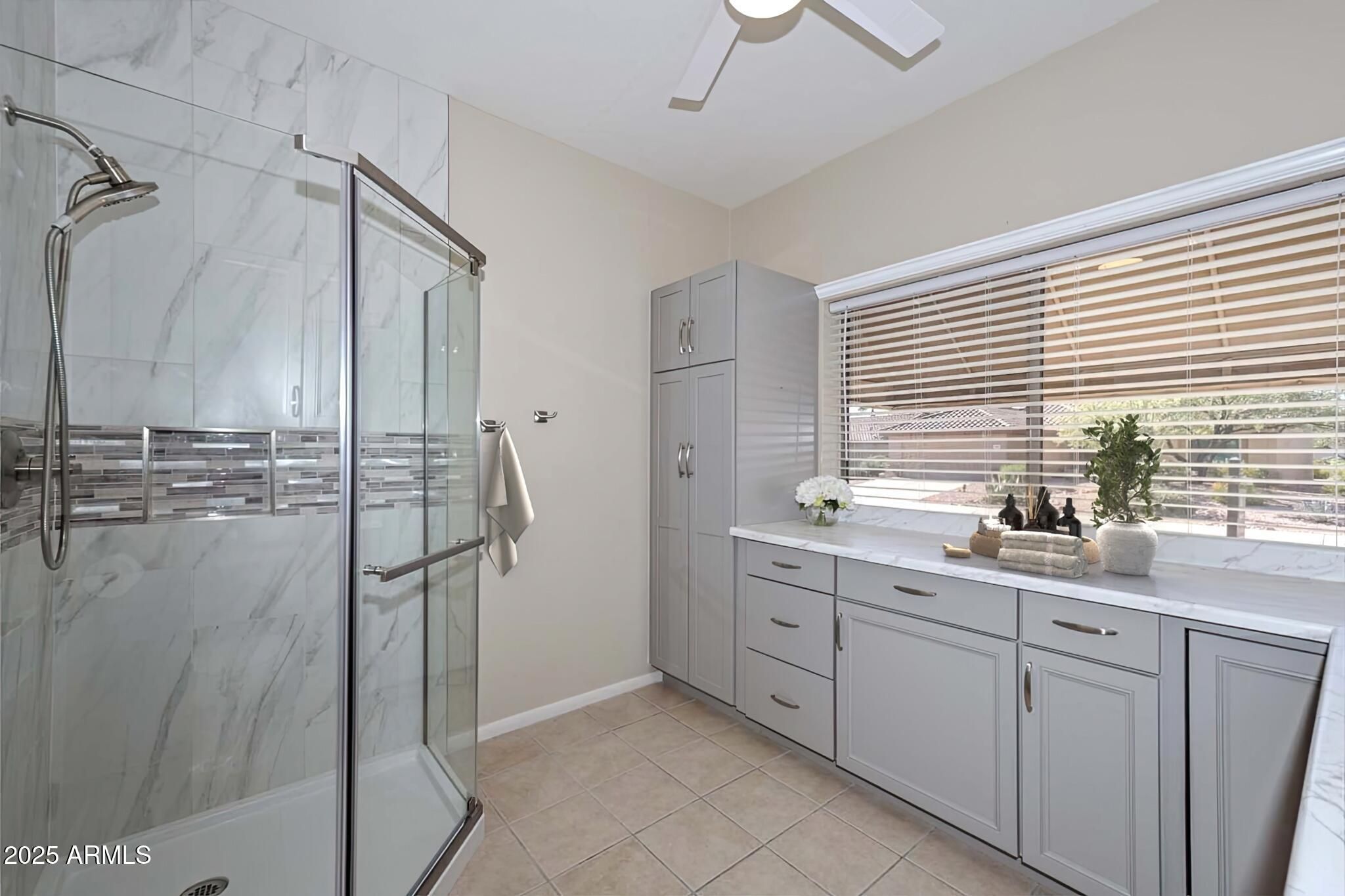 Beautifully remodeled single-level home in the heart of The Grand, offering modern style and comfort throughout. Enjoy curb appeal, low-maintenance desert landscaping, and an extended two-car garage with built-in cabinets. Inside, the open-concept floor plan is bright and inviting, with tile floors, high ceilings, and abundant natural light. A versatile attached casita with its own newer HVAC system is perfect for guests, hobbies, or a private office. The updated kitchen features granite countertops, stainless steel appliances, tile backsplash, and ample cabinetry. The primary suite includes bay windows, a walk-in closet, and a remodeled bathroom with dual sinks and a step-in shower. Unwind on the covered patio and enjoy Arizona's outdoor lifestyle. Experience the best of Sun City Grand living with access to clubhouses, fitness centers, pools, golf, tennis, pickleball, and social clubs.