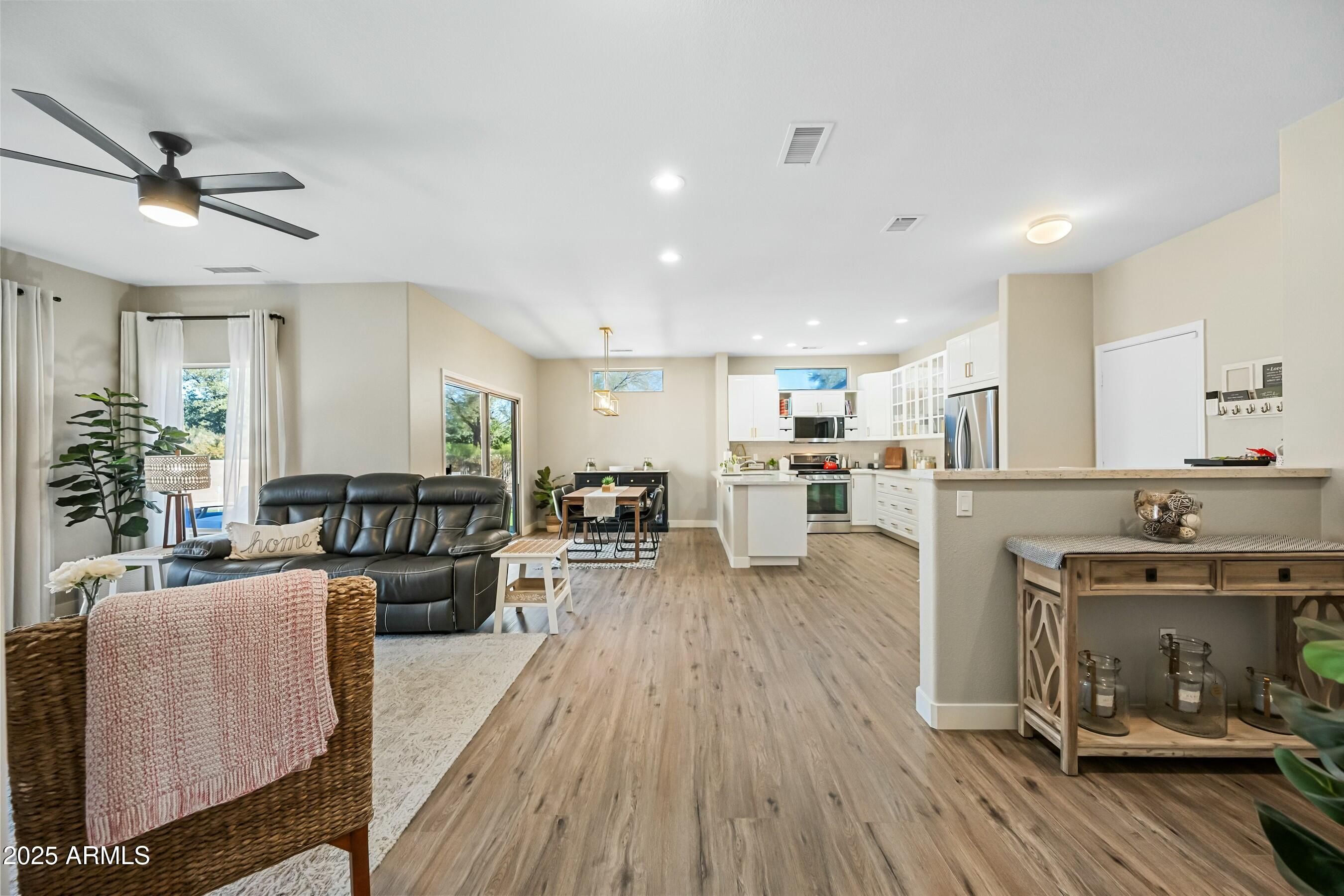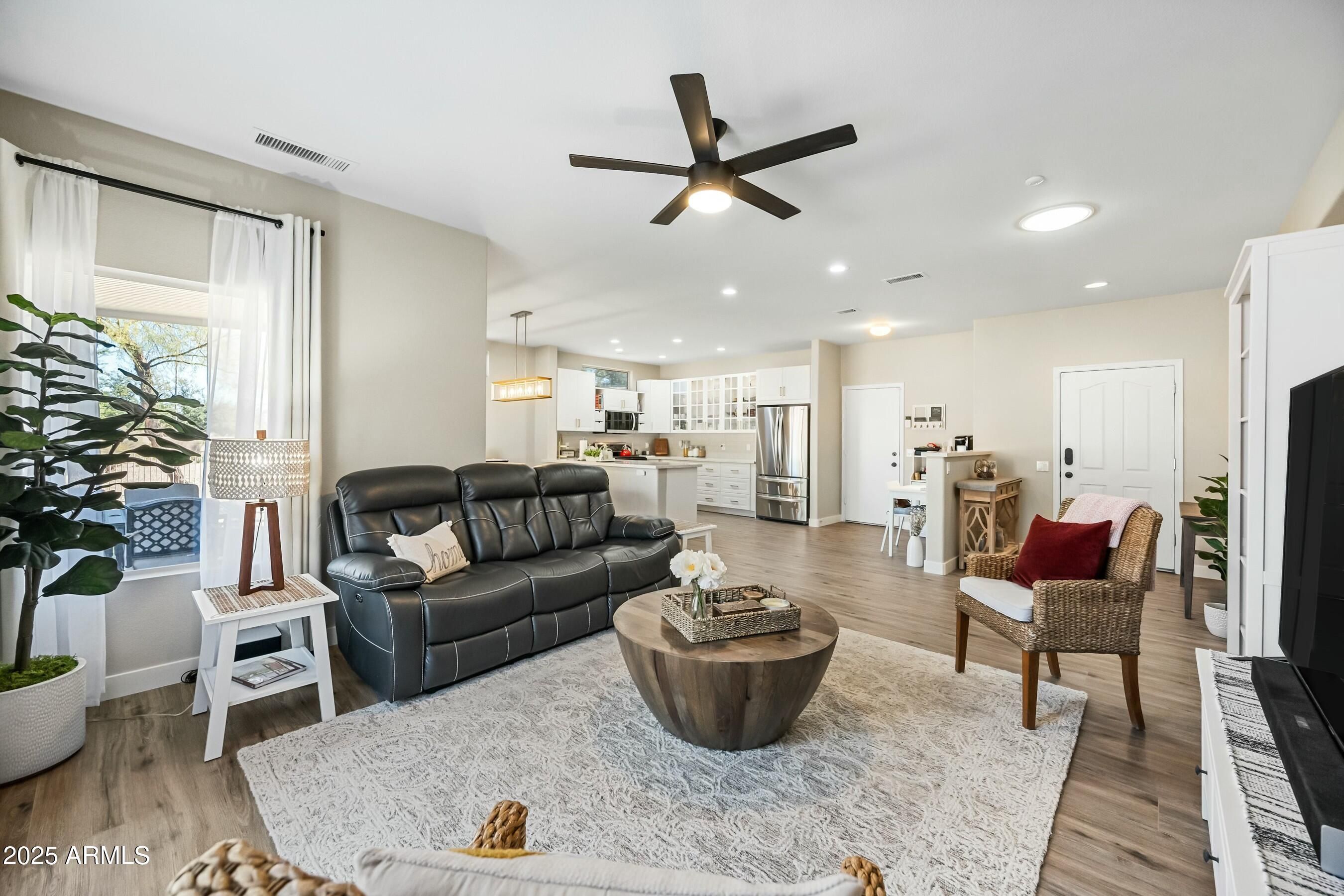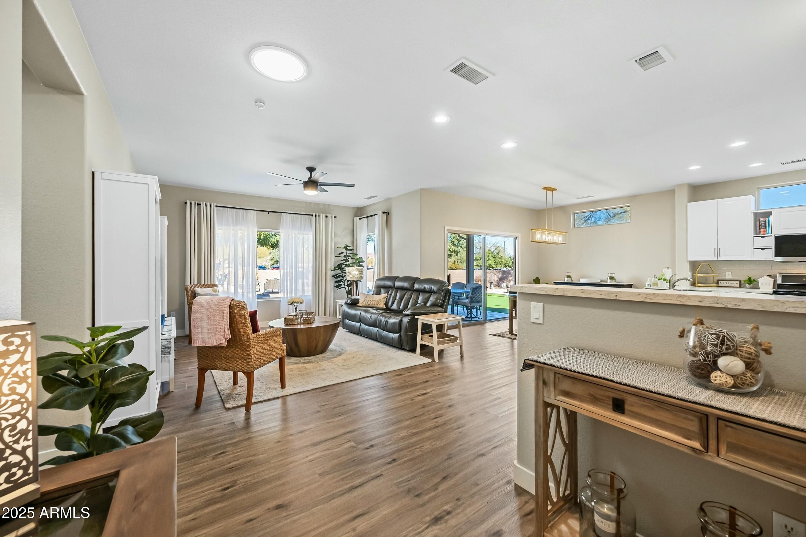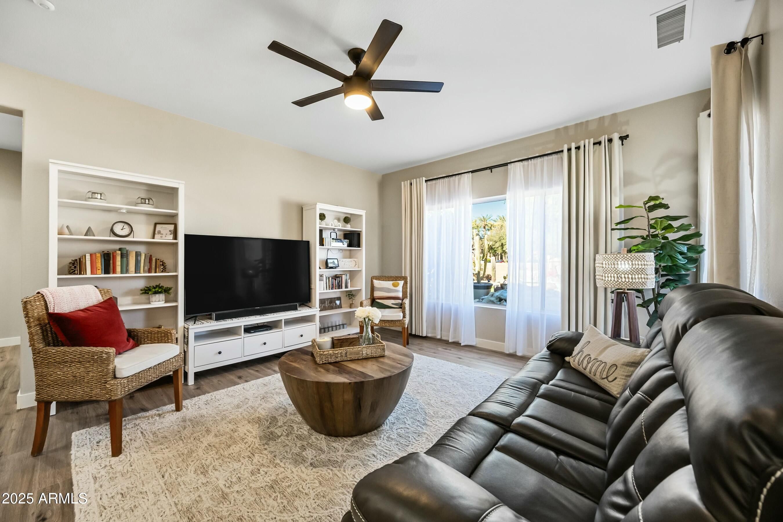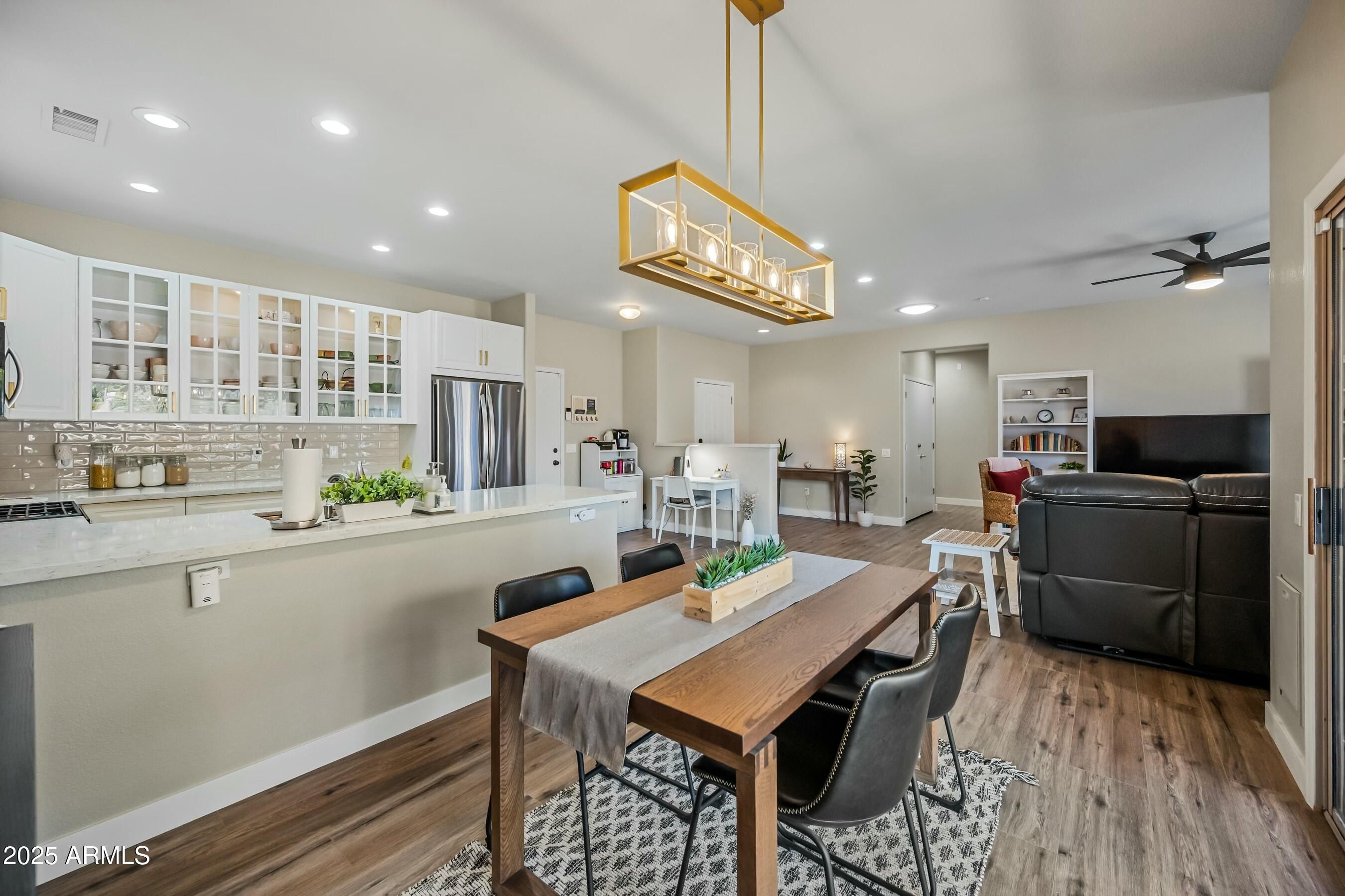 RARE MODEL PARK HOME!! This updated Kiva sits on a quiet cul-de-sac and is just across the street from the Adobe Fitness Center and cafe. NEW ROOF underlayment installed December 2025. UPDATED in 2023/2024 to create a light, open concept that feels spacious and inviting! Enjoy an updated kitchen with white cabinets, quartz countertops, subway tile backsplash, stainless steel appliances, pot drawers, and an under-mount stainless steel sink. Many drawers have a second shelf for added organization & the kitchen peninsula overlooks the back patio. The stove is GAS! The primary suite is a lovely retreat overlooking the backyard and offers a bay window, updated vanity, and a closet organizer giving you the perfect space for your belongings. The second bedroom makes an ideal guest room, office, or hobby space, and the second bathroom has been updated with a new vanity. Throughout the home you will find stunning LVP flooring, 4'' baseboards, new ceiling fans, new light fixtures, and new neutral paint. Refrigerator, washer, and dryer convey. Garage floor has an epoxy coating and storage cabinets. The oversized lot offers an amazing backyard space for activities, entertaining, or just simply enjoying the beautiful Arizona weather. There are multiple sitting areas including a covered patio. Additional features include a large putting green w/ multiple holes and fountain.