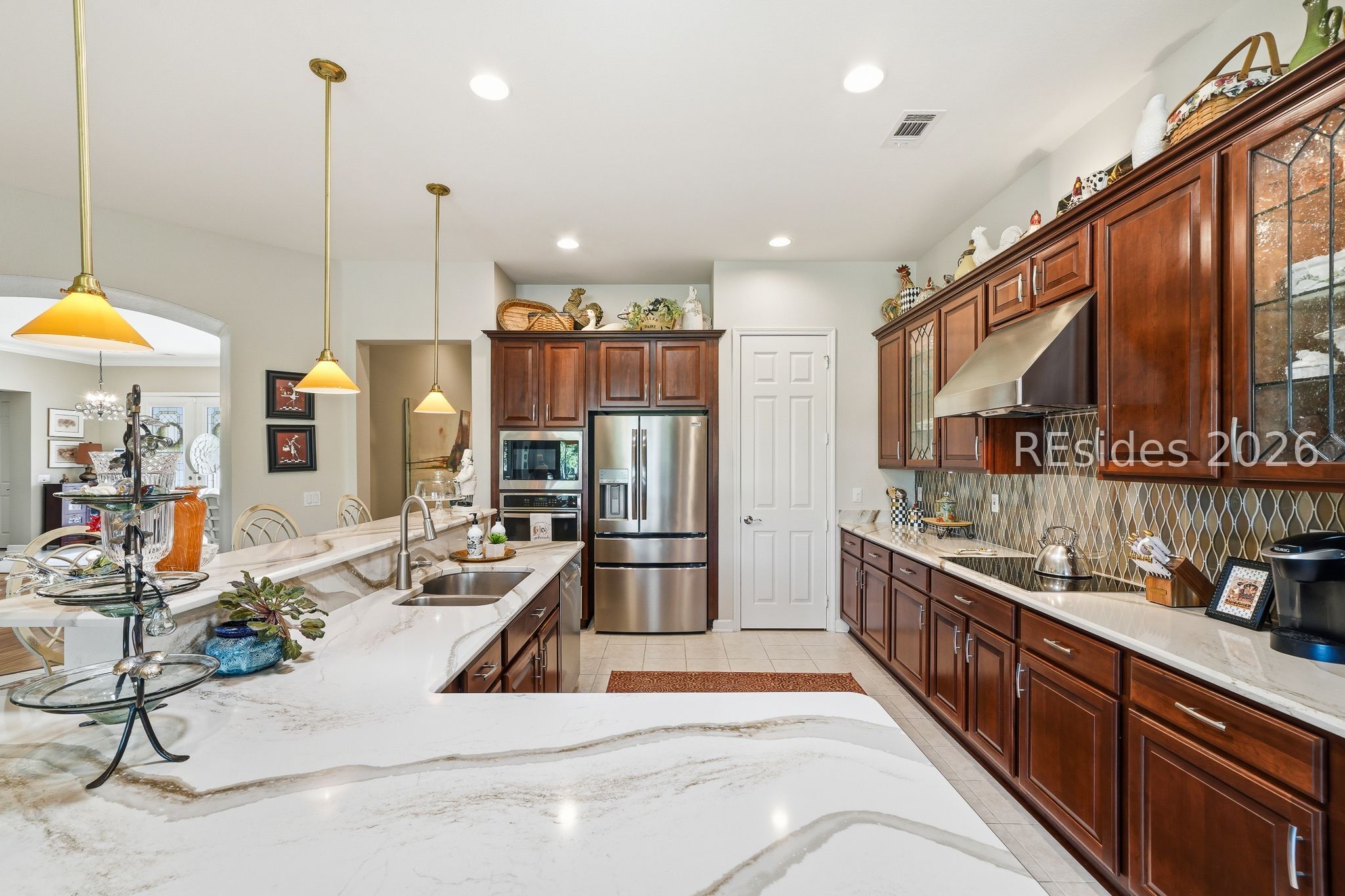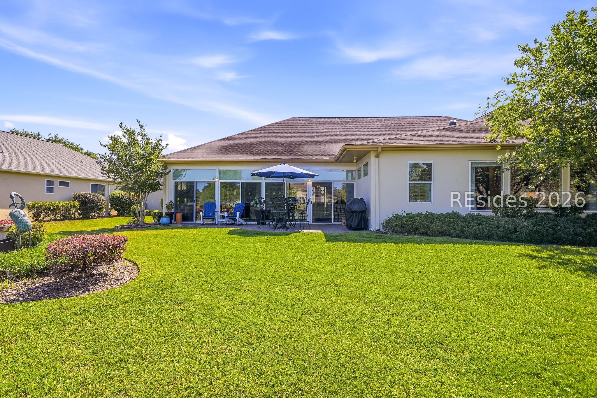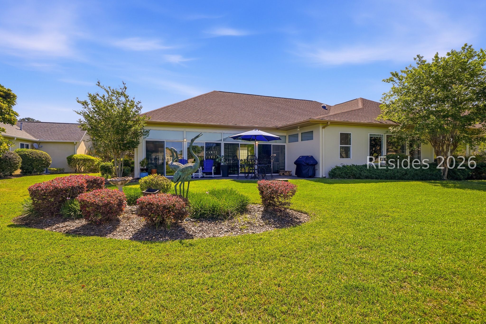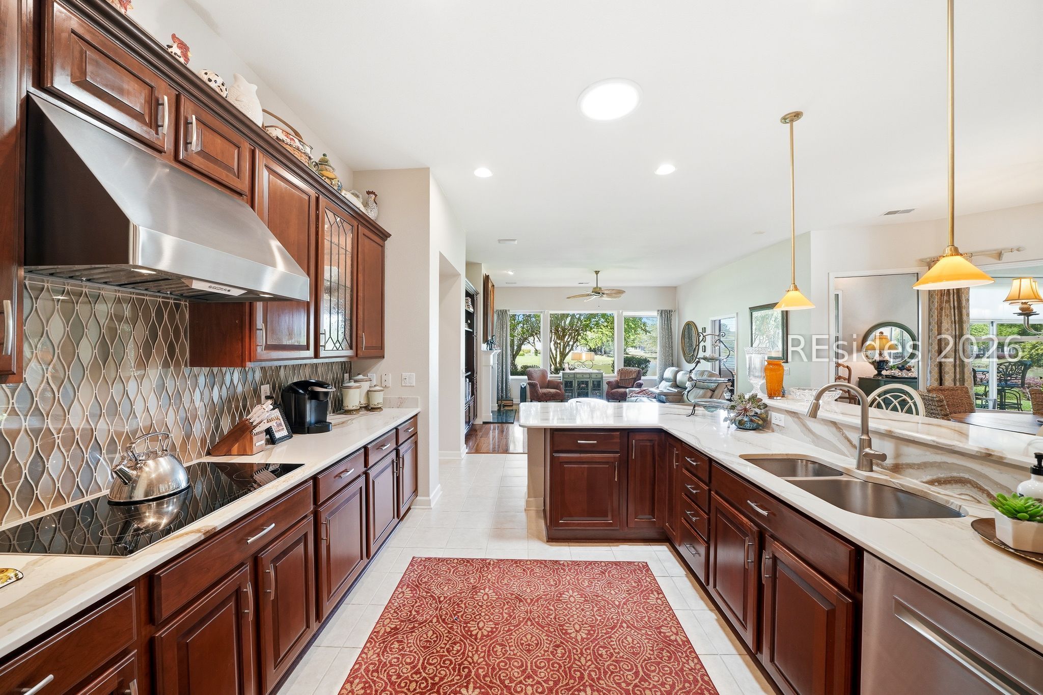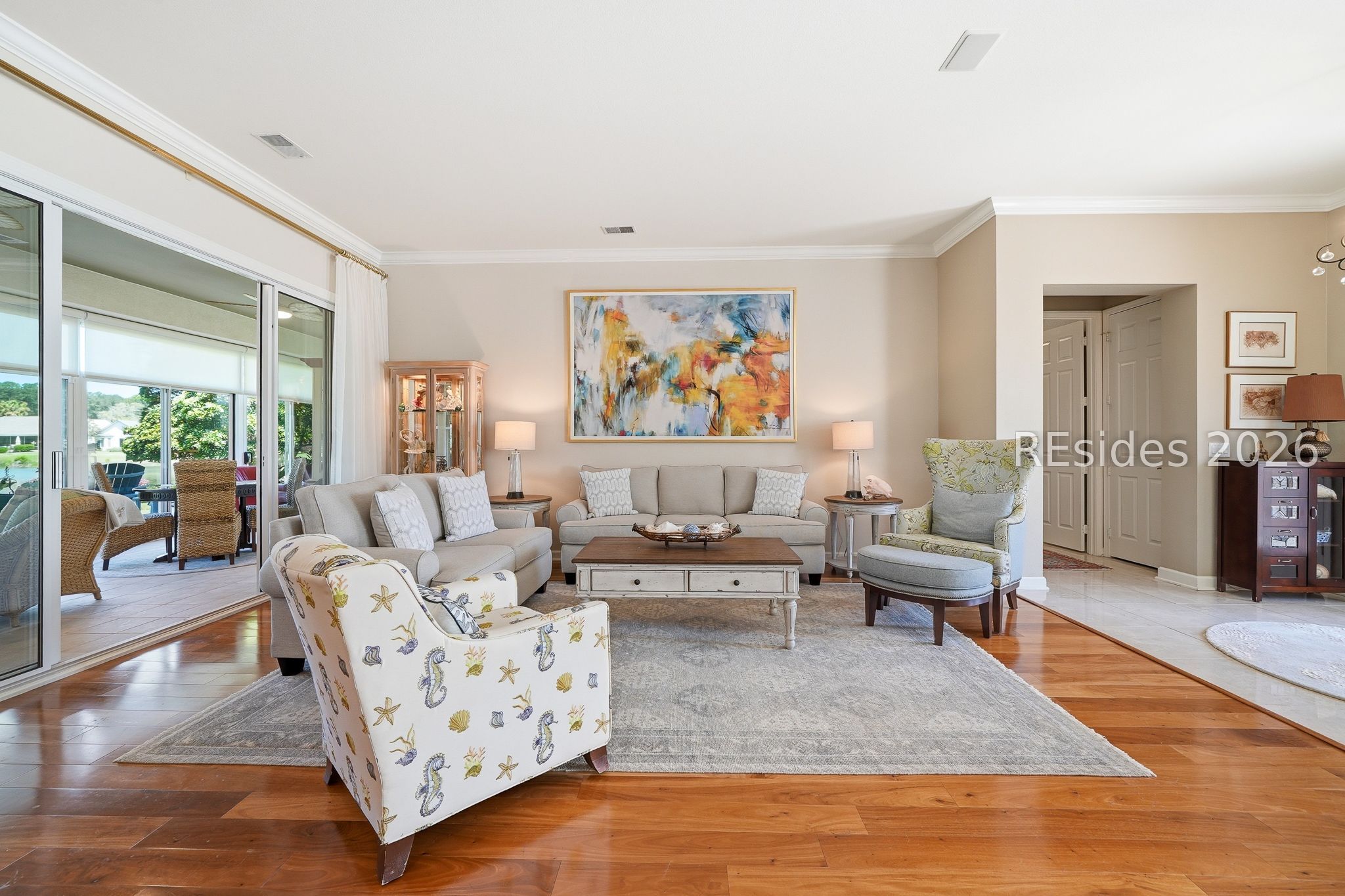 Welcome to this exceptional Rushmore model, offering 3,503 square feet of beautifully curated living space-widely regarded as one of the most sought-after floor plans in Sun City. Perfectly positioned to capture tranquil lagoon views, this residence effortlessly blends refined luxury with everyday comfort. From the moment you step inside, you're greeted by rich wood flooring that flows throughout the open-concept design, creating a warm and inviting ambiance ideal for both relaxed living and elegant entertaining. At the heart of the home, the chef's kitchen is a true showpiece, featuring gleaming quartz countertops, an expansive cooktop, double wall ovens, a spacious walk-in pantry, and a striking teardrop backsplash that adds a sophisticated designer touch. The living space extends seamlessly into the four-season Carolina room, where walls of windows invite in natural light and frame peaceful water views year-round. Just beyond, a beautifully designed paver patio surrounded by lush landscaping offers the perfect setting for outdoor gatherings or quiet evenings overlooking the lagoon. Thoughtfully designed for privacy and versatility, the home features two guest bedrooms connected by a fully remodeled shared bath, along with a dedicated office complete with custom built-in cabinetry. The expansive primary suite occupies its own private wing, providing a serene retreat with a luxurious en-suite bath, separate shower, and generous closet space. Curb appeal is equally impressive, with a welcoming front courtyard adorned with elegant pavers and a tranquil fountain-setting the tone for the home's refined character. The oversized three-car garage, complete with epoxy flooring, offers ample space for vehicles, storage, and a golf cart. Additional highlights include a tankless water heater, a newer roof (2020), and a brand-new HVAC system (2026), ensuring comfort and peace of mind for years to come. Ideally located near the Town Center and main gate, this home provides convenient golf cart access to shopping, dining, and daily essentials, with easy drives to charming downtown Bluffton, I-95, historic Savannah, and the pristine beaches of Hilton Head Island. As a resident of Sun City, you'll enjoy world-class amenities including championship golf courses, resort-style pools, state-of-the-art fitness centers, dining venues, tennis, pickleball, and an active, vibrant lifestyle. This is Lowcountry living at its finest!