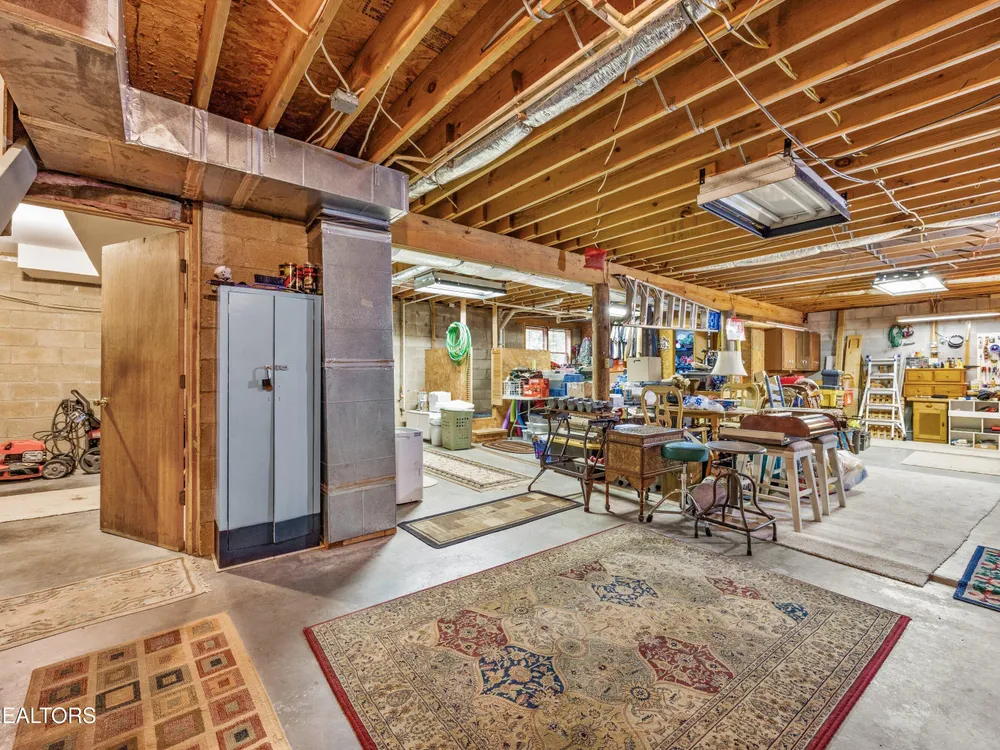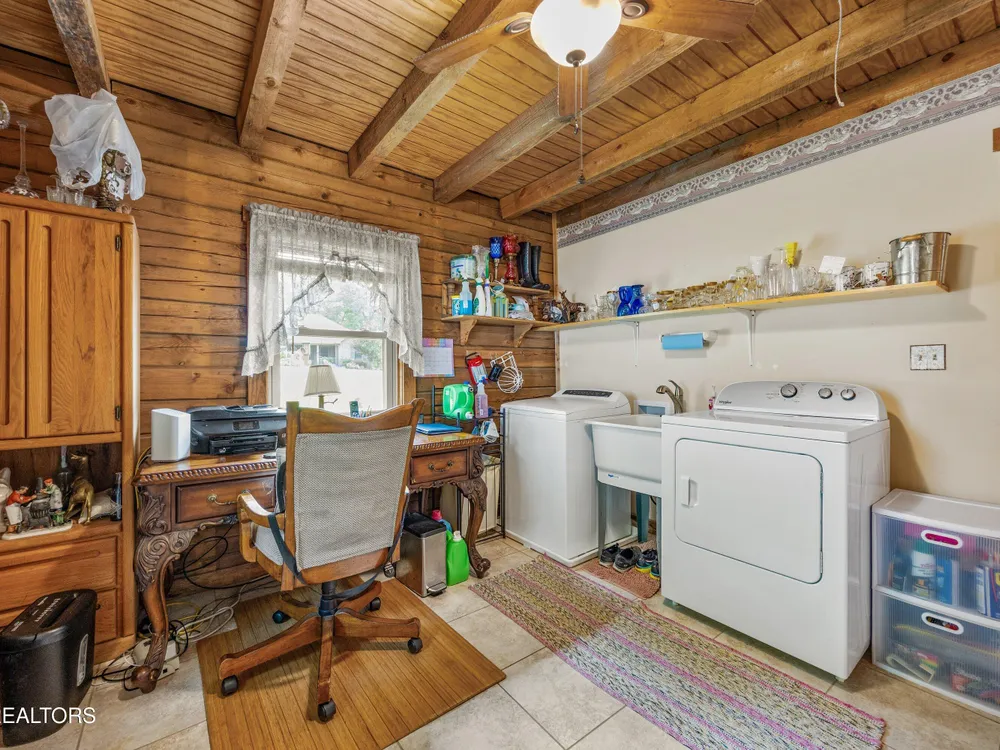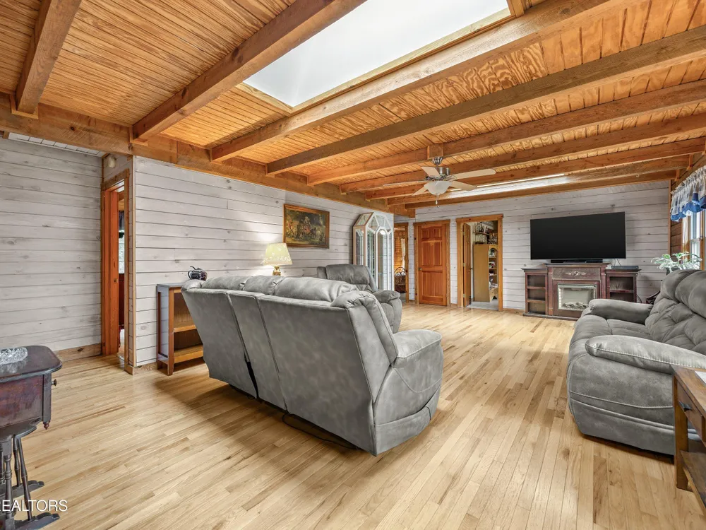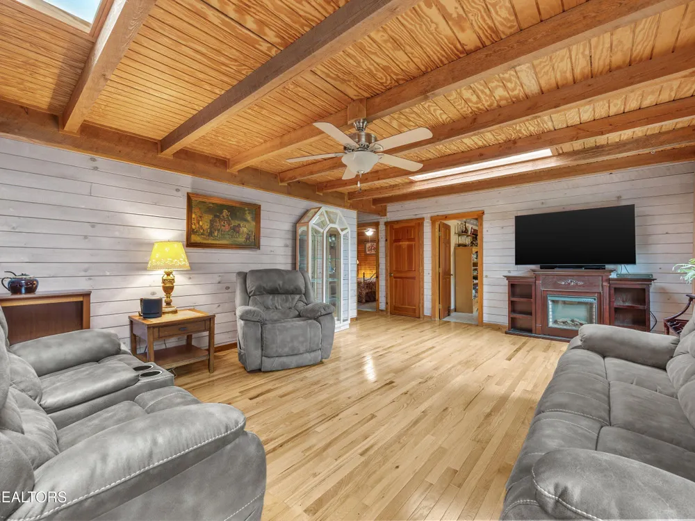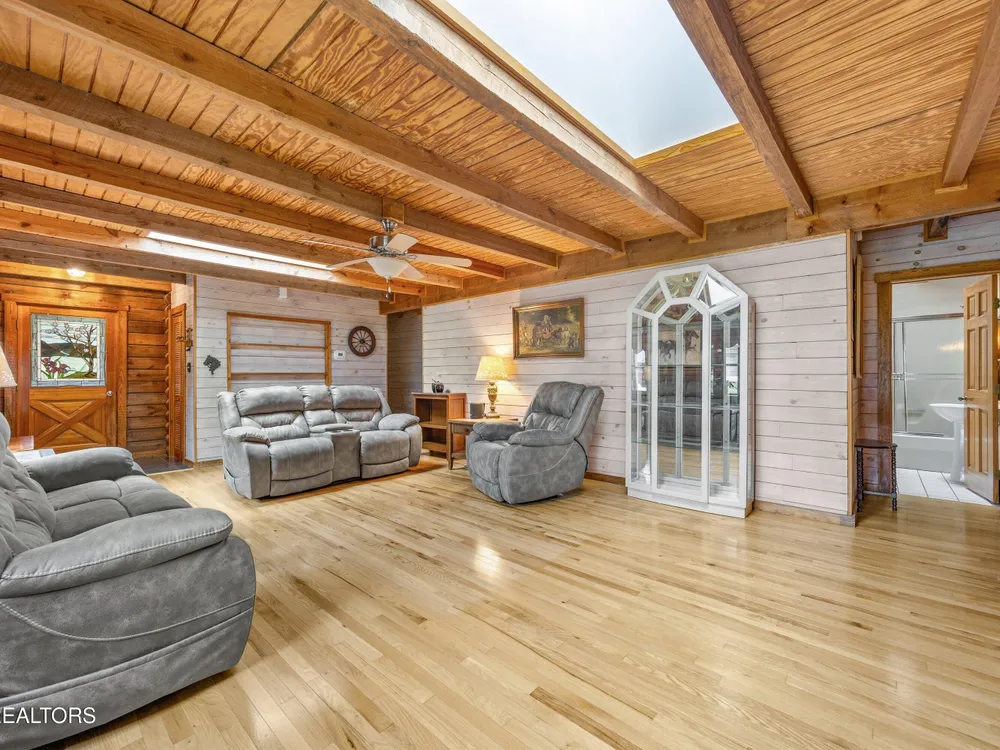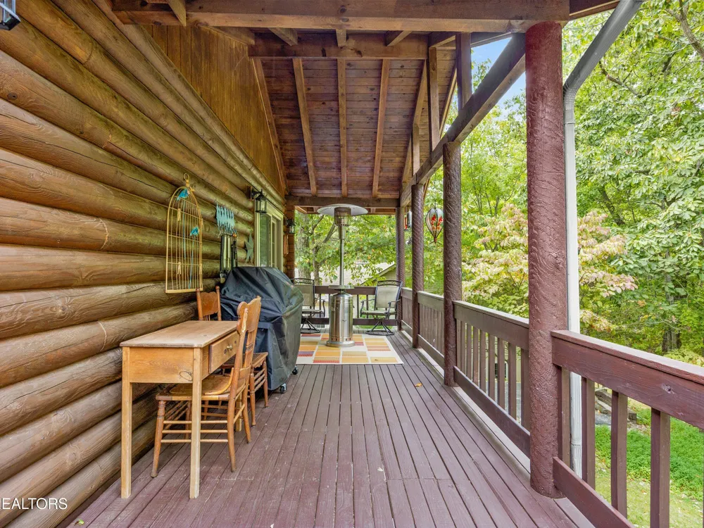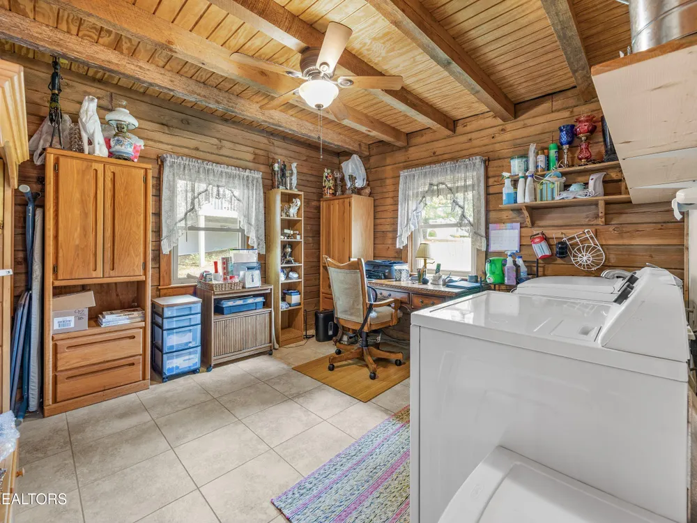 Check Out This Tennessee Dream!! A Charming Jim Barna log cabin home with a cozy, rustic appeal. It's full of light wooden walls on the interior and 2 large skylights in the family room offer additional natural light. A welcoming covered porch that extends across the front and a beautiful covered back porch that's an early morning coffee lover's dream! This 2 Bedroom + flex space on main level for office or additional bedroom (currently used as office/laundry room), 2 Bath home is nestled among tall trees, emphasizing its cozy woodland setting and boasts serenity. The basement is full of all your storage needs, no lack of space here! Main level laundry and a washer/dryer hookup in basement. It's a perfect mix of cabin retreat and homey comfort. It's a must see!