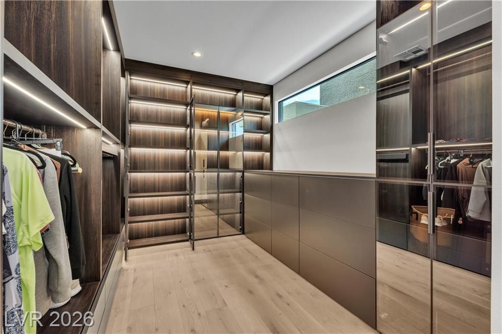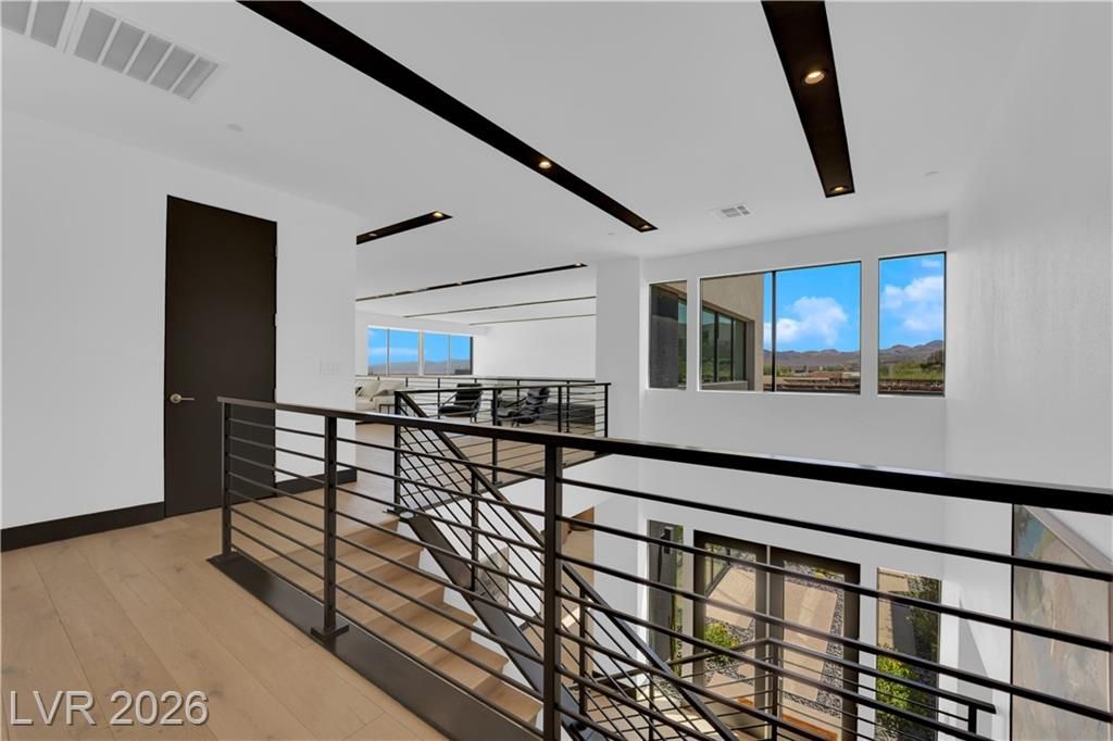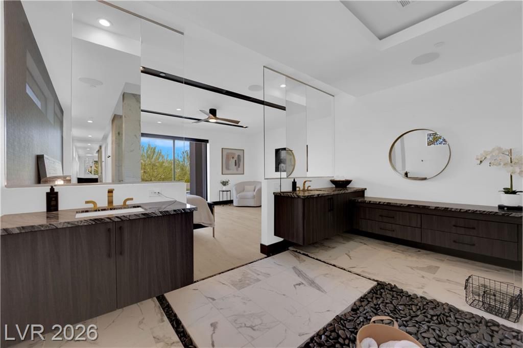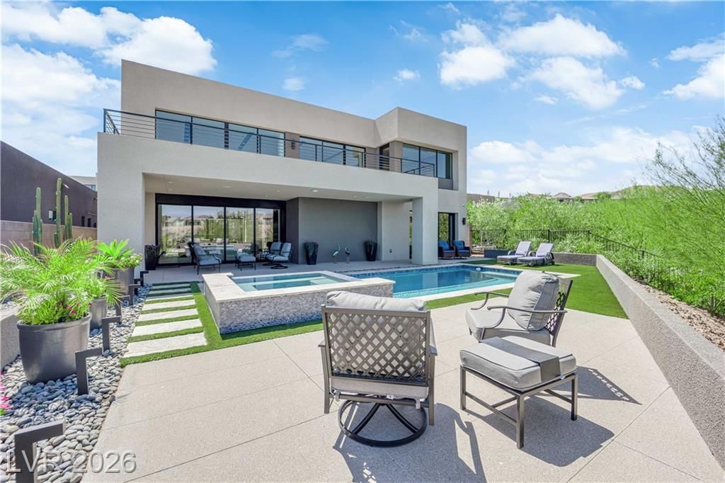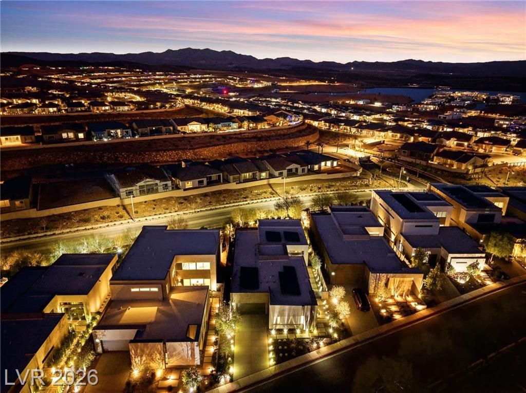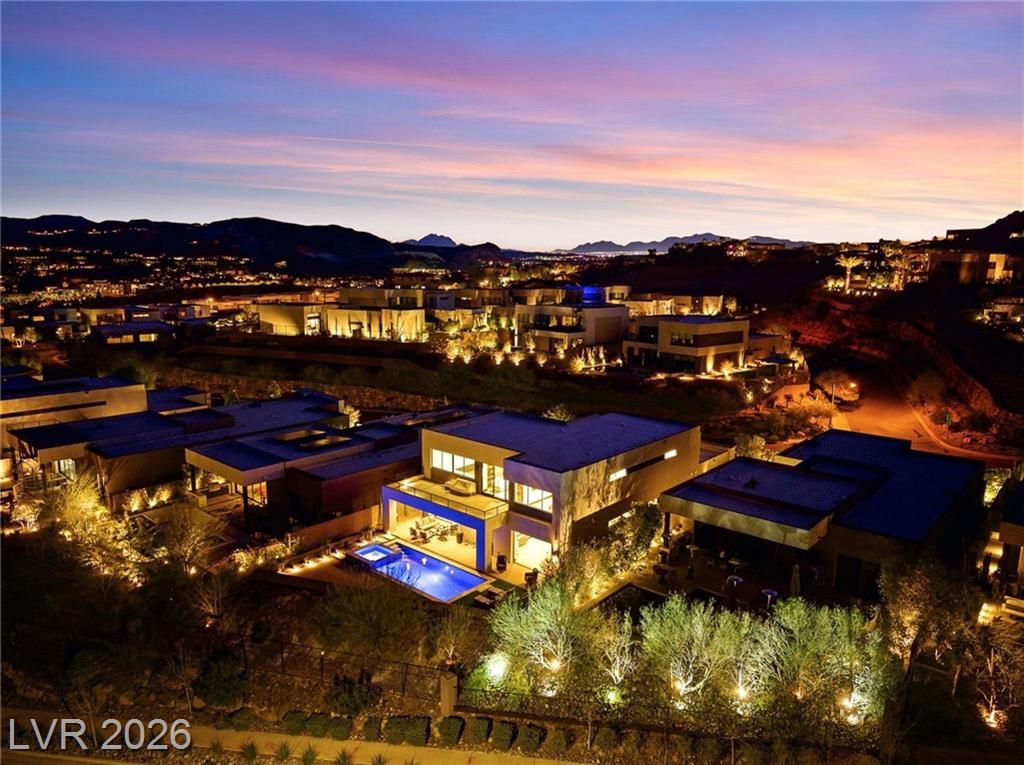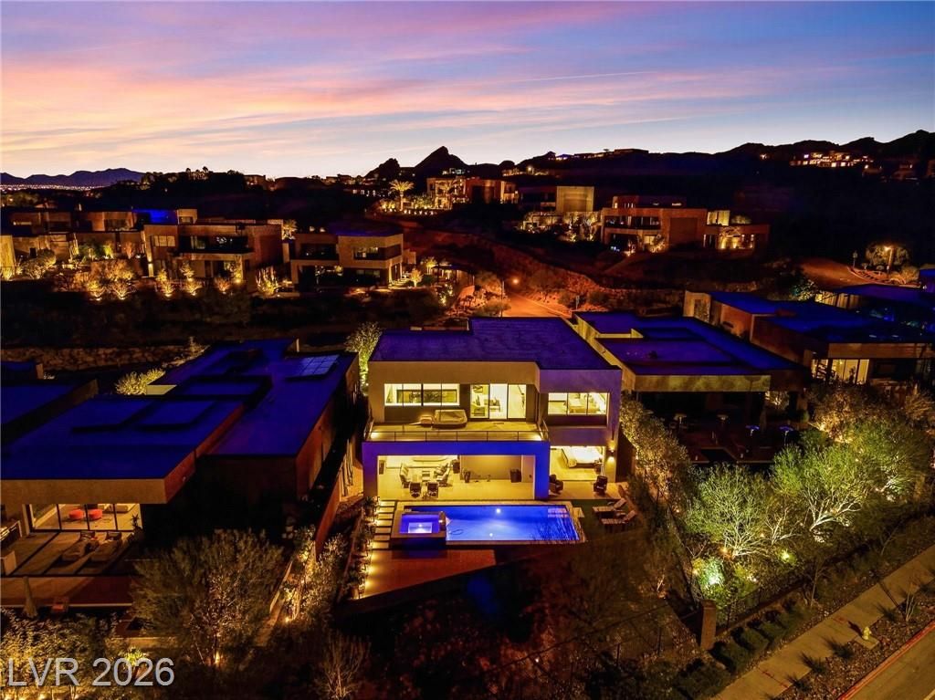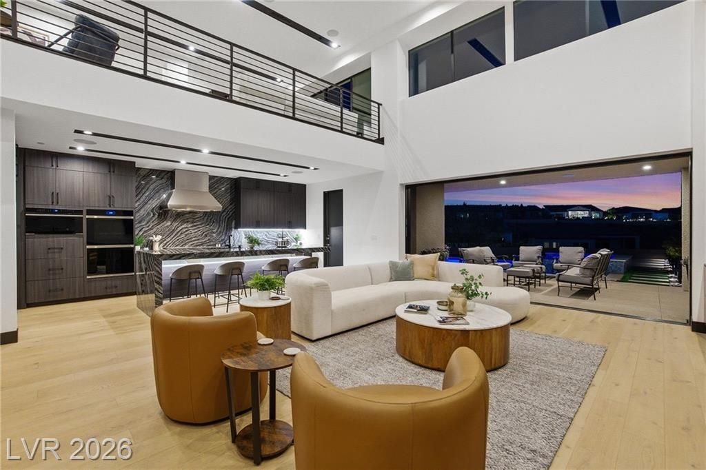WOW, compelling priced home, is a fully furnished, turnkey modern luxury home in Lake Las Vegas, Henderson, NV, offers resort-style living just minutes from The Village, golf, dining, and the lake. Expansive pocket doors create seamless indoor-outdoor living, opening to a private pool and spa. The layout features two bedrooms on the main level, including a primary suite with a spa-inspired bath, custom closet, and direct outdoor access. The chef’s kitchen offers marble countertops, custom cabinetry, Wolf & Sub-Zero appliances, and an oversized island. White oak flooring, designer built-ins, custom lighting, and modern architectural details throughout. Upstairs, a second primary suite includes a private balcony with mountain and lake views plus flexible space for a lounge, office, or media room. Exceptional value in Lake Las Vegas.