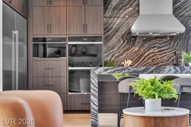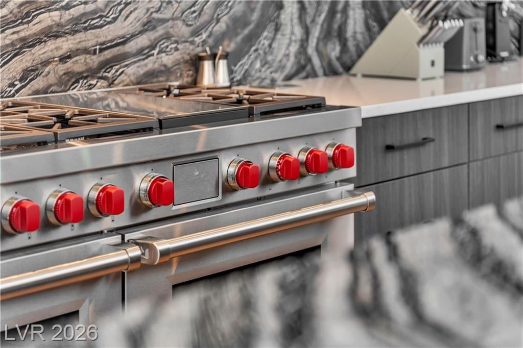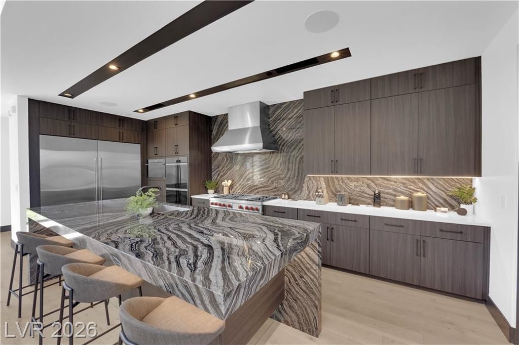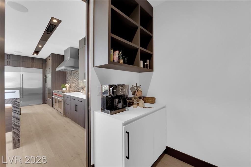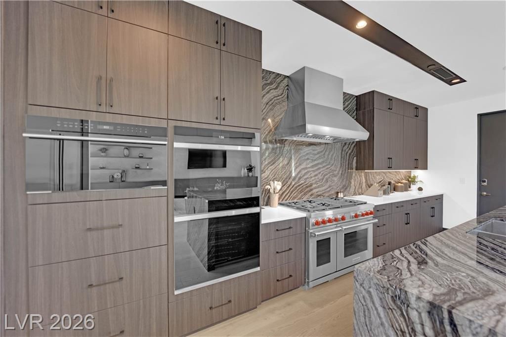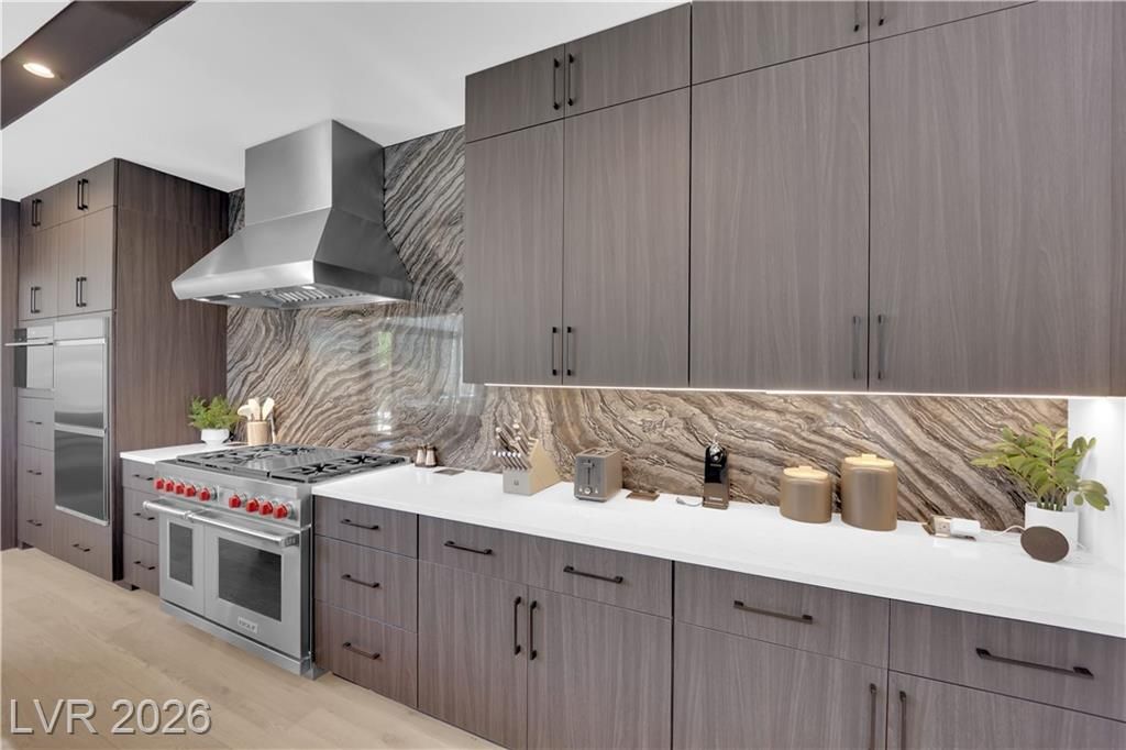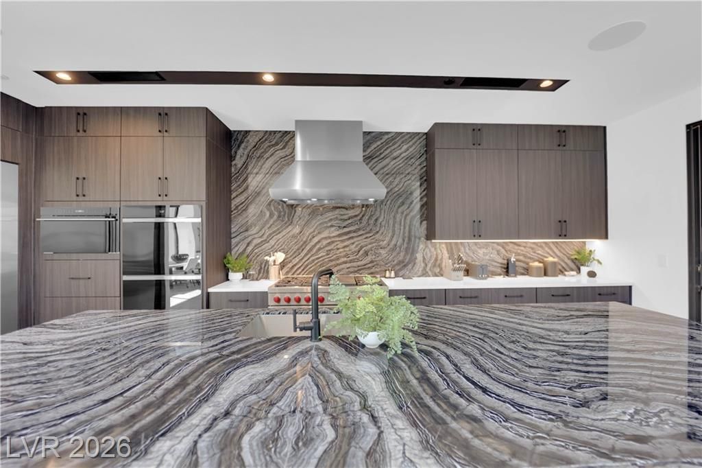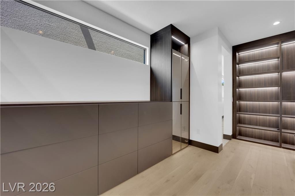 WOW, compelling priced home, is a fully furnished, turnkey modern luxury home in Lake Las Vegas, Henderson, NV, offers resort-style living just minutes from The Village, golf, dining, and the lake. Expansive pocket doors create seamless indoor-outdoor living, opening to a private pool and spa. The layout features two bedrooms on the main level, including a primary suite with a spa-inspired bath, custom closet, and direct outdoor access. The chef’s kitchen offers marble countertops, custom cabinetry, Wolf & Sub-Zero appliances, and an oversized island. White oak flooring, designer built-ins, custom lighting, and modern architectural details throughout. Upstairs, a second primary suite includes a private balcony with mountain and lake views plus flexible space for a lounge, office, or media room. Exceptional value in Lake Las Vegas.