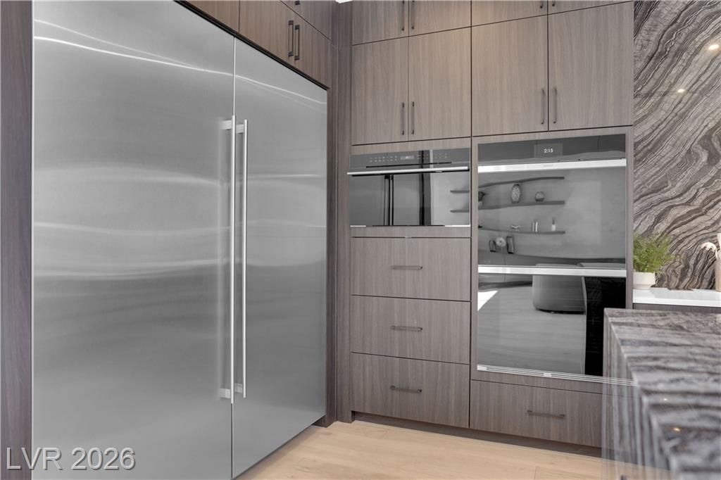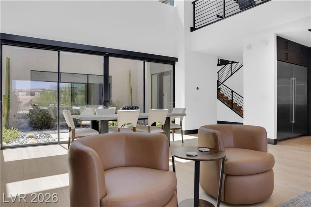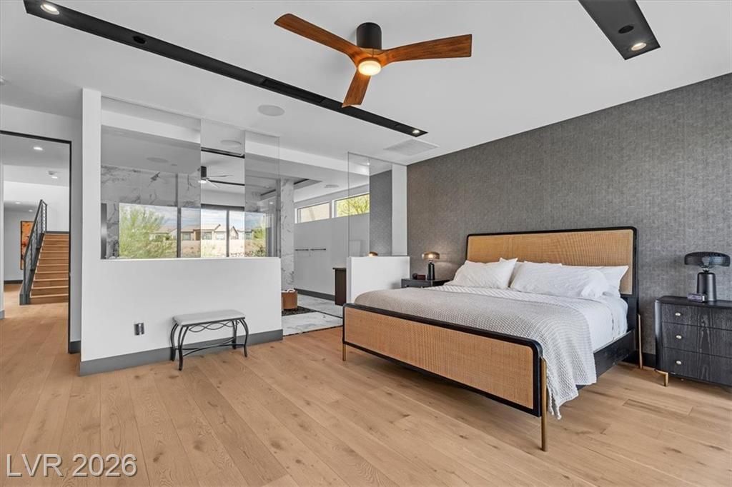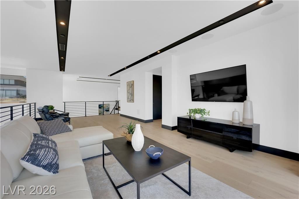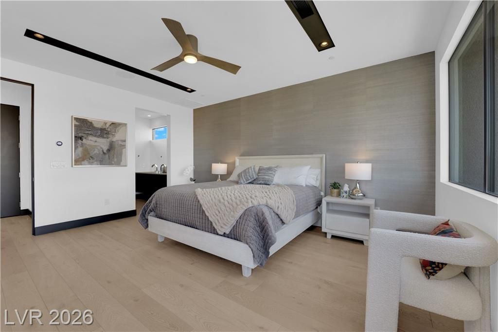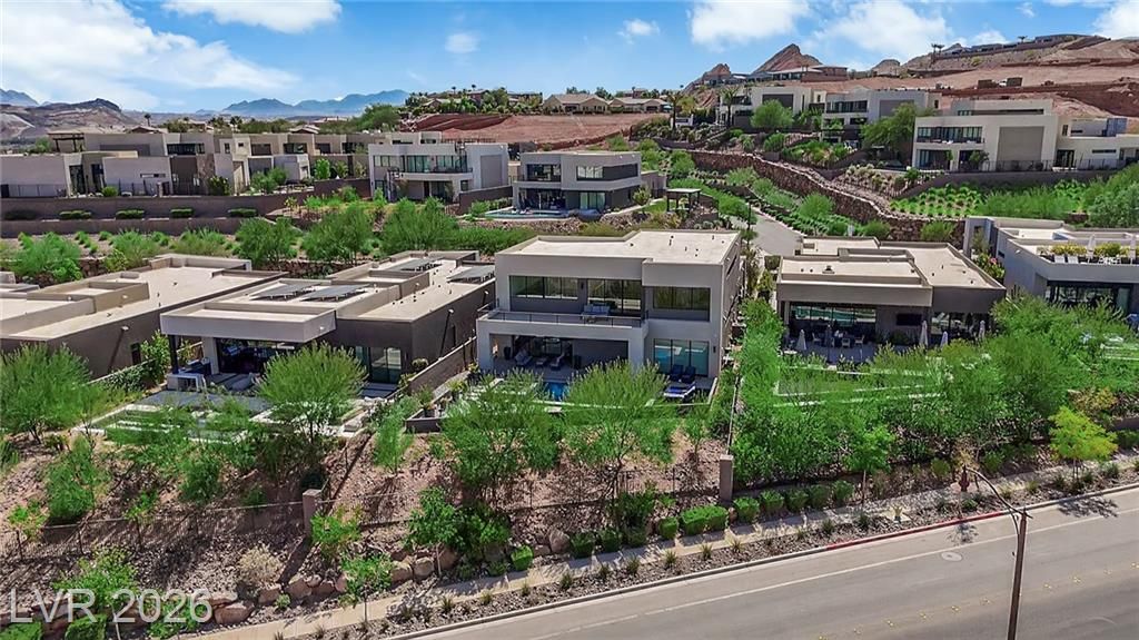Stunning, fully furnished, turn-key modern Blue Heron luxury home in Lake Las Vegas with exceptional indoor-outdoor living. Expansive pocket doors open to a resort-style pool and spa for seamless entertaining. Thoughtful layout includes two bedrooms on the main level, including a downstairs primary suite with spa-inspired bath, custom-designed closet, and direct access to the pool/outdoor living. Chef's kitchen features marble countertops, custom cabinetry, Wolf & Sub-Zero appliances, oversized island. White oak flooring throughout is complemented by designer built-ins, custom lighting, and sleek architectural details. Upstairs, a second primary suite offers a private balcony with mountain and lake views framed from the bed each morning, plus additional flex space ideal for a lounge, office, or media area. A true turnkey opportunity in one of Lake Las Vegas’ desirable communities—minutes to the Village, dining, golf, and the lake.