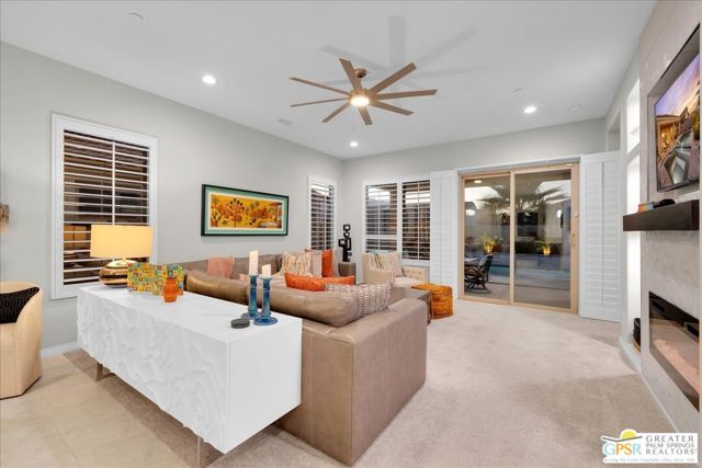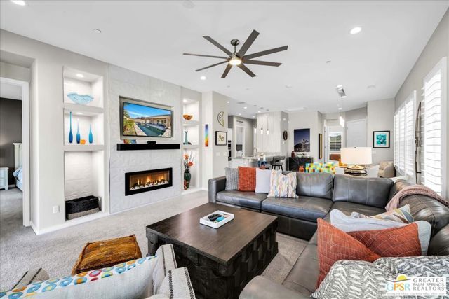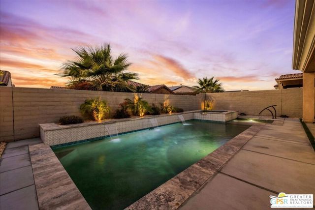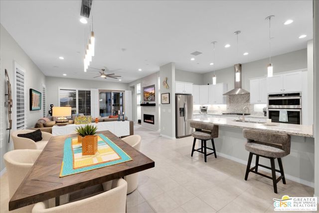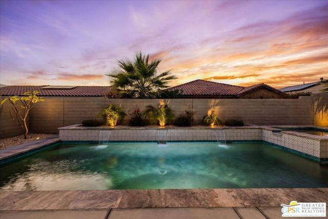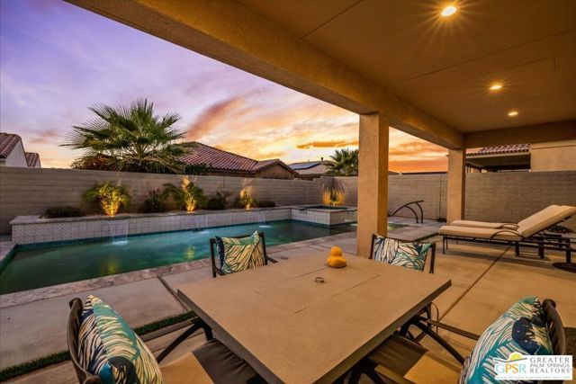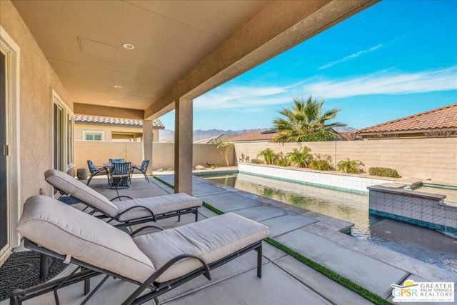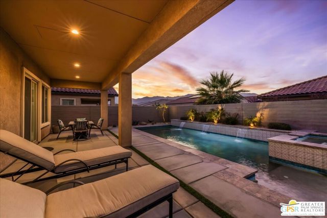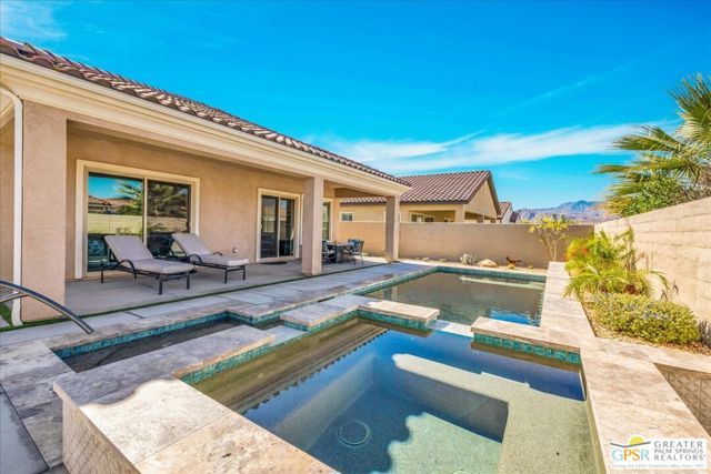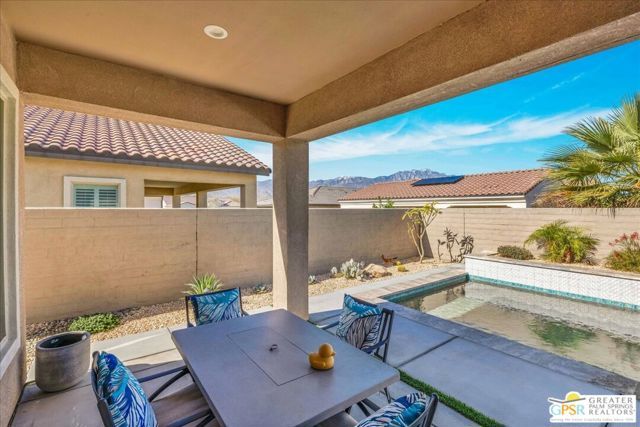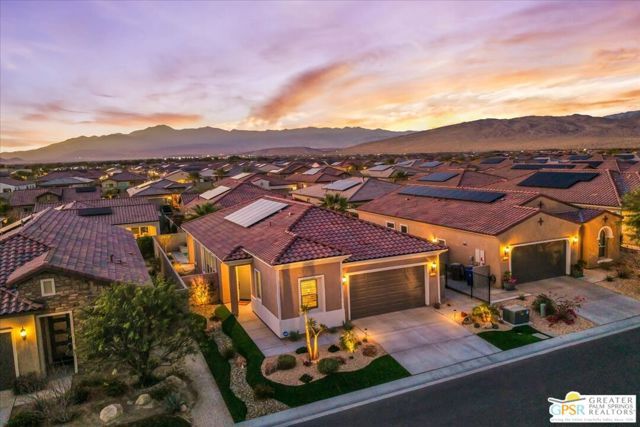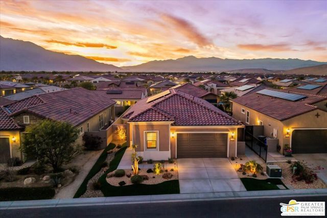 Exquisite Prairie-Style Retreat with OWNED SOLAR and Private POOL & SPA in Del Webb's Premier 55+ Community. Discover the pinnacle of resort-style living in this stunning PHASE 5 PLAN 1 GETAWAY, nestled within the prestigious gated community of Del Webb. Thoughtfully designed with elegance and comfort in mind, this sophisticated residence boasts an open-concept layout with two spacious bedrooms, two beautifully appointed baths, and an array of high-end upgrades. Step inside and be captivated by the seamless blend of style and functionality - custom designer paint, rich porcelain tile flooring, classic wood shutters, and stylish ceiling fans create an ambiance of timeless refinement. The gourmet kitchen, open to the great room, is a chef's delight, featuring luxurious granite countertops, sleek stainless-steel Whirlpool appliances, intricate custom tilework, and hand-selected pendant lighting illuminating the oversized island. The light-filled great room is the heart of the home, where expansive windows bathe the space in natural light, highlighting the custom fireplace and striking display niches with LED accent lighting. Retreat to the lavish primary suite, complete with oversized sliding doors, a spa-like ensuite bath featuring dual vanities, an expansive walk-in shower, and a custom-designed walk-in closet. The guest room, situated on the opposite side of the home, ensures privacy and convenience with easy access to the elegantly finished secondary bath. Step outside to your own private desert oasis, where a full-length covered patio invites year-round relaxation. Take in breathtaking mountain views while basking in the serenity of your Pebble Tec saltwater pool and spa, complete with a tanning shelf, natural stone surround, and tranquil waterfall features. Beyond your doorstep, experience the unparalleled amenities of Del Webb, including a state-of-the-art clubhouse, fitness center, tennis and pickleball courts, and an array of social and recreational activities. Note the HOA Fee now includes cable and internet package! *Furnishings available per inventory under a separate agreement.