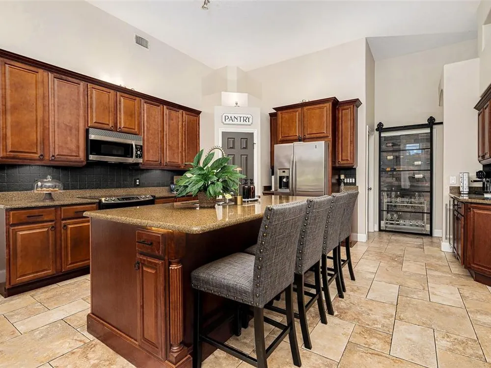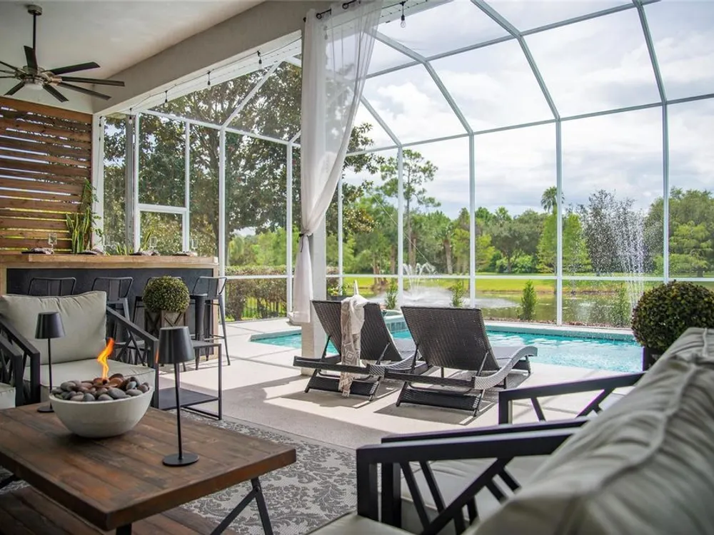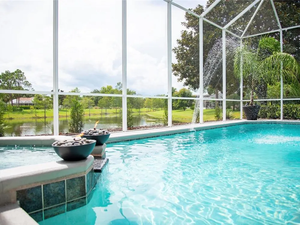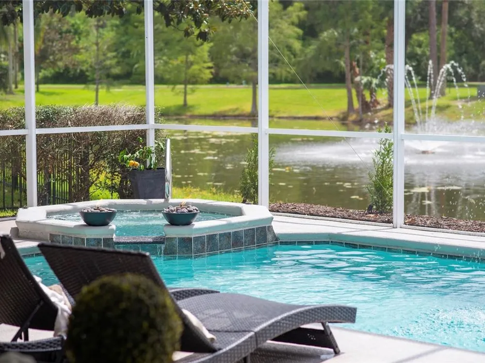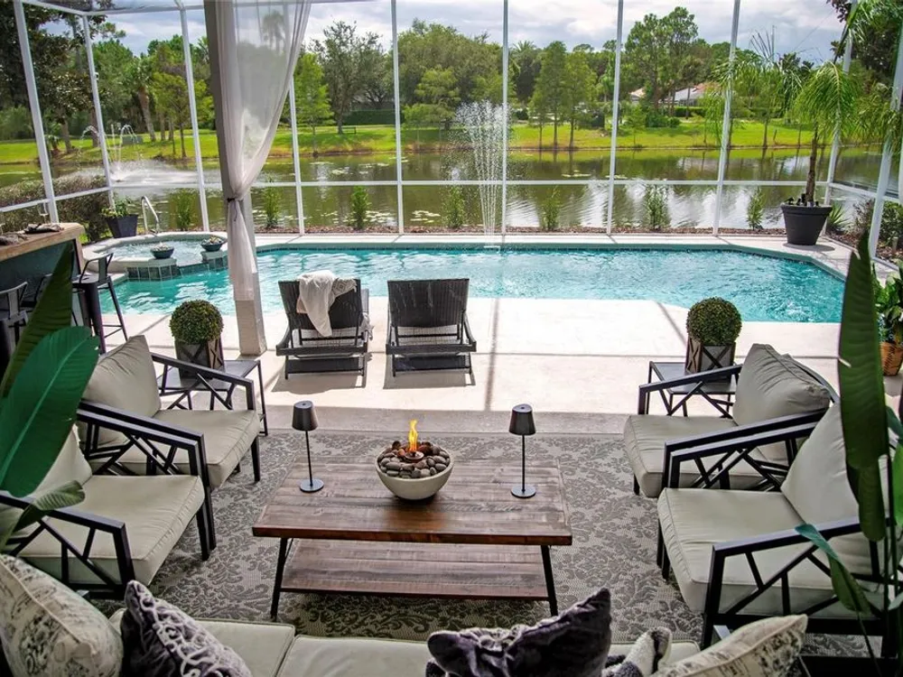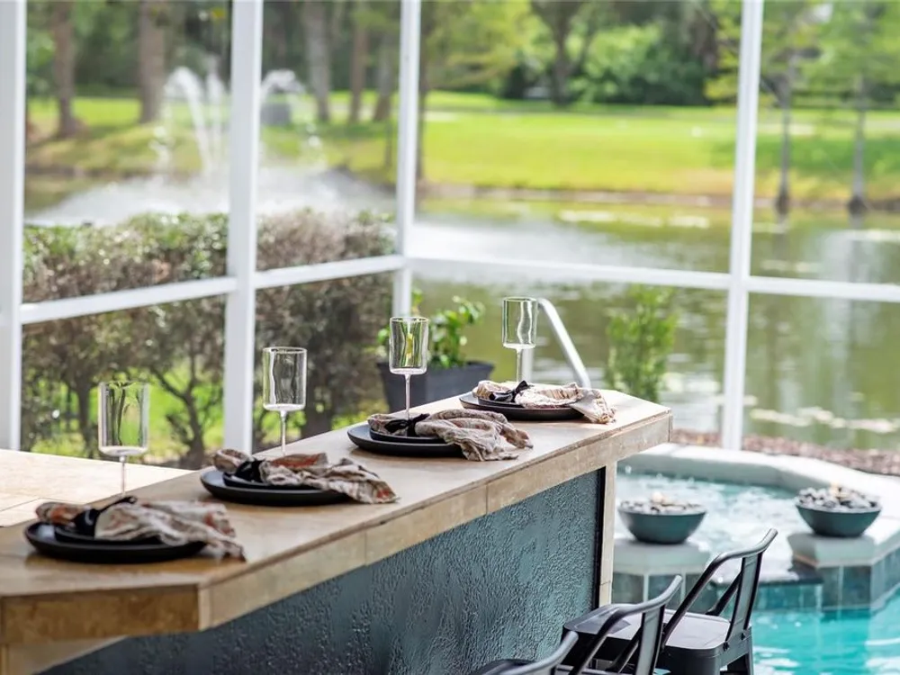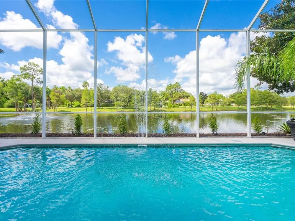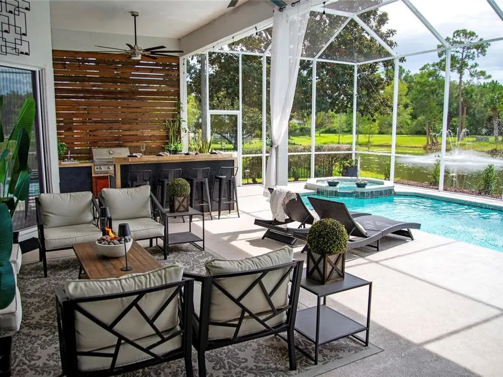 Welcome to 16 Circle Creek Way, a stunning 4-bedroom, 3-bath residence in Ormond Beach’s sought-after Breakaway Trails community. Crafted by ICI Homes, renowned for craftsmanship, this property blends timeless elegance with modern comforts in a setting surrounded by natural beauty. Overlooking a sparkling pond with a fountain and framed by oak and magnolia trees, the home invites a lifestyle where every detail is thoughtfully considered. As you arrive, you’re greeted by manicured landscaping and two front-entry water features that set a tranquil tone. The freshly painted exterior and modern lighting elevate curb appeal, while a new 2020 roof adds peace of mind. Through the elegant glass double doors, the journey begins. Inside, oversized windows draw your gaze across the formal sitting area to the pool and pond beyond. A dramatic wood globe chandelier anchors the entryway, while wainscoting, travertine tile, and walnut hardwood floors hint at thoughtful upgrades. From the formal areas, the heart of the home unfolds. The living room centers on a striking custom stone fireplace wall with oversized tile, a wood mantel, and a new electric insert. Expansive sliders open to the patio, flooding the room with light and framing views of the fountain-lit pond. The adjacent gourmet kitchen blends style and function: a large island, granite countertops, and wood cabinetry with a bold black backsplash create a timeless aesthetic. Under- and above-cabinet lighting add warmth, while a Bosch dishwasher (2023), dual-zone wine fridge (2022), and a custom wine closet with glass barn door make hosting effortless. A coffee bar completes the space—perfect for mornings at home. This four-bedroom, three-bath layout is thoughtfully split to enhance privacy and functionality. On one side, the primary suite pairs with a secondary bedroom—ideal as a nursery, guest room, or private office near the owner’s retreat. The primary suite opens to the pool with water views through sliding glass doors, creating a serene escape. A sunken tub, travertine walk-in shower, glass-block feature, and double vanity create a spa-like bath. On the opposite wing, two additional bedrooms add flexibility for guests, offices, or creative space. One bedroom features a clever “cloffice”—a built-in desk and tile-accent workspace—ideal for today’s lifestyle. The other is styled as an office, with a bold dark-washed accent wall and illuminated plant display. Baths and utility spaces show the same attention to detail. The guest bath offers a German schmear brick accent wall and modern fixtures; the laundry is fresh and functional with a new GE washer and dryer. The outdoor living space feels like a private resort. The pool, resurfaced and retiled in 2021, gleams, complemented by a Hayward heat/cool pump (2023) and spa heater (2021) for year-round comfort. A new color-changing pool light adds evening magic, reflecting off the pond and fountain beyond. Host gatherings with ease at the outdoor bar and built-in dining area, or enjoy casual evenings grilling on the JennAir BBQ. Oversized fans keep the patio comfortable, while a wood privacy wall and modern exterior lighting create both seclusion and ambiance. With oak and magnolia trees framing unobstructed water views, every sunset feels like a painting. Breakaway Trails itself offers an unparalleled lifestyle, complete with a 24-hour guarded gate, community pool, tennis and pickleball courts, playgrounds, and scenic walking and biking trails.